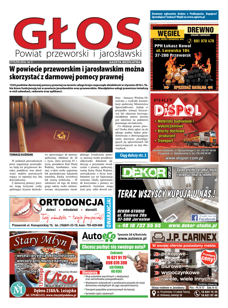 Darmowe ogłoszenia drobne z Podkarpacia. Kupujesz? Sprzedajesz? Szukasz? Wejdź na www.oglosto.pl REKLAMA ISSN 2450-4041 STYCZEŃ 2016 /nr 1/ W powiecie przeworskim i jarosławskim można skorzystać z darmowej pomocy prawnej 1524 punktów darmowej pomocy prawnej na terenie całego kraju rozpoczęło działalność w stycznia 2016 r. Takie biura funkcjonują też w powiecie jarosławskim oraz przeworskim. Nieodpłatne usługi prawnicze świadczą w nich adwokaci, radcowie oraz aplikanci. bisty – tłumaczy Wioletta Olszewska z wydziału komunikacji społecznej Ministerstwa Sprawiedliwości. Jednak w przypadku sytuacji kryzysowej lub zdarzenia losowego, nieodpłatna pomoc prawna jest udzielana na podstawie pisemnego oświadczenia. Co obejmuje pomoc prawna? Osoba, która zgłosi się do takiego punktu będzie poinformowana o obowiązującym stanie prawnym, przysługujących jej uprawnieniach lub spoczywających na niej obowiązkach. TOMASZ KUŹNIAR W punktach prowadzonych przez organizacje pozarządowe będą też przyjmować doradcy podatkowi oraz absolwenci studiów prawniczych mający co najmniej trzy lata doświadczenia. Z darmowej pomocy prawnej mogą korzystać osoby spełniające kryteria dochodoREKLAMA we uprawniające do pomocy społecznej, młodzież do 26 r. życia, starsi powyżej 65 r. życia, posiadacze Kart Dużej Rodziny, kombatanci, weterani, a także osoby zagrożone lub poszkodowane katastrofą naturalną, klęską żywiołową lub awarią techniczną. - W zależności od tego do której grupy należy osoba zainteresowana otrzymaniem nieod- płatnego świadczenia pomocy prawnej trzeba przedłożyć odpowiedni dokument np. decyzję o przyznaniu świadczenia z pomocy społecznej, ważną Kartę Dużej Rodziny, zaświadczenie o byciu kombatantem czy też legitymację weterana. Osoby uprawnione do korzystania z pomocy na podstawie kryterium mogą mieć przy sobie dowód oso- Ciąg dalszy str. 2 REKLAMA 2 www.oglosTO.pl [email protected] Styczeń 2016 POZIOMO 1 ukazanie swoich możliwości 2 do smarowania chleba 3 nadaje audycje 4 stałe miejsca pracy 5 turecka pieczeń z jagnięcia 6 symbol władzy królewskiej 7 grupa z guru 8 rośnie na łące 9 narkotyki, w slangu 10 brudas, niechluj, bałaganiarz 11 aktualnie, w tym momencie 12 ogłoszenie w prasie 13 lek na bóle brzucha 14 chowana w piasek 15 hazardowa gra karciana 16 tkanka tłuszczowa zwierząt 17 dopisek autora do tekstu 18 gąsienice lub kijanki 19 atrybut świętego Mikołaja 20 miejscowość i gmina we Francji, w regionie Poitou-Charentes 21 narzędzie do obsypywania ziemniaków 22 na zakupy PIONOWO 1 Zachodnie ze Szczecinem 2 ciepła do objęcia 3 budynki na zboże i siano 4 szubrawiec, łajza, gnida, drań 5 stopień oficerski w wojsku 6 gra hazardowa naszych dziadków 7 imię Streisand 8 czasem brzmi fałszywie 9 przestarzale o tańcu zza kó REKLAMA Oby był jeszcze lepszy… Statystycznie nasza rzeczywistość wygląda całkiem nieźle – to wniosek, jaki nasuwa mi się gdy przeglądam rozliczne podsumowania ubiegłego roku. Oczywiście te motoryzacyjne, bo pozostałe, w trosce o własne zdrowie, omijam szerokim łukiem. MIŁOSZ CIESZYŃSKI 10 „... do młodości” 11 ekskrementy 12 kłopot dla dwojga 13 działka 14 ma mniej nóg, niż wskazuje nazwa 15 napój chłodzący z białego wina 16 zamyka przejazd 17 port rybacki nad Bałtykiem 18 czynnik utleniający w f. do włosów W powiecie przeworskim i jarosławskim można skorzystać z darmowej pomocy prawnej c.d. Prawnik powinien wskazać sposób rozwiązania dotyczącego jej problemu prawnego, a jeśli zachodzi taka potrzeba to także pomóc stworzyć pismo (z wyłączeniem pism procesowych lub sądowo-administracyjnych). Oznacza to także pomoc w przygotowywaniu umów cywilno-prawnych np. najmu, sprzedaży czy testamentu. Uprawnieni będą mogli uzyskać informacje w zakresie: prawa pracy, przygotowania do rozpoczęcia działalności gospodarczej, prawa cywilnego, spraw karnych, spraw administracyjnych, ubezpieczenia społecznego, spraw rodzinnych. - Nieodpłatna pomoc prawna nie obejmuje spraw podatkowych związanych z prowadzeniem działalności gospodarczej z zakresu prawa celnego, dewizowego i handlowego – wyjaśnia Wioletta Olszewska. łk a Punkty darmowej pomocy prawnej dla mieszkańców powiatu przeworskiego i jarosławskiego mieszczą się w: • Zespole Szkół w Sieniawie, pon., śr., pt. godz. 13- 17, wto., czw. godz. 9- 13 • Powiatowym Centrum Pomocy Rodzinie w Przeworsku pon., śr., pt. godz. 13- 17, wto., czw. godz. 9- 13 • Zespole Szkół w Kańczudze pon., śr., pt. godz. 13- 17, wto., czw. godz. 9- 13 • Urzędzie Miejskim w Pruchniku pon., wt.: godz. 8- 12, śro. 8 – 12, czw., pt. godz. 8- 12 • Urzędzie Gminy w Chłopicach śr. godz. 8- 12, pt. 8 – 12 • Starostwie Powiatowym w Jarosławiu pon.- pt. 8- 12 • Urzędzie Gminy w Wiązownicy wt. godz. 8-12 • U. Miasta w Radymnie pon.-wt. godz. 8- 12, śr. godz. 11 – 15, czw. – pt. godz. 8- 12 • Urzędzie Gminy w Wiązownicy wt. godz. 8-12 • Urzędzie Gminy w Laszkach pon. godz. 8 – 12, czw. 8-12 Po pierwsze znów było bezpieczniej. Nie tak dawno dzieliłem się już z Państwem swoją radością z coraz lepszych statystyk wypadków na naszych drogach, więc nie będę się powtarzał. Jest coraz lepiej, każdy uważa, że to głównie jego zasługa i w pewnym stopniu każdy zapewne ma rację. Kupujemy coraz więcej. Chodzi oczywiście o nowe samochody. W ubiegłym roku zarejestrowaliśmy najwięcej samochodów od 2008 roku. Jest się z czego cieszyć? Pewnie tak, bo jeśli więcej jest nowych samochodów, to jest bezpieczniej. Czyli wracamy do punktu pierwszego. Jeśli stać nas na nowe samochody, to znaczy, że żyje nam się lepiej… i tu jest jeden haczyk. Jak podają specjaliści duży wzrost sprzedaży to między innymi skutek zmian podatkowych, dzięki którym firmy mogą odliczać część podatku VAT od każdego samochodu służbowego. Nie trzeba wi