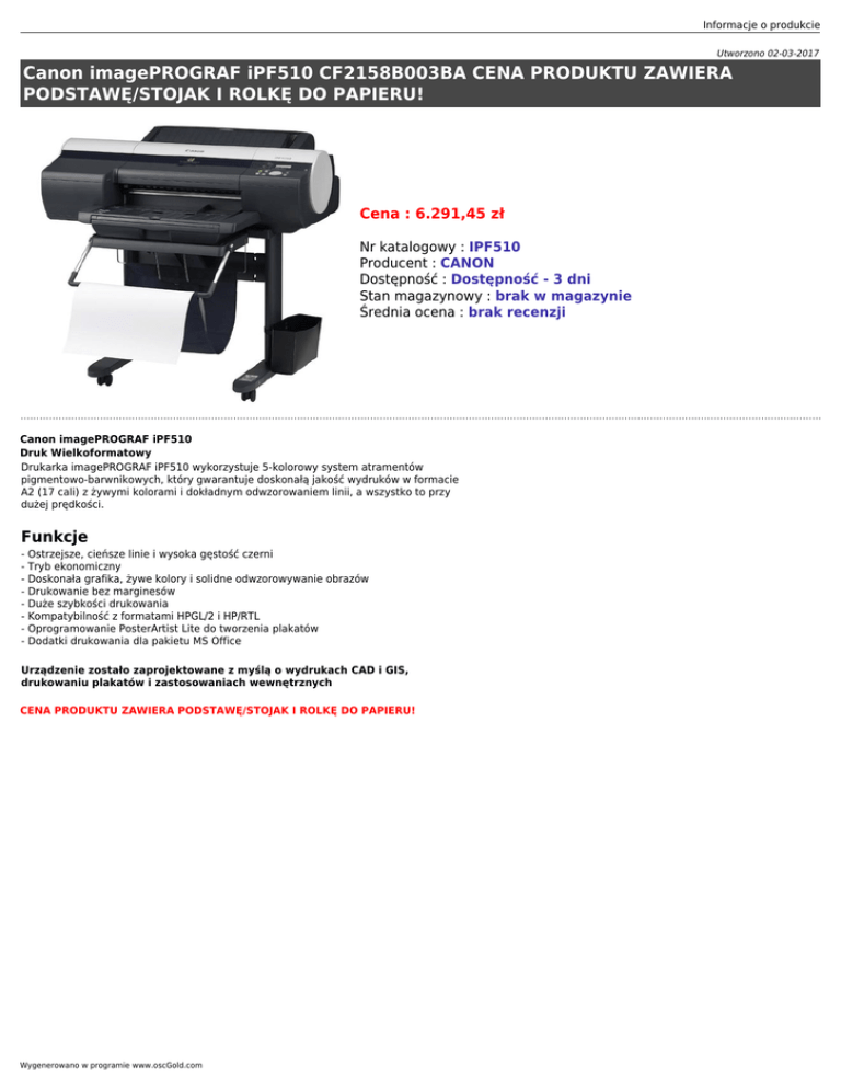 Informacje o produkcie Utworzono 02-03-2017 Canon imagePROGRAF iPF510 CF2158B003BA CENA PRODUKTU ZAWIERA PODSTAWĘ/STOJAK I ROLKĘ DO PAPIERU! Cena : 6.291,45 zł Nr katalogowy : IPF510 Producent : CANON Dostępność : Dostępność - 3 dni Stan magazynowy : brak w magazynie Średnia ocena : brak recenzji Canon imagePROGRAF iPF510 Druk Wielkoformatowy Drukarka imagePROGRAF iPF510 wykorzystuje 5-kolorowy system atramentów pigmentowo-barwnikowych, który gwarantuje doskonałą jakość wydruków w formacie A2 (17 cali) z żywymi kolorami i dokładnym odwzorowaniem linii, a wszystko to przy dużej prędkości. Funkcje - Ostrzejsze, cieńsze linie i wysoka gęstość czerni - Tryb ekonomiczny - Doskonała grafika, żywe kolory i solidne odwzorowywanie obrazów - Drukowanie bez marginesów - Duże szybkości drukowania - Kompatybilność z formatami HPGL/2 i HP/RTL - Oprogramowanie PosterArtist Lite do tworzenia plakatów - Dodatki drukowania dla pakietu MS Office Urządzenie zostało zaprojektowane z myślą o wydrukach CAD i GIS, drukowaniu plakatów i zastosowaniach wewnętrznych CENA PRODUKTU ZAWIERA PODSTAWĘ/STOJAK I ROLKĘ DO PAPIERU! Wygenerowano w programie www.oscGold.com PODSTAWOWE DANE TECHNICZNE Klasa 17 cali Typ atramentu Reaktywny atrament barwnikowy i pigmentowy: BK, MBK x 2, C, M, Y Maksymalna rozdzielczość druku 2400 x 1200 dpi montaż Montaż przez użytkownika Papier zwykły: 0:20 (roboczy) Prędkość drukowania Papier powlekany: 0:55 (standardowy) Błyszczący papier fotograficzny: 1:38 (standardowy) Podstawa drukarki Opcjonalna, typ montażu (montaż przez użytkownika) Jednostka główna: 819 (szer.) x 733 (głęb.) x 317(wys.) mm (tylko drukarka), waga: około 39 kg (drukarka, kaseta, taca odbiorcza, taca podawania ręcznego) Jednostka główna z automatyczną rolką: 819 (szer.) x 810 (głęb.) x 344 (wys.) mm; waga: około 43 kg Moduł podajnika (opcja): (drukarka, kaseta, taca odbiorcza, taca ręcznego podawania ręcznego z automatycznym Wymiary, masa modułem rolek podających) Jednostka główna z podstawką pod drukarkę: 819 (szer.) x 981 (głęb.) x 989 (wys.) mm; waga: około 58 kg (z automatycznym modułem rolek podających, bez materiałów eksploatacyjnych) Jednostka główna z paletą (spakowana): 960 (szer.) x 874 (głęb.) x 638 (wys.) mm; waga: około 57 kg Podstawa drukarki (spakowana): 1115 (szer.) x 864 (głęb.) x 237 (wys.) mm; waga: około 22 kg Zasilanie: AC, 100120 V (50/60Hz); AC, 220240 V (50/60Hz) Zużycie energii: podczas pracy: maks. 100 W Zasilanie Tryb oszczędzania energii: 100 V120 V: maks. 5 W (maks. 10 W po zamontowaniu IEEE1394); 220 V240 V: maks. 6 W (11 W po zamontowaniu IEEE1394) Wyłączone (gotowość): maks. 1 W Środowisko pracy Temperatura: 1530°C, wilgotność: 1080% (bez kondensacji) Poziom hałasu: podczas pracy: około 52 dB lub mniej (A), w trybie gotowości: około 35 dB lub mniej (A) Poziomy hałasu Moc akustyczna: 6,6 B Minimalna szerokość linii 0,02 mm (teoretycznie) Dokładność linii 0,1% lub mniej Pamięć 192 MB Język drukarki GARO, HP-GL/2, HP RTL Wyświetlacz panelu operatora LCD Język wyświetlacza LCD angielski amerykański, francuski, niemiecki, włoski, hiszpański Interfejs USB 2.0 Hi-Speed (wbudowany) Ethernet Wbudowana Standard 10base-T, 100base-TX Protokół IPX/SPX SNMP HTTP, TCP/IP, AppleTalk Gniazdo rozszerzenia 1 GŁOWICA DRUKUJĄCA Model PF-03 Typ Bubble-jet na żądanie Konfiguracja głowicy 6 kolorów zintegrowanych (1 na głowicę drukującą) Odstępy dysz 1200 dpi x 2 Objętość kropli 4 pl (na kolor) Wymiana głowicy Wymiana przez użytkownika ZBIORNIK Z ATRAMENTEM Model PFI-102 (MBK x 2, BK, C, M, Y) Pojemność Startowy atrament w zestawie: 90 ml, atrament w sprzedaży: 130 ml WYCINARKA Typ Wycinarka obrotowa Informacje o produkcie Papier z roli Arkusze Kaseta Taca podawania Przełącznik przebiegu papieru (rola/arkusz) Grubość nośnika Szerokość nośnika Minimalna długość nośnika Maksymalna długość nośnika Drukowanie bez obramowania Pojemność podajnika Przepisy Certyfikaty ekologiczne OBSŁUGA NOŚNIKÓW Jedna rolka, ładowanie z góry, odbiór z przodu Ładowanie z przodu, odbiór z przodu Automatyczne przełączanie z rolki do kasety i vice versa Papier zwykły i powlekany, papier techniczny, folia, papier fotograficzny, papier do wydruków próbnych, papier podświetlany, papier samoprzylepny, banery i znaki, materiały do wydruków artystycznych Rola papieru (szerokość): A3, A2, JIS, B4, 8 cali, 10 cali, 14 cali, 16 cali, 17 cali, 300 mm, A3+ (329 mm) Arkusze (kaseta): A4, A3, A3+, A2, B4, B3, Letter (8.5 x 11 cali), Legal (8.5 x 14 cali), 11 x 17 cali, 13 x 19 cali, 17 x 22 cale, 12 x 18 cali, 14 x 17 cali, 12 x 16 cali, 10 x 12 cali, 10 x 15 cali, 8 x 10 cali, 16 x 20 cali (rozmiar US Photo), 300 x 900 mm 13 x 22 cale Arkusze (przedmi podajnik ręczny): A2, 17 x 22 cale, 13 x 22 cale Rola: 0,070,8 mm Kaseta: 0,080,3 mm Podawanie ręczne z góry: 0,070,8 mm Podawanie ręczne z przodu: 0,5-1,5 mm Rola: 203432 mm Kaseta: 203432 mm Podawanie ręczne z góry: 203432 mm Podawanie ręczne z przodu: 203-432 mm Rola: 203 mm Kaseta: 279 mm Podawanie ręczne z góry: 279 mm Podawanie ręczne z przodu: 520 mm Rola: 18 m (w zależności od systemu operacyjnego i aplikacji) Kaseta: 594 mm Podawanie ręczne z góry: 610 mm (1,6 m, jeżeli zamontowany jest automatyczny moduł rolek podających) Podawanie ręczne z przodu: 914 mm Typ nośnika: gruby papier powlekany, papier Premium Matte, błyszczący papier fotograficzny, półbłyszczący papier fotograficzny, matowy papier powlekany Extra Matt, papier Opaque, matowy papier powlekany 140 g, papier fotograficzny Photo Realistic 210 g, papier błyszczący Instant Dry Glossy 200 g, papier Instant Dry Satin 200 g, błyszczący papier fotograficzny High Glossy 250 g, papier fotograficzny Satin 240 g, papier fotograficzny Semi Matt 250 g, papier fotograficzny Pearl 260 g, papier High Resolution Barrier Szerokość nośnika: 10