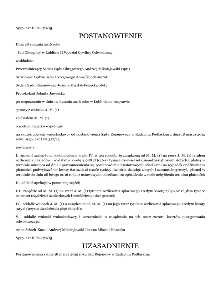 Sygn. akt II Ca 478/15 POSTANOWIENIE Dnia 28 stycznia 2016 roku Sąd Okręgowy w Lublinie II Wydział Cywilny Odwoławczy w składzie: Przewodniczący Sędzia Sądu Okręgowego Andrzej Mikołajewski (spr.) Sędziowie: Sędzia Sądu Okręgowego Anna Ścioch-Kozak Sędzia Sądu Rejonowego Joanna Misztal-Konecka (del.) Protokolant Jolanta Jaworska po rozpoznaniu w dniu 14 stycznia 2016 roku w Lublinie na rozprawie sprawy z wniosku J. M. (1) z udziałem M. M. (1) o podział majątku wspólnego na skutek apelacji wnioskodawcy od postanowienia Sądu Rejonowego w Radzyniu Podlaskim z dnia 18 marca 2015 roku, sygn. akt I Ns 357/13 postanawia: I. zmienić zaskarżone postanowienie w pkt IV. w ten sposób, że zasądzoną od M. M. (1) na rzecz J. M. (1) tytułem rozliczenia nakładów i wydatków kwotę 4.988 zł (cztery tysiące dziewięćset osiemdziesiąt osiem złotych), płatną w terminie miesiąca od dnia uprawomocnienia się postanowienia z ustawowymi odsetkami na wypadek opóźnienia w płatności, podwyższyć do kwoty 6.210,16 zł (sześć tysięcy dwieście dziesięć złotych i szesnaście groszy), płatnej w terminie do dnia 28 lutego 2016 roku, z ustawowymi odsetkami za opóźnienie w razie uchybienia terminu płatności; II. oddalić apelację w pozostałej części; III. zasądzić od M. M. (1) na rzecz J. M. (1) tytułem rozliczenia spłaconego kredytu kwotę 2.836,62 zł (dwa tysiące osiemset trzydzieści sześć złotych i sześćdziesiąt dwa grosze); IV. oddalić wniosek J. M. (1) o zasądzenie od M. M. (1) na jego rzecz tytułem rozliczenia spłaconego kredytu kwoty 325 zł (trzysta dwadzieścia pięć złotych); V. oddalić wnioski wnioskodawcy i uczestniczki o zasądzenie na ich rzecz zwrotu kosztów postępowania odwoławczego. Anna Ścioch-Kozak Andrzej Mikołajewski Joanna Misztal-Konecka Sygn. akt II Ca 478/15 UZASADNIENIE Postanowieniem z dnia 18 marca 2015 roku Sąd Rejonowy w Radzyniu Podlaskim: I. ustalił, że w skład majątku wspólnego wnioskodawcy J. M. (1) i uczestniczki M. M. (1) wchodzą: 1. lodówka wartości 450 zł, 2. kuchenka wartości 100 zł, 3. telewizor wartości 150 zł, 4. dywan wartości 50 zł, 5. podkaszarka wartości 50 zł, 6. mikrofalówka wartości 100 zł, 7. opiekacz wartości 50 zł, 8. łóżko z materacem wartości 700 zł, 9. 2 szafki nocne łącznej wartości 250 zł, 10. laptop wartości 450 zł, 11. odkurzacz wartości 50 zł, 12. waga łazienkowa wartości 30 zł, 13. spawarka wartości 450 zł, 14. 3 wiertarki wartości łącznej 400 zł, 15. 2 fleksy wartości łącznej 100 zł, 16. butla gazowa wartości 50 zł, 17. odkurzacz samochodowy wartości 50 zł, 18. kosiarka wartości 400 zł, 19. meble ogrodowe wartości 350 zł, 20. rower wartości 150 zł, 21. bagażnik samochodowy wartości 350 zł, 22. antena samochodowa do odbioru tv satelitarnej wartości 50 zł, 23. maszynka do mielenia mięsa wartości 100 zł, 24. sztućce wartości 30 zł, 25. meble wypoczynkowe wartości 400 zł, 26. drukarka wartości 80 zł, 27. mop parowy wartości 50 zł, 28. żelazko wartości 50 zł, 29. pralka wartości 150 zł, 30. szafka łazienkowa wartości 100 zł, 31. pościel wartości 50 zł, 32. łóżko do masażu wartości 200 zł, 33. komplet kluczy wartości 50 zł, 34. zmywarka wartości 400 zł, 35. nieruchomość gruntowa położona w miejscowości P., oznaczona jako działka nr (...) o powierzchni 0,08013 ha, dla której w Sądzie Rejonowym w Radzyniu Podlaskim prowadzona jest księga wieczysta nr (...), zabudowana domem mieszkalnym wartości 364000 zł, II. dokonał podziału majątku wspólnego wnioskodawcy J. M. (1) i M. M. (1) w ten sposób, że: a) opisane wyżej w pkt I. l, 6, 7, 8, 9, 10, 11, 12, 13, 14, 15, 16, 17, 18, 19, 20, 21, 22, 34 składniki majątku wspólnego przyznał wnioskodawcy J. M. (1), b) opisane wyżej w pkt I. 2, 3, 4, 5, 23, 24, 25, 26, 27, 28, 29, 30, 31, 32, 33 składniki majątku wspólnego przyznał uczestniczce postępowania M. M. (1), c) zarządził sprzedaż nieruchomości opisanej w pkt I. 35 stosownie do przepisów Kodeksu postępowania cywilnego i określił, że suma uzyskana z jej sprzedaży, po pomniejszeniu o nieuiszczone koszty egzekucyjne należne komornikowi sądowemu oraz po zwróceniu poniesionych przez wnioskodawcę i uczestniczkę postępowania kosztów egzekucyjnych, będzie podlegała podziałowi po ½ części między wnioskodawcę i uczestniczkę; III. zasądził od wnioskodawcy J. M. (1) na rzecz uczestniczki M. M. (1) kwotę 1560 zł tytułem dopłaty, płatną w terminie l miesiąca od uprawomocnienia się niniejszego postanowienia, z ustawowymi odsetkami na wypadek opóźnienia w płatności; IV. zasądził od uczestniczki M. M. (1) na rzecz wnioskodawcy J. M. (1) kwotę 4988 zł tytułem rozliczenia nakładów wnioskodawcy i uczestniczki na majątek wspólny, płatną w terminie l miesiąca od uprawomocnienia się niniejszego postanowienia, z ustawowymi odsetkami na wypadek opóźnienia w płatności; V. nakazał wnioskodawcy i uczestniczce wzajemne wydanie przyznanych im ruchomości; VI. obciążył wnioskodawcę i uczestniczkę kosztami postępowania stosownie do ich udziału w sprawie; VII. nieuiszczoną przez M. M. (1) część kosztów opinii biegłego w kwocie 940 zł przejął na Skarbu Państwa; VIII. nakazał ściągnąć od uczestniczki M. M. (1) na rzecz Skarbu Państwa – kasa tut. Sądu kwotę 500 zł tytułem częściowych kosztów opinii biegłego. Sąd Rejonowy ustalił następujący stan faktyczny: Wnioskodawca J. M. (1) i uczestniczka M. M. (1) zawarli związek małżeński w dniu 23 lutego 1995 roku. Nie zawierali umów majątkowych małżeńskich. Małżeństwo stron zostało rozwiązane przez rozwód wyrokiem Sądu Okręgowego w Lublinie z dnia 15 października 2012 roku, sygn. akt III C 531/12, który uprawomocnił się w dniu 6 listopada 2012 roku. W czasie trwania wspólności majątkowej, w dniu 13 maja 1998 roku strony nabyły nieruchomość poło