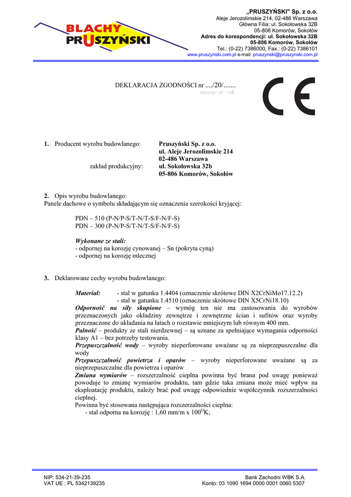 „PRUSZYŃSKI" Sp. z o.o. Aleje Jerozolimskie 214, 02-486 Warszawa Główna Filia: ul. Sokołowska 32B 05-806 Komorów, Sokołów Adres do korespondencji: ul. Sokołowska 32B 05-806 Komorów, Sokołów Tel.: (0-22) 7386000, Fax.: (0-22) 7386101 www.pruszynski.com.pl e-mail: [email protected] DEKLARACJA ZGODNOŚCI nr ..../20/....... miesiąc/ nr / rok 1. Producent wyrobu budowlanego: zakład produkcyjny: Pruszyński Sp. z o.o. ul. Aleje Jerozolimskie 214 02-486 Warszawa ul. Sokołowska 32b 05-806 Komorów, Sokołów 2. Opis wyrobu budowlanego: Panele dachowe o symbolu składającym się oznaczenia szerokości kryjącej: PDN – 510 (P-N/P-S/T-N/T-S/F-N/F-S) PDN – 300 (P-N/P-S/T-N/T-S/F-N/F-S) Wykonane ze stali: - odpornej na korozję cynowanej – Sn (pokryta cyną) - odpornej na korozję mlecznej 3. Deklarowane cechy wyrobu budowlanego: Materiał: - stal w gatunku 1.4404 (oznaczenie skrótowe DIN X2CrNiMo17.12.2) - stal w gatunku 1.4510 (oznaczenie skrótowe DIN X5CrNi18.10) Odporność na siły skupione – wymóg ten nie ma zastosowania do wyrobów przeznaczonych jako okładziny zewnętrze i zewnętrzne ścian i sufitów oraz wyroby przeznaczone do układania na łatach o rozstawie mniejszym lub równym 400 mm. Palność – produkty ze stali nierdzewnej – są uznane za spełniające wymagania odporności klasy A1 – bez potrzeby testowania. Przepuszczalność wody – wyroby nieperforowane uważane są za nieprzepuszczalne dla wody Przepuszczalność powietrza i oparów – wyroby nieperforowane uważane są za nieprzepuszczalne dla powietrza i oparów Zmiana wymiarów – rozszerzalność cieplna powinna być brana pod uwagę ponieważ powoduje to zmianę wymiarów produktu, tam gdzie taka zmiana może mieć wpływ na eksploatację produktu, należy brać pod uwagę odpowiednie współczynnik rozszerzalności cieplnej. Powinna być stosowana następująca rozszerzalności cieplna: - stal odporna na korozję : 1,60 mm/m x 100OK; NIP: 534-21-39-235 VAT UE : PL 5342139235 Bank Zachodni WBK S.A. Konto: 03 1090 1694 0000 0001 0060 5307 „PRUSZYŃSKI" Sp. z o.o. Aleje Jerozolimskie 214, 02-486 Warszawa Główna Filia: ul. Sokołowska 32B 05-806 Komorów, Sokołów Adres do korespondencji: ul. Sokołowska 32B 05-806 Komorów, Sokołów Tel.: (0-22) 7386000, Fax.: (0-22) 7386101 www.pruszynski.com.pl e-mail: [email protected] 4. Przeznaczenie i zakres stosowania: Panele wymienione w pkt. 2 niniejszej deklaracji mogą być stosowane do pokryć dachów o pochyleniu nie mniejszym niż 8o (14%) w budynkach zlokalizowanych w środowisku o korozyjności C5-I w czasie powyżej 15 lat (okres trwałości „długi”), zgodnie z PN-EN ISO 12944-6. Zastosowanie i sposób wykonania pokryć z powyższych paneli powinien być zgodne z projektami technicznymi budynków, opracowanymi z uwzględnieniem obowiązujących norm i przepisów techniczno-budowlanych, postanowień przedmiotowej normy PN-EN 14782 oraz zaleceń montażowych producenta. 5. Specyfikacja techniczna: PN-EN 14782:2008 Deklaruję z pełną odpowiedzialnością, że wyrób budowlany jest zgodny ze specyfikacją techniczną w pkt 5. Sokołów, ---------------------------------------(miejsce i data wystawienia) NIP: 534-21-39-235 VAT UE : PL 5342139235 --------------------------------------------------------------(imię, nazwisko i podpis osoby upoważnionej) Bank Zachodni WBK S.A. Konto: 03 1090 1694 0000 0001 0060 5307