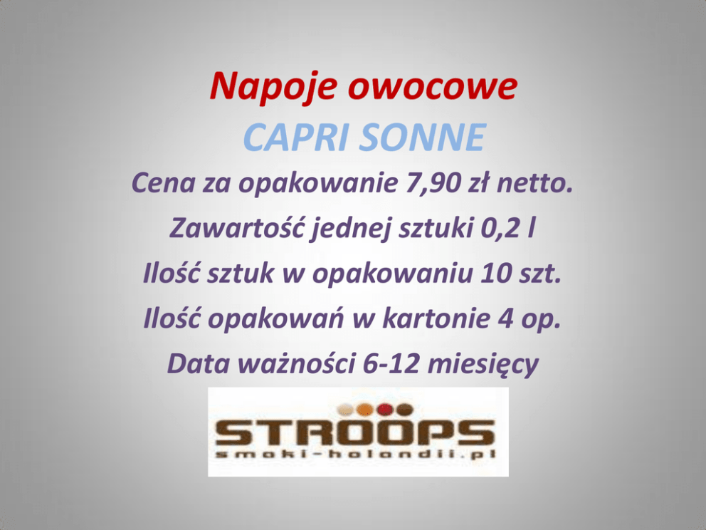 Napoje owocowe CAPRI SONNE Cena za opakowanie 7,90 zł netto. Zawartość jednej sztuki 0,2 l Ilość sztuk w opakowaniu 10 szt. Ilość opakowao w kartonie 4 op. Data ważności 6-12 miesięcy Podane ceny netto + vat 5 % (za wyjątkiem cola mix 23%) cola mix cena netto 7 zł opakowanie Termin realizacji 24h od momentu zamówienia. Capri SONNE to soki z najlepszych dojrzewających w słoocu wyselekcjonowanych owoców. Capri SONNE to wyjątkowy smak dla każdego i wszędzie. Idealne opakowanie dla aktywnych dzieci łatwe do otwarcia. Napoje Capri SONNE są wytwarzane z naturalnych soków owocowych i wody źródlanej. Soki dostępne są w 6 smakach Orange, Multivitamina, Safari Fruits, Jacks Fruits, jabłko, cola mix Soki przez nas oferowane są w torebkach 200ml wraz z załączoną słomką.