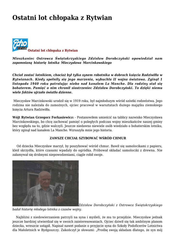 Ostatni lot chłopaka z Rytwian Ostatni lot chłopaka z Rytwian Mieszkaniec Ostrowca Świętokrzyskiego Zdzisław Dorobczyński opowiedział nam zapomnianą historię lotnika Mieczysława Marcinkowskiego Chciał zostać lotnikiem, chociaż był tylko synem robotnika w dobrach księcia Radziwiłła w Rytwianach. Kiedy spełniły się jego marzenia, wybuchła II wojna światowa. Zginął 1 listopada 1940 roku patrolując niebo nad kanałem La Manche. Dla rodziny stał się bohaterem. Pamięć o nim chronił siostrzeniec Zdzisław Dorobczyński. To dzięki niemu wiele faktów ujrzało światło dzienne. Mieczysław Marcinkowski urodził się w 1919 roku, był najmłodszym wśród szóstki rodzeństwa. Jego rodzina nie należała do zamożnych, ojciec pracował w warsztatach dużego majątku ziemskiego księcia Artura Radziwiłła. Wójt Rytwian Grzegorz Forkasiewicz: - Postanowiłem umieścić na tablicy nazwisko Mieczysława Marcinkowskiego, bo chcę zachować pamięć o poległych podczas wojny mieszkańców naszej gminy bez względu na to, gdzie walczyli. Jeszcze niedawno niewiele osób wiedziało o bohaterskim lotniku, który zginął nad kanałem La Manche. Wzruszyła mnie jego historia. ZAWSZE CHCIAŁ SZYBOWAĆ WŚRÓD CHMUR Od dziecka Mieczysław marzył, by poszybować wśród chmur. Bawił się samolocikami z papieru, kleił skrzydła, które czasami wpadały do ogródka. Próbował składać samolociki z drewna. Nie załamywał się drobnymi niepowodzeniami, ciągle robił swoje. Zdzisław Dorobczyński z Ostrowca Świętokrzyskiego badał historię młodego lotnika z czasów wojny. Najbliżsi z niedowierzaniem patrzyli na syna i myśleli, że mu to przejdzie. Mieczysław jednak jeszcze bardziej utwierdzał się w swoich zainteresowaniach. Ojciec dziwił się tak ambitnym planom dziecka, wreszcie ustąpił. Napisał nawet podanie o przyjęcie syna do Szkoły Podoficerów Lotnictwa dla Małoletnich w Bydgoszczy. Zakończył je słowami: „Prośbę swoją składam dlatego, że syn mój szalenie się interesuje dziedziną lotniczą i jej się chce poświęcić". TRAGICZNA ODYSEJA WOJENNA Badania lekarskie wypadły pomyślnie i Mieczysław zaczął naukę, najpierw w Bydgoszczy, potem Świeciu, Krośnie. 3-letnią szkołę ukończył w czerwcu 1939 roku i jak najszybciej chciał rozpocząć podniebne loty. Przed rozpoczęciem wojny wpadł jeszcze na krótko do rodzinnego domu. Ucałował matkę, ojca, rodzeństwo. Najbliżsi nie przypuszczali, że widzą go po raz ostatni. O jego dalszych losach rodzina dowiadywała się z listów, które przysyłał z Francji. Zapewne ze względu na cenzurę nie mógł szczegółowo opisywać, gdzie się znajduje i co robi. Potem urwała się korespondencja. Dopiero w listopadzie 1946 roku matka otrzymała wiadomość z Biura Kuratora Mas Spadkowych w Londynie, które powiadamiało, że „syn pani sierżant Mieczysław Marcinkowski zginął śmiercią lotnika w akcji bojowej w dniu 1 listopada 1940 roku." Rodzina otrzymała depozyt zawierający przedmioty pamiątkowe po synie. Wśród nich był paszport wydany przez Konsulat Polski w Bukareszcie 28 września 1939 roku z datą ważności do 23 września 1940 r. Znajdowały się w nim pieczątki z Bukaresztu, Bejrutu, Marsylii. To szlak młodego pilota zanim trafił do Anglii. Wśród przedmiotów sporo było listów od kolegów pilotów i Angielek, które zakochiwały się w Polakach. Większość rodziny pogodziła się ze śmiercią Mieczysława, chociaż nikt nie wiedział, w jakich okolicznościach zginął. Matka ciągle wierzyła, że syn żyje. KAWALER NAJWYŻSZYCH ODZNACZEŃ BRYTYJSKICH Tę zagadkę śmierci przez wiele lat wyjaśniał Zdzisław Dorobczyński, syn siostry Mieczysława, Zofii. Sporo informacji uzyskał podczas Zjazdu Absolwentów Szkoły Podoficerów Lotnictwa dla Małoletnich, który został zorganizowany przez Klub Seniorów Lotnictwa przy Aeroklubie Krakowskim w 1983 roku. Zapoznał się wtedy z książką Mieczysława J. Hasińskiego (Michael M. Adam), który uczestniczył w spotkaniu. W odpowiednim miejscu mógł przeczytać: „ Mieczysław Marcinkowski /.../ przebywając we Francji zgłosił się na wyjazd do Wielkiej Brytanii. Po przeszkoleniu został skierowany do 151 brytyjskiego dywizjonu myśliwskiego, skąd został przeniesiony do 501 brytyjskiego dywizjonu myśliwskiego. Zginął w locie bojowym patrolując kanał La Manche 1 listopada 1940 roku. Przyczyny powrotu - nie ustalono. /.../ Samolot Hurricane V 7405 z lotniska Kenley-Surrey. Miejsce grobu nieznane - zginął w morzu". Mieczysław Marcinkowski jako pilot formacji brytyjskich RAF. Zdzisław Dorobczyński chciał wiedzieć więcej, interesowały go szkolenia odbyte przez Mieczysława, bliższe okoliczności jego śmierci. W Centralnym Archiwum Wojskowym w Warszawie dowiedział się, że w Ministerstwie Obrony Zjednoczonego Królestwa Wielkiej Brytanii i Irlandii Północnej znajduje sie ewidencja wszystkich uczestników działań wojennych na terenie Wielkiej Brytanii. Po trzech tygodniach, w październiku 2003 roku, Zdzisław Dorobczyński uzyskał wiadomość o dokładnym przebiegu i czasie trwania szkolenia w jednostkach Królewskich Sił Powietrznych. Z Biura Odznaczeń Królewskich Sił Powietrznych dowiedział się, że młody pilot otrzymał trzy odznaczenia, które przesłano Do-robczyńskiemu: Gwiazdę Orderu 1939-1945 za udział w bitwie o Anglię, Medal Wojny 1939-1945 oraz Europejską Gwiazdę Brygady Powietrznej -Atlantyk lub Francja lub Niemcy. Nadal brakowało jednak opisu wydarzeń tuż przed śmiercią młodego pilota. Zdzisław Dorobczyński czytał wiele książek. Udało mu się natrafić na „Księgę lotników polskich poległych, zmarłych i zaginionych 1939-1946" wydaną w 1989 roku, gdzie odnalazł fragment: „Marcinkowski Mieczysław/.../ z nieznanych powodów samolot nie wrócił do bazy. Pilota uznano za zaginionego". Z kolei w książce "Polacy w obronie Wielkiej Brytanii" 