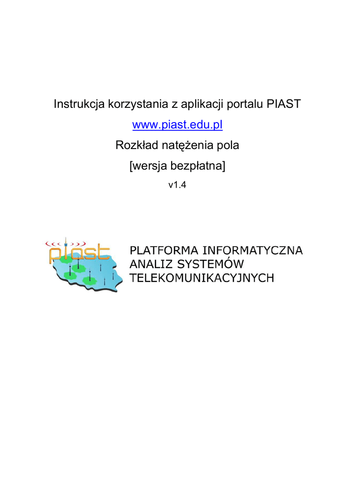 Instrukcja korzystania z aplikacji portalu PIAST www.piast.edu.pl Rozkład natęŜenia pola [wersja bezpłatna] v1.4 1. Wprowadzenie ............................................................................................................................. 3 2. Opis aplikacji................................................................................................................................. 4 2.1. Rejestracja i logowanie................................................................................................................. 6 2.2. Definicja obszaru obliczeń ............................................................................................................ 6 2.3. Definicja analizy............................................................................................................................ 6 2.4. Parametry systemowe.................................................................................................................. 7 2.5. Parametry propagacyjne .............................................................................................................. 7 2.6. Obliczenia ..................................................................................................................................... 8 2.7. Wizualizacja .................................................................................................................................. 9 2.8. Korekta mocy nadajnika ............................................................................................................. 10 2.9. Zapis wyniku analizy do pliku png .............................................................................................. 10 3. Realizacja projektu, podziękowania ........................................................................................... 10 Załącznik A: zakresy parametrów ustalonych dla systemu ................................................................... 11 Załącznik B: zakresy parametrów metod propagacyjnych .................................................................... 12 B.1 Metoda ITU-R P.1546 ...................................................................................................................... 12 Instrukcja obsługi narzędzia internetowego www.piast.edu.pl Rozkłady natęŜenia pola (wersja bezpłatna) 1. 1. Wprowadzenie Aplikacja internetowa do obliczeń rozkładów natęŜenia pola została stworzona i uruchomiona na platformie informatycznej (www.piast.edu.pl) w ramach projektu UE POIG o akronimie PIAST „Platforma Informatyczna do celów Analiz propagacyjnych, kompatybilności elektromagnetycznej i optymalizacji sieci bezprzewodowych Systemów Telekomunikacyjnych i teleinformatycznych”. Aplikacja „Rozkład natęŜenia pola” powstała z myślą o studentach studiów technicznych oraz dla uŜytkowników bezpłatnych (z ograniczoną liczbą funkcjonalności, np. obliczenia realizowane z mniejsza dokładnością). Celem aplikacji jest zapoznanie zainteresowanych osób z praktycznym wykorzystywaniem metod analiz propagacji fal radiowych oraz czynnikami mającymi wpływ na uzyskiwane wyniki, zasięgi stacji i sieci róŜnych systemów radiowych w róŜnych pasmach częstotliwości. Wiedza ta moŜe być przydatna w praktyce inŜynierskiej do wymiarowania i planowania róŜnych sieci bezprzewodowych przy uŜyciu analogicznych narzędzi informatycznych. UŜytkownik grupy „bezpłatnej” ma dostęp do ograniczonej funkcjonalności m. in. ma moŜliwość korzystania z jednego modelu propagacyjnego (ITU-R P.1546). Narzędzie pozwala przeprowadzać analizy propagacyjne oraz wyliczać tzw. zasięg bezinterferencyjny (bez uwzględniania zakłóceń od innych stacji) dla danej stacji nadawczej. Wyniki przeprowadzanych analiz są uzaleŜnione od wielu parametrów wejściowych: umiejscowienia stacji nadawczej, wybrania modelu propagacyjnego, określenia charakterystyki anteny, rodzaju analizy (np. rozkład natęŜenia pola). NaleŜy równieŜ zdefiniować poziom mocy promieniowanej stacji, częstotliwość pracy nadajnika, wysokość anten nadawczej i odbiorczej, numeryczny model terenu, krok obliczeń (w wersji bezpłatnej krok jest zdefiniowany przez administratora) oraz określić podstawowe parametry propagacyjne dla wybranego zalecenia. Portal obliczeniowy został wdroŜony w centrum obliczeniowym w Pracowni Gospodarki i InŜynierii Widma Zakładu Kompatybilności Elektromagnetycznej Instytutu Łączności - PIB we Wrocławiu i jest udostępniany poprzez stronę www.piast.edu.pl . Zapytania w sprawie wykorzystywania wersji o rozszerzonych moŜliwościach - dedykowanych dla uczelni wyŜszych (wersja edukacyjna) i podmiotów biznesowych (wersja biznesowa) prosimy zgłaszać na adres [email protected] Wersja bezpłatna wyznaczania Rozkładów natęŜenia pola posiada ograniczoną funkcjonalność i dokładność i ma na celu zapoznanie z zagadnieniem obliczeń prognozowania rozkładów natęŜenia pola: edukacyjnych. Instytut Łączności – PIB nie bierze odpowiedzialności za wykorzystywanie wyników uzyskiwanych w wersji bezpłatnej do celów komercyjnych, projektowych, regulacyjnych czy dokumentacyjnych. Instytut Łączności – Państwowy Instytut Badawczy, Wrocław 2014 3 / 12I Instrukcja obsługi narzędzia internetowego www.piast.edu.pl Rozkłady natęŜenia pola (wersja bezpłatna) 4 / 12 2. 2. Opis aplikacji Analiza rozkładu natęŜenia pola elektrycznego odbywa się z wykorzystaniem cyfrowych map wysokościowych terenu (ASTER) oraz zaimplementowanych metod propagacyjnych (ITU-R P.1546), pozwala uzyskać wynik, stanowiący istotną składową w analizach zasięgów systemów radiowych. W celu uruchomienia aplikacji na stronie głównej serwisu PIAST www.piast.edu.pl naleŜy wybrać z menu „Narzędzia obliczeniowe” podmenu „Rozkład natęŜenia pola”. PoniŜej przedstawiona jest formatka aplikacji do obliczania rozkładu natęŜenia pola, która się składa 