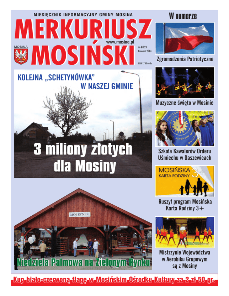 MIESIÊCZNIK INFORMACYJNY GMINY MOSINA MERKURIUSZ MOSIŃSKI W numerze www.mosina.pl nr 4/123 Kwiecień 2014 ISSN 1730-668x Zgromadzenia Patriotyczne KOLEJNA „SCHETYNÓWKA” W NASZEJ GMINIE Muzyczne święto w Mosinie 3 miliony złotych dla Mosiny Szkoła Kawalerów Orderu Uśmiechu w Daszewicach Ruszył program Mosińska Karta Rodziny 3+ Niedziela Palmowa na Zielonym Rynku Mistrzynie Województwa w Aerobiku Grupowym są z Mosiny Kup biało-czerwoną flagę w Mosińskim Ośrodku Kultury za 2 zł 50 gr. DNI MOSINY 2014 – ZAPRASZAMY!!! 2 Tegoroczne obchody Dni Mosiny organizatorzy zaplanowali na 24 i 25 maja i tradycyjnie zapraszają do czynnego uczestnictwa. Święto Gminy Mosina zostanie zainaugurowane 23 maja uroczystą Sesją Rady Miejskiej z nadaniem Medali Rzeczypospolitej Mosińskiej. Organizatorzy przygotowują również szereg ciekawych zdarzeń artystycznych, rozrywkowych, rekreacyjnych i sportowych, na które zapraszamy w różnych miejscach gminy, ze szczególnym uwzględnieniem plenerowej estrady na Placu 20 Października. Na scenie wystąpią między innymi: 1.Jacek Stachursky z zespołem, 2.Eleni z zespołem, 3.Saszan oraz wielu innych interesujących wykonawców. Bardzo ciekawie zapowiada się koncert i musztra paradna Orkiestry Reprezentacyjnej Sił Powietrznych z Poznania w ramach obchodów święta Mobilnej Jednostki Dowodzenia Operacjami Powietrznymi. Wśród form rekreacyjnych i sportowych zapraszamy do udziału w licznych turniejach oraz biegu „Elegant na Piątkę”. 1 3 Szczegóły programu na plakatach i w specjalnym dodatku, który ukaże się przed obchodami Święta Gminy. Serdecznie zapraszamy! Jarmark okolicznościowy – Dni Mosiny Dyrektor Mosińskiego Ośrodka Kultury informuje, iż w ramach organizacji Dni Mosiny 2014 odbędzie się tradycyjna impreza towarzysząca o nazwie „Jarmark okolicznościowy – Dni Mosiny 2014”. Szczegółowe informacje oraz formularz zgłoszeniowy jest dostępny na stronach internetowych: www.mosina.pl oraz www.kultura.gmina.pl. Termin nadsyłania lub dostarczania zgłoszeń dla działalności gastronomicznej oraz działalności rekreacyjno-usługowej upłynął, ale do 9 maja mogą się zgłaszać osoby zainteresowane prowadzeniem działalności pozostałej. Kontakt do organizatora: tel. 669 603 933 lub 61 813 29 09 w. 30. Serdecznie zapraszamy do udziału. Organizatorzy KOMUNIKAT DLA MIESZKAŃCÓW I GOŚCI GMINY MOSINA Organizatorzy Dni Mosiny 2014 informują, że głównym terenem obchodów i uroczystości będzie PLAC 20 PAŹDZIERNIKA W MOSINIE Wszystkie imprezy plenerowe odbędą się 24 i 25 MAJA 2014 r. Ze względu na wykorzystanie parkingów oraz niektórych ciągów komunikacyjnych nastąpią w tych dniach utrudnienia i zmiany w organizacji ruchu drogowego: 1.PARKING GŁÓWNY NA PLACU 20 PAŹDZIERNIKA BĘDZIE NIECZYNNY W DNIACH OD 23 DO 25 MAJA 2014 r. 2.MONTAŻ SCENY NA PARKINGU ROZPOCZNIE SIĘ W GODZINACH RANNYCH 23 MAJA. 3.PARKING W OBRĘBIE URZĘDU MIEJSKIEGO BĘDZIE NIECZYNNY W DNIACH OD 24 DO 25 MAJA. 4.ULICA KROTOWSKIEGO, NA ODCINKU OD RONDA DO PLACU 20 PAŹDZIERNIKA, BĘDZIE OKRESOWO ZAMYKANA DLA RUCHU KOŁOWEGO 5.ULICE W OBRĘBIE PLACU 20 PAŹDZIERNIKA BĘDĄ OKRESOWO ZAMYKANE DLA RUCHU KOŁOWEGO. 6.PROSIMY ZACHOWAĆ SZCZEGÓLNĄ OSTROŻNOŚĆ Serdecznie prosimy o rezygnację /w miarę możliwości/ z wjazdu pojazdami mechanicznymi na Plac 20 Października oraz o wyrozumiałość i stosowanie się do wskazań służb porządkowych. Jednocześnie prosimy o korzystanie z parkingów na ulicy Rzecznej, przy Targowisku Miejskim, w sąsiedztwie kościoła parafialnego i cmentarza. PRZEPRASZAMY ZA UTRUDNIENIA! 2 www.mosina.pl Merkuriusz Mosiñski Aktualnoœci MAJOWE ZGROMADZENIA PATRIOTYCZNE Burmistrz Gminy Mosina zaprasza wszystkich Mieszkańców do licznego udziału w wydarzeniach związanych z majowymi świętami i uroczystościami, których obchody zostały zaplanowane na 2 maja 2014 roku. •Europejski Turniej Piłkarski Nie umiera ten, kto trwa w pamięci żywych Z głębokim żalem i smutkiem przyjęliśmy wiadomość o śmierci MARII DAHLKE śp. długoletniego Nauczyciela i Dyrektora Szkoły Podstawowej nr 1 w Mosinie, oddanego młodzieży i sprawom szkoły pedagoga i wychowawcy. Radnej Rady Miejskiej w Mosinie w latach 1990–1994 Rodzinie zmarłej wyrazy głębokiego współczucia Stadion OSiR w Mosinie – od 9.00 do 14.00 składają: •Konkurs Wiedzy o Unii Europejskiej Plac 20 Października w Mosinie – od 14.00 do 18.00 •„Na tropie tajemnic Unii Europejskiej” – gra miejska Plac 20 Października w Mosinie – od 14.00 do 16.00 •Uroczystość Patriotyczna z okazji 223. rocznicy uchwalenia Konstytucji 3 Maja Waldemar Waligórski Przewodniczący Rady Miejskiej Mosiny wraz z Radnymi Zofia Springer Burmistrz Gminy Mosina z pracownikami Urzędu Miejskiego lac przed pomnikiem Tadeusz Kościuszki, ul. Dworcowa w Mosinie P – godz. 17.00 •Korowód europejski Ulice miasta – od 17.15 • Ks. kanonik Edward Majka zaprasza na odsłonięcie i poświęcenie tablicy upamiętniającej kanonizację Jana Pawła II eren w sąsiedztwie Kościoła parafialnego p.w. Świętego Mikołaja T w Mosinie – godz. 17.30 •Msza Święta w Intencji Ojczyzny Kościół parafialny p.w. Świętego Mikołaja w Mosinie – godz. 18.00 •Koncert Europejski dedykowany Janowi Pawłowi II z udziałem: – chór „VOIX SI VOIX LA” /Francja/ – Agnieszka Wawrzyniak i Bartosz Kuczyk – soliści Teatru Muzycznego w Poznaniu – Mosiński Chór Kościelny p.w. Św. Cecylii – Stowarzyszenie Muzyczne Orkiestra Dęta im. hm. Antoniego Jerzaka Kościół parafialny p.w. Świętego Mikołaja w Mosinie – godz. 19.00 Burmistrz Zofia Springer zwraca się także z gorącym apelem do mieszkańców, firm i instytucji działających na terenie Gminy Mosina o wywieszenie flag państwowych Dyrektor Szkoły Podstawowej w Czapurach Rada Sołecka i Sołtys Wsi Czapury oraz Burmistrz Gminy Mosina zapraszają 10 maja 2014 r. od god