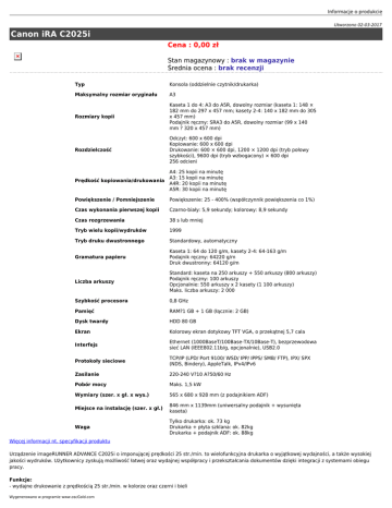 Informacje o produkcie Utworzono 02-03-2017 Canon iRA C2025i Cena : 0,00 zł Stan magazynowy : brak w magazynie Średnia ocena : brak recenzji Typ Konsola (oddzielnie czytnik/drukarka) Maksymalny rozmiar oryginału A3 Rozmiary kopii Kaseta 1 do 4: A3 do A5R, dowolny rozmiar (kaseta 1: 148 × 182 mm do 297 x 457 mm; kasety 2-4: 140 x 182 mm do 305 x 457 mm) Podajnik ręczny: SRA3 do A5R, dowolny rozmiar (99 x 140 mm ? 320 x 457 mm) Rozdzielczość Odczyt: 600 x 600 dpi Kopiowanie: 600 x 600 dpi Drukowanie: 600 × 600 dpi, 1200 × 1200 dpi (tryb połowy szybkości), 9600 dpi (tryb wzbogacony) × 600 dpi 256 odcieni A4: 25 kopii na minutę A3: 15 kopii na minutę Prędkość kopiowania/drukowania A4R: 20 kopii na minutę A5R: 30 kopii na minutę Powiększenie / Pomniejszenie Powiększenie: 25 - 400% (współczynnik powiększenia co 1%) Czas wykonania pierwszej kopii Czarno-biały: 5,9 sekundy; kolorowy: 8,9 sekundy Czas rozgrzewania 38 s lub mniej Tryb wielu kopii/wydruków 1999 Tryb druku dwustronnego Standardowy, automatyczny Gramatura papieru Kaseta 1: 64 do 120 g/m, kasety 2-4: 64-163 g/m Podajnik ręczny: 64220 g/m Druk dwustronny: 64120 g/m Liczba arkuszy Standard: kaseta na 250 arkuszy + 550 arkuszy (800 arkuszy) Podajnik ręczny: 100 arkuszy Opcjonalnie: 550 arkuszy x 2 kasety (1 100 arkuszy) Maks. liczba arkuszy: 2 000 Szybkość procesora 0,8 GHz Pamięć RAM?1 GB + 1 GB (łącznie: 2 GB) Dysk twardy HDD 80 GB Ekran Kolorowy ekran dotykowy TFT VGA, o przekątnej 5,7 cala Interfejs Ethernet (1000BaseT/100Base-TX/10Base-T), bezprzewodowa sieć LAN (IEEE802.11b/g, opcjonalnie), USB2.0 Protokoły sieciowe TCP/IP (LPD/ Port 9100/ WSD/ IPP/ IPPS/ SMB/ FTP), IPX/ SPX (NDS, Bindery), AppleTalk, IPv4/IPv6 Zasilanie 220-240 V?10 A?50/60 Hz Pobór mocy Maks. 1,5 kW Wymiary (szer. x gł. x wys.) 565 x 680 x 928 mm (z podajnikiem ADF) Miejsce na instalację (szer. x gł.) 846 mm x 1139mm (uniwersalny podajnik + wysunięta kaseta) Waga Tylko drukarka: ok. 73 kg Drukarka + płyta szklana: ok. 82kg Drukarka + podajnik ADF: ok. 88kg Więcej informacji nt. specyfikacji produktu Urządzenie imageRUNNER ADVANCE C2025i o imponującej prędkości 25 str./min. to wielofunkcyjna drukarka o wyjątkowej wydajności, a także wysokiej jakości wydruków. Użytkownicy zyskują możliwość łatwej oraz wydajnej współpracy i przekształcania dokumentów dzięki integracji z systemami obiegu pracy. Funkcje: - wydajne drukowanie z prędkością 25 str./min. w kolorze oraz czerni i bieli Wygenerowano w programie www.oscGold.com - intuicyjny interfejs użytkownika - wysoka jakość druku - zaawansowane funkcje współpracy przy opracowywaniu dokumentów - pakiet funkcji zabezpieczeń jako standard - oszczędność miejsca w konfiguracji z wewnętrznym modułem wykańczania - opcjonalne sterowniki Genuine Adobe PostScript 3 Wydajne drukowanie w wysokiej jakości Urządzenie C2025i oferuje wysoki standard jakości wydruku. Niezależnie od tego, czy drukujesz w kolorze czy w czerni i bieli, może ono drukować z prędkością 25 stron na minutę. Jakość wydruków wspierana jest również przez sterowniki Genuine Adobe PostScript 3 (opcjonalne). Zgodność z bogatą gamą nośników i kompaktowe opcje wykańczania zapewniają prawie nieograniczone środki wzbogacania komunikacji. Łatwa obsługa i wszechstronne możliwości dostosowywania Urządzenie C2025i wyposażono w kolorowy, interaktywny ekran dotykowy VGA o wysokiej rozdzielczości i przekątnej 5,7 cala, na którym wyświetlane są przyjazne dla użytkownika ikony ułatwiające pracę. Użytkownicy mogą sami określać liczbę przycisków wyświetlanych na ekranie, a nawet wybierać tło spośród 8 dostępnych wzorów tapet. Dzięki możliwości konfigurowania własnych sekwencji operacji skomplikowane albo najpopularniejsze zadania mogą być inicjowane kliknięciem jednego przycisku. Wydajne funkcje obsługi współpracy i konwersji Skanowanie dwustronne pozwala na szybkie i bezproblemowe przekazywanie obrazów do lokalizacji docelowych, takich jak wiadomości e-mail, witryny FTP czy foldery udostępnione. Integracja z systemami, takimi jak Microsoft, SharePoint, Adobe, a także z bogatą gamą oprogramowania firmy Canon, zapewnia przedsiębiorstwu możliwość stosowania najwydajniejszych elektronicznych procesów obiegu dokumentów - znacznie bardziej wydajnych niż tradycyjne systemy. Urządzenie C2025i może również korzystać z funkcji bardziej zaawansowanych systemów iR ADVANCE, np. faksu lub książek adresowych, pełniąc funkcję klienta w powiązaniu serwer-klient. Wydajne i bezpieczne Urządzenie wyposażono w szereg narzędzi ułatwiających kontrolę kosztów użytkowania, np. ograniczających dostęp do wybranych funkcji. Ponadto pakiet specjalnych funkcji, takich jak zabezpieczanie znakiem wodnym, wymienny dysk twardy, szyfrowanie danych i uwierzytelnianie użytkowników chcących korzystać z urządzenia, zapewnia odpowiednią dbałość o bezpieczeństwo dokumentów na wszystkich etapach ich generowania. Imponujące zasługi dla ochrony środowiska Canon współpracuje z Toray Industries w zakresie opracowywania i produkowania bioplastików o najwyższym na świecie (na stan z października 2008 r.) wskaźniku niepalności. Wszystkie urządzenia z serii imageRUNNER ADVANCE zawierają te elementy, w tym także urządzenia z serii imageRUNNER ADVANCE C2000. Seria C2000 uzyskała również oznaczenie Energy Star, dzięki wyjątkowo niewielkiemu zużyciu energii - na poziomie zaledwie 1,5 W w trybie uśpienia - i otrzymała jedną z najniższych kwalifikacji TEC w swojej klasie. Co więcej, w przypadku wszystkich urządzeń imageRUNNER ADVANCE, Canon wyeliminował ołów ze stalowych, miedzianych i aluminiowych części mechanicznych, uzyskując wartość 1000 ppm lub niższą, co przewyższa oczekiwania i wymogi prawne przepisów RoHS.