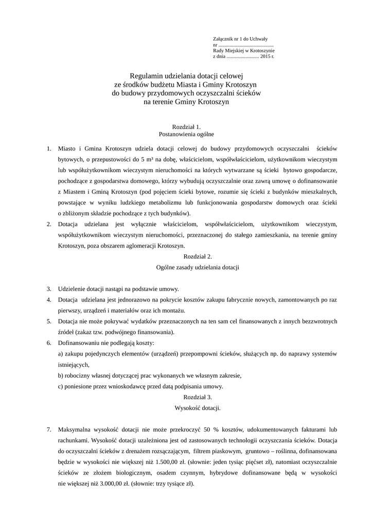 Załącznik nr 1 do Uchwały nr ............................................ Rady Miejskiej w Krotoszynie z dnia .......................... 2015 r. Regulamin udzielania dotacji celowej ze środków budżetu Miasta i Gminy Krotoszyn do budowy przydomowych oczyszczalni ścieków na terenie Gminy Krotoszyn Rozdział 1. Postanowienia ogólne 1. Miasto i Gmina Krotoszyn udziela dotacji celowej do budowy przydomowych oczyszczalni ścieków bytowych, o przepustowości do 5 m³ na dobę, właścicielom, współwłaścicielom, użytkownikom wieczystym lub współużytkownikom wieczystym nieruchomości na których wytwarzane są ścieki bytowo gospodarcze, pochodzące z gospodarstwa domowego, którzy wybudują oczyszczalnie oraz zawrą umowę o dofinansowanie z Miastem i Gminą Krotoszyn (pod pojęciem ścieki bytowe, rozumie się ścieki z budynków mieszkalnych, powstające w wyniku ludzkiego metabolizmu lub funkcjonowania gospodarstw domowych oraz ścieki o zbliżonym składzie pochodzące z tych budynków). 2. Dotacja udzielana jest wyłącznie właścicielom, współwłaścicielom, użytkownikom wieczystym, współużytkownikom wieczystym nieruchomości, przeznaczonej do stałego zamieszkania, na terenie gminy Krotoszyn, poza obszarem aglomeracji Krotoszyn. Rozdział 2. Ogólne zasady udzielania dotacji 3. Udzielenie dotacji nastąpi na podstawie umowy. 4. Dotacja udzielana jest jednorazowo na pokrycie kosztów zakupu fabrycznie nowych, zamontowanych po raz pierwszy, urządzeń i materiałów oraz ich montażu. 5. Dotacja nie może pokrywać wydatków przeznaczonych na ten sam cel finansowanych z innych bezzwrotnych źródeł (zakaz tzw. podwójnego finansowania). 6. Dofinansowaniu nie podlegają koszty: a) zakupu pojedynczych elementów (urządzeń) przepompowni ścieków, służących np. do naprawy systemów istniejących, b) robocizny własnej dotyczącej prac wykonanych we własnym zakresie, c) poniesione przez wnioskodawcę przed datą podpisania umowy. Rozdział 3. Wysokość dotacji. 7. Maksymalna wysokość dotacji nie może przekroczyć 50 % kosztów, udokumentowanych fakturami lub rachunkami. Wysokość dotacji uzależniona jest od zastosowanych technologii oczyszczania ścieków. Dotacja do oczyszczalni ścieków z drenażem rozsączającym, filtrem piaskowym, gruntowo – roślinna, dofinansowana będzie w wysokości nie większej niż 1.500,00 zł. (słownie: jeden tysiąc pięćset zł), natomiast oczyszczalnie ścieków ze złożem biologicznym, osadem czynnym, hybrydowe dofinansowane będą w wysokości nie większej niż 3.000,00 zł. (słownie: trzy tysiące zł). Rozdział 4. Tryb postępowania 8. Jeżeli nieruchomość stanowi przedmiot współwłasności lub współużytkowania wieczystego, wymagana jest zgoda wszystkich współwłaścicieli lub współużytkowników wieczystych na budowę oczyszczalni oraz oświadczenie o wyznaczeniu jednego pełnomocnika upoważnionego do ich reprezentowania w postępowaniu o udzielenie i rozliczenie dotacji, w tym zawarcia umowy o udzielenie dotacji. 9. Wnioski o udzielenie dotacji celowej powinny być składane do 31 stycznia, każdego roku i będą rozpatrywane w kolejności zgłoszeń do wyczerpania środków finansowych przeznaczonych na dany rok budżetowy. W przypadku wyczerpania środków finansowych, na dany rok budżetowy, wnioski będą rozpatrywane w pierwszej kolejności w następnym roku budżetowym. 10. Wnioskodawca składa wniosek o dofinansowanie budowy przydomowej oczyszczalni ścieków wg wzoru stanowiącego załącznik do Regulaminu, który określa w szczególności: a) dane personalne z nr i serią dowodu osobistego Wnioskodawcy i współwłaścicieli nieruchomości, z adresami zamieszkania, jeżeli są inne niż adres miejsca wykonania oczyszczalni, b) adres miejsca wykonania oczyszczalni c) planowany typ oczyszczalni przydomowej, opis przyjętego rozwiązania oczyszczania ścieków z określeniem sposobu odprowadzania ścieków z oczyszczalni. 11. Wykaz dokumentów, które należy załączyć do wniosku o udzielenie dotacji na dofinansowanie budowy przydomowej oczyszczalni ścieków: a) tytuł prawny do nieruchomości, b) oświadczenie o zgodzie wszystkich współwłaścicieli lub współużytkowników wieczystych na posadowienie, zainstalowanie, użytkowanie oczyszczalni na określonej działce oraz oświadczenie o wyznaczeniu jednego pełnomocnika upoważnionego do ich reprezentowania w postępowaniu o udzielenie i rozliczenie dotacji, w tym zawarcia umowy o udzielenie dotacji c) mapa z zaznaczeniem lokalizacji planowanej inwestycji. 12. Wnioski niekompletne lub nieprawidłowo wypełnione, po bezskutecznym wezwaniu do uzupełnienia zostaną zwrócone. 13. Ponowne rozpatrywanie wniosków może nastąpić w przypadku pojawienia się dodatkowych środków finansowych lub w przypadku rezygnacji z wykonania inwestycji przez osoby zakwalifikowane do dofinansowania. 14. Wnioski, które nie zostały zrealizowane w danym roku, zostaną rozpatrzone w pierwszej kolejności w latach następnych, jeżeli: a) zostaną zabezpieczone środki w budżecie na dany rok, b) dochowane zostaną przez wnioskodawcę warunki zawarte we wniosku i Regulaminie, c) ewentualne zmiany w stosunku do wniosku, typu oczyszczalni przydomowej i sposobu odprowadzania ścieków z oczyszczalni, zostaną pisemnie zaakceptowane przez Miasto i Gminę Krotoszyn. 15. Wnioskodawcy zakwalifikowani do udzielenia dotacji w bieżącym roku budżetowym, zostaną powiadomieni pisemnie i wezwani do podpisania umowy. 16. Wnioskodawcy zakwalifikowani do udzielenia dotacji w kolejnych latach, zostaną powiadomieni niezwłocznie po uchwaleniu budżetu na dany rok. 17. Wybudowanie i eksploatacja oczyszczalni ścieków musi spełniać wymogi określone w obowiązujących przepisach w sprawie warunków, jakie należy spełnić przy wprowadzaniu ścieków do wód lub do ziemi, a roboty budowlane należy przeprowadzić zgodnie z obowiązującym Prawem Budowlanym. 18. Wnio
