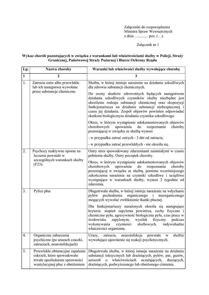 Załączniki do rozporządzenia Ministra Spraw Wewnętrznych z dnia ….......... poz. (…). Załącznik nr 1 Wykaz chorób pozostających w związku z warunkami lub właściwościami służby w Policji, Straży Granicznej, Państwowej Straży Pożarnej i Biurze Ochrony Rządu Lp. Nazwa choroby Warunki lub właściwości służby wywołujące chorobę 2 3 1 1. Zatrucia ostre albo przewlekłe lub ich następstwa wywołane przez substancje chemiczne. Służba, w której istnieje narażenie na działanie szkodliwych dla zdrowia substancji chemicznych. Do oceny skutków zdrowotnych będących następstwem działania szkodliwych czynników służby niezbędne jest określenie rodzaju substancji chemicznej oraz ekspozycji funkcjonariusza na działanie substancji niebezpiecznej i czasu jej działania. Zespół objawów powinien odpowiadać skutkom biologicznym działania czynnika szkodliwego. Okres, w którym wystąpienie udokumentowanych objawów chorobowych upoważnia do rozpoznania choroby pozostającej w związku ze służbą wynosi: - w przypadku zatruć ostrych - 3 dni od zatrucia, - w przypadku zatruć przewlekłych - nie określa się. 2. 3. Psychozy reaktywne oporne na leczenie powstałe w szczególnych warunkach służby (F23). Pylice płuc Ostry stres spowodowany zdarzeniami zaistniałymi w czasie pełnienia służby. Ostry początek choroby. Okres, w którym wystąpienie udokumentowanych objawów chorobowych upoważnia do rozpoznania choroby pozostającej w związku ze służbą, pomimo wcześniejszego zakończenia narażenia na czynniki szkodliwe i uciążliwe występujące w warunkach służby, wynosi 2 tygodnie od zdarzenia. Długotrwała służba, w której istnieje narażenie na wdychanie pyłów pochodzenia organicznego i nieorganicznego mogących wywołać zwłóknienie tkanki płucnej. Dla funkcjonariuszy narażonych określa się następujące kryteria: stopień zapylenia powietrza, cechy fizyczne i chemiczne pyłu, agresywność biologiczna pyłu, czas pracy w środowisku zapylonym, wysiłek fizyczny podczas wykonywania czynności służbowych, indywidualne właściwości organizmu. 4. Organiczne zaburzenia psychiczne (po urazach czaszki, zatruciach, neuroinfekcjach) Urazy, zatrucia, neuroinfekcje powstałe w wywołujące ujawnienie się reakcji psychotycznych. służbie 5. Przewlekłe obturacyjne zapalenie oskrzeli, które spowodowało trwałe upośledzenie sprawności wentylacyjnej płuc z obniżeniem Długotrwała służba, w której istnieje narażenie na działanie substancji toksycznych lub drażniących, pyłów, par, gazów, aerozoli o właściwościach uczulających, duszących, drażniących, podwyższonego lub obniżonego ciśnienia. 6 natężonej objętości wydechowej pierwszosekundowej (FEV1) poniżej 60 % wartości należnej, wywołane narażeniem na pyły lub gazy drażniące Narażenie na czynniki szkodliwe i uciążliwe występujące w warunkach służby nie powinno być krótsze niż 1 rok. Astma oskrzelowa Długotrwała służba, w której istnieje narażenie na dymy, pyły, aerozole, substancje chemiczne i izocyjaniany. Okres, w którym wystąpienie udokumentowanych objawów chorobowych upoważnia do rozpoznania choroby pozostającej w związku ze służbą, pomimo wcześniejszego zakończenia narażenia na czynniki szkodliwe i uciążliwe występujące w warunkach służby, wynosi 1 rok. 7. Zewnątrzpochodne alergiczne zapalenie pęcherzyków płucnych: Okres, w którym wystąpienie udokumentowanych objawów chorobowych upoważnia do rozpoznania choroby pozostającej w związku ze służbą, pomimo ustania narażenia na czynniki szkodliwe i uciążliwe występujące w warunkach służby, wynosi: 1) postać ostra i podostra 2) postać przewlekła 1) w przypadku postaci ostrej zewnątrzpochodnego alergicznego zapalenia pęcherzyków płucnych - 1 rok, 2) w przypadku postaci przewlekłej zewnątrzpochodnego alergicznego zapalenia pęcherzyków płucnych - 3 lata. 8. Ostre uogólnione reakcje alergiczne Służba, w której istnieje narażenie na substancje o silnych właściwościach alergizujących. Okres, w którym istnieje udokumentowane narażenie na czynniki szkodliwe i uciążliwe występujące w warunkach służby wynosi 1 dzień. 9. Byssinoza Okres, w którym wystąpienie udokumentowanych objawów chorobowych upoważnia do rozpoznania choroby pozostającej w związku ze służbą, pomimo wcześniejszego zakończenia narażenia na czynniki szkodliwe i uciążliwe występujące w warunkach służby, wynosi 7 dni. 10. Beryloza Okresu, w którym wystąpienie udokumentowanych objawów chorobowych upoważnia do rozpoznania choroby pozostającej w związku ze służbą, pomimo wcześniejszego zakończenia narażenia na czynniki szkodliwe i uciążliwe występujące w warunkach służby, nie określa się. 11. Choroby płuc wywołane pyłem metali twardych Służba, w której istnieje narażenie na pył kobaltu i wolframu. 12. Alergiczny nieżyt nosa Służba, w której istnieje narażenie na związki akrylowe, amoniak, antymon i jego związki, arsen, selen, tlenki azotu, beryl, chlor, związki siarki, chromiany, bezwodnik ftalowy, furfurol, tlenek kadmu, kobalt, mangan, naftę i mieszaniny węglowodorów, terpentynę, pirydynę, pięciotlenek wanadu. Czynnikiem etiologicznym jest alergen występujący w środowisku służby. Okres, w którym wystąpienie udokumentowanych objawów chorobowych upoważnia do rozpoznania choroby pozostającej w związku ze służbą, pomimo wcześniejszego zakończenia narażenia na czynniki szkodliwe i uciążliwe występujące w warunkach służby, wynosi 1 rok. 13. Zapalenie obrzękowe krtani o podłożu alergicznym Długotrwała służba w środowisku służby szkodliwym dla zdrowia lub w trudnych warunkach atmosferycznych, w narażeniu na czynniki alergizujące. Okres, w którym wystąpienie udokumentowanych objawów chorobowych upoważnia do rozpoznania choroby pozostającej w związku ze służbą, pomimo wcześniejs
