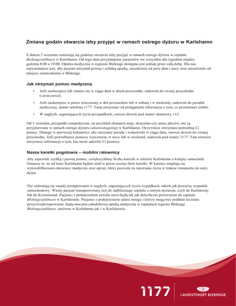 SAMORZĄD REGIONALNY BLEKINGE Zmiana godzin otwarcia izby przyjęć w ramach ostrego dyżuru w Karlshamn Z dniem 3 września zmieniają się godziny otwarcia izby przyjęć w ramach ostrego dyżuru w szpitalu Blekingesjukhuset w Karlshamn. Od tego dnia przyjmujemy pacjentów we wszystkie dni tygodnia między godziną 8:00 a 19:00. Opieka medyczna w regionie Blekinge dostępna jest jednak przez całą dobę. Dla nas najważniejsze jest, aby pacjent otrzymał pewną i solidną opiekę, niezależnie od pory dnia i nocy oraz niezależnie od miejsca zamieszkania w Blekinge. Jak otrzymać pomoc medyczną • Jeśli zachorujesz lub zranisz się w ciągu dnia w dzień powszedni, zadzwoń do swojej przychodni (vårdcentral). • Jeśli zachorujesz w porze wieczornej w dni powszednie lub w sobotę i w niedzielę, zadzwoń do poradni medycznej, numer telefonu 1177. Tutaj otrzymasz od pielęgniarki informacje o tym, co powinieneś zrobić. • W nagłych, zagrażających życiu przypadkach, zawsze dzwoń pod numer alarmowy 112. Od 3 września, przypadki ortopedyczne, na przykład złamania nogi, skręcenia czy urazy pleców, nie są przyjmowane w ramach ostrego dyżuru (akutmottagning) w Karlshamn. Oczywiście otrzymasz potrzebną Ci pomoc. Dlatego w pierwszej kolejności, aby otrzymać poradę i wskazówki w ciągu dnia, zawsze dzwoń do swojej przychodni. Jeśli potrzebujesz pomocy wieczorem, w nocy lub w weekend, zadzwoń pod numer 1177. Tam również otrzymasz informacje o tym, kto może udzielić Ci pomocy. Nasze karetki pogotowia – mobilni ratownicy Aby zapewnić szybką i pewną pomoc, zwiększyliśmy liczbę karetek w mieście Karlshamn o kolejny samochód. Oznacza to, że od teraz Karlshamn będzie miał w porze nocnej dwie karetki. W karetce znajdują się wykwalifikowani ratownicy medyczni oraz sprzęt, który pozwala na ratowanie życia w trakcie transportu na ostry dyżur. Nie zmieniają się zasady postępowania w nagłych, zagrażających życiu wypadkach, takich jak poważny wypadek samochodowy. Wtedy pacjent transportowany jest do najbliższego szpitala z ostrym dyżurem, czyli do Karlskrony lub do Kristianstad. Pacjenci z podejrzeniem zawału serca będą tak jak dotychczas przewożeni do szpitala Blekingesjukhuset w Karlskronie. Pacjenci z podejrzeniem udaru mózgu i którzy mogą być poddani leczeniu przeciwzakrzepowemu, będą otoczeni całodobową opieką medyczną w szpitalach regionu Blekinge Blekingesjukhuset, zarówno w Karlshamn jak i w Karlskronie. Przychodnia dyżurna (Jourcentralen) – przychodnia otwarta wieczorami Przychodnia dyżurna będzie otwarta w tych samych godzinach, co dotychczas, to znaczy w dni powszednie w godzinach 17:00-21:00. W soboty i niedziele przychodnia dyżurna otwarta jest w godzinach 8:00-21:00. Tutaj otrzymasz taką sama pomoc, jak w zwykłych przychodniach w ciągu dnia w dni powszednie. Zawsze dzwoń pod numer 1177, aby umówić się na wizytę w przychodni dyżurnej. Wraz ze zmianą godzin otwarcia izby przyjęć w ramach ostrego dyżuru, przychodnia dyżurna w Karlshamn zostaje przeniesiona z przychodni Samariten na terenie szpitala do przychodni Brunnsgården w centrum miasta Karlshamn. Nie zmieniają się zasady postępowania w nagłych, zagrażających życiu wypadkach, takich jak poważny wypadek samochodowy. Wtedy pacjent transportowany jest do najbliższego szpitala z ostrym dyżurem, czyli do Karlskrony lub do Kristianstad. Pacjenci z podejrzeniem zawału serca będą tak jak dotychczas przewożeni do szpitala Blekingesjukhuset w Karlskronie. Pacjenci z podejrzeniem udaru mózgu i którzy mogą być poddani leczeniu przeciwzakrzepowemu, będą otoczeni całodobową opieką medyczną w szpitalach regionu Blekinge Blekingesjukhuset, zarówno w Karlshamn jak i w Karlskronie. Przychodnia dyżurna (Jourcentralen) – przychodnia otwarta wieczorami Przychodnia dyżurna będzie otwarta w tych samych godzinach, co dotychczas, to znaczy w dni powszednie w godzinach 17:00-21:00. W soboty i niedziele przychodnia dyżurna otwarta jest w godzinach 8:00-21:00. Tutaj otrzymasz taką sama pomoc, jak w zwykłych przychodniach w ciągu dnia w dni powszednie. Zawsze dzwoń pod numer 1177, aby umówić się na wizytę w przychodni dyżurnej. Wraz ze zmianą godzin otwarcia izby przyjęć w ramach ostrego dyżuru, przychodnia dyżurna w Karlshamn zostaje przeniesiona z przychodni Samariten na terenie szpitala do przychodni Brunnsgården w centrum miasta Karlshamn. SAMORZĄD REGIONALNY BLEKINGE Dodatkowe informacje Aby otrzymać dodatkowe informacje, należy zadzwonić pod numer 1177, lub odwiedzić stronę internetową: www.l 177.se/blekinge albo www.ltblekinge.se. Tam znajdziesz niniejsze informacje również w uproszczonym języku szwedzkim oraz w innych językach: albańskim, arabskim, angielskim, fińskim, perskim, polskim, rosyjskim, somalijskim, tajskim oraz w języku tigrinia. Jeśli chcesz otrzymać informacje na płycie CD*, złóż zamówienie poprzez e-mail: [email protected], lub też zadzwoń pod numer telefonu 0455-73 40 92. Na stronie internetowej 1177.se łatwo znajdziesz informacje o chorobach, badaniach lekarskich oraz leczeniu. Za pośrednictwem formularza kontaktowego możesz otrzymać bezpośrednią odpowiedź od lekarza lub pielęgniarki. * dotyczy informacji w języku szwedzkim
