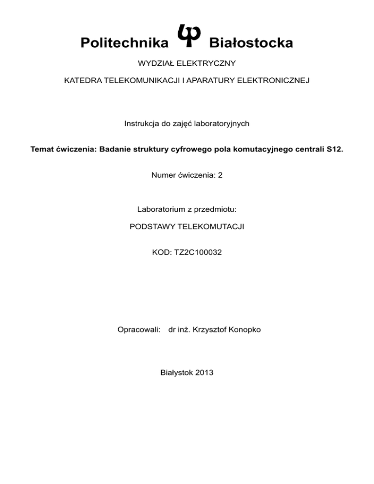Politechnika Białostocka WYDZIAŁ ELEKTRYCZNY KATEDRA TELEKOMUNIKACJI I APARATURY ELEKTRONICZNEJ Instrukcja do zajęć laboratoryjnych Temat ćwiczenia: Badanie struktury cyfrowego pola komutacyjnego centrali S12. Numer ćwiczenia: 2 Laboratorium z przedmiotu: PODSTAWY TELEKOMUTACJI KOD: TZ2C100032 Opracowali: dr inż. Krzysztof Konopko Białystok 2013 1 Wprowadzenie 1.1 Struktura pola Pole komutacyjne składa się z identycznych elementów. Elementy te noszą nazwę cyfrowych zespołów komutacyjnymi (DSE) lub multiportów. Ich liczba w centrali zależy od jej pojemności oraz wielkości obsługiwanego ruchu. Multiporty są połączone ze sobą poprzez łącza PCM z 32 kanałami każde i 16 bitami na kanał przy częstotliwości 4096 kHz. Każdy multiport składa się z 16 dwu-kierunkowych portów komutacyjnych połączonych ze sobą za pomocą wspólnej telestrady. Porty komutacyjne ponumerowane od 0 do 7 są zwane niskimi portami a z numerami od 8 do 15 wysokimi portami. Każdy z portów komutacyjnych składa się z portu odbiorczego, odbierającego sygnały z łącza PCM, analizującego zawartość każdego kanału i zapamiętującego ich stany, oraz z portu nadawczego wysyłającego zawartość łączem PCM. Fizycznie, multiport składa się z 8 układów VLSI zmontowanych na pakiecie obwodów drukowanych i połączonych ze sobą za pomocą telestrady wielokrocia czasowego. Każdy układ VLSI zawiera porty nadawcze i dwa porty odbiorcze. Multiport może wykonywać komutację przestrzennoczasową pomiędzy przychodzącymi i wychodzącymi łączami PCM, tzn. że informacja przychodząca do portu odbiorczego jako zawartość jakiegoś kanału łącza wejściowego PCM może być wystana przez nadajnik w dowolnym kanale (komutacja czasowa) dowolnego łącza wyjściowego PCM. Jak wspomniano wyżej, wszystkie multiporty tworzące pole komutacyjne muszą mieć wspólny sygnał odniesienia, tak by pracować synchronicznie. Sygnał ten o częstotliwości 8192 kHz, generowany jest przez moduł Zegara i Sygnałów Tonowych i rozprowadzony do wszystkich multiportów poprzez specjalne linie. Pole komutacyjne jest utworzone z szeregu multiportów połączonych łączami PCM. Tak wiec, przez wykonanie kroków komutacyjnych w szeregu kolejnych multiportów tworzona jest droga umożliwiająca transmisję informacji z jednego punktu pola do drugiego. Struktura pola komutacyjnego pokazana jest na rys. 1. Podzespół terminalowy (TSU) Podzespół terminalowy jest nazwą nadaną grupie modułów (maksimum 8) rozdzielających dwa multiporty zwane łącznikami dostępu (AS - Access Switches). Niskie porty (0 do 7) łączników dostępu (AS) są dołączone do modułów. Porty 8 do 11 są dołączone do pozostałych multiportów pola, zwanych łącznikami grupowymi (GS - Group Switches). Porty 14 i 15 mogą opcyjnie być dołączone do pomocniczych zespołów sterujących (ACE), a porty 12 i 13 mogą być dołączone do modułu zegara i sygnałów tonowych lub utrzymania i peryferii. Te moduły (C&T i M&P) nie są zorganizowane jak TSU i stąd nie mają łączników dostępu. Ponadto liczba tych modułów zainstalowanych w centrali nie zależy od wielkości centrali, tak że tylko trzy centralowe TSU będą miały zajęte swoje porty 12 i 13. Zespół terminalowy (TU) Każde 4 TSU tworzą zespól wyższego rzędu zwany zespołem terminalowym (TU) złożony z 8 łączników dostępu (dwa na TSU), dołączonych do tej samej grupy łączników. 8 łączników dostępu jest ponumerowanych od 0 do 7. ASy każdego TSU nie są dołączane w kolejności, AS 0 i 4 należą do pierwszego TSU, 1 i 5 do drugiego, 2 i 6 do trzeciego oraz 3 i 7 do czwartego. Każdy TU ma 32 (4*8) łączy PCM do reszty pola. TU nie musi zawierać TSU tego samego rodzaju, ale jeżeli to zdarzy się i TU składa się tylko z TSU liniowych, TU będzie zawierać 4096 (4*1024) linii abonenckich. Sekcje: 1-y i 2-gi stopień. Celem umożliwienia połączenia pomiędzy TSU tworzącymi TU, 8 łączników dostępu tworzących TU może być połączonych razem wykorzystując 8 niskich portów multiportu. Multiport ten tworzy tzw. jednostopniowe pole. W strukturze tej każde TI każdego TSU jest połączone z innym TI w TU. Widać również że każdy łącznik dostępu TU jest dołączony do multiportu pierwszego stopnia poprzez port z tym samym numerem. Tym samym numer portu multiportu pierwszego stopnia pokrywa się z numerem łącznika dostępu TSU przeznaczenia. Jeżeli liczba abonentów przekracza liczbę tych, którzy mogą być dołączeni do pojedynczego TU, potrzebny będzie 2-gi stopień dołączający 1-y stopień multiportów do tych do których są dołączone różne TU. Widać stąd nową strukturę zwaną sekcją, utworzoną z 16 2 multiportów, 8 w pierwszym stopniu i 8 w drugim. Połączenie pomiędzy pierwszym i drugim stopniem jest określone przez następujące równania: Numer portu 2 stopnia = numerowi multiportu 1 stopnia Numer portu 1 stopnia - 8 = numerowi multiportu 2 stopnia Rys. 1. Struktura cyfrowego pola komutacyjnego centrali S12 Grupy: 3-ci stopień Jedna sekcja pozwala na połączenie 8 TU z pełną dostępnością. Jeżeli liczba modułów wymaga więcej niż 8 TU, konieczne będzie zastosowanie 3-go stopnia dla wzajemnego połączenia sekcji. Multiporty 3go stopnia są zestawione w grupach 8 multiportów każda, umożliwiając dołączenie 8 grup w centrali. Pozwala to połączenie 16 sekcji 1-go i 2-go stopnia. W przypadku 3-go stopnia, wszystkie multiporty mają zwrócone porty do wnętrza pola, ponieważ 3-ci stopień jest ostatnim możliwym. Zależności połączeniowe pomiędzy 2-im i 3-im stopniem są wyrażone, jak to można zobaczyć na rysunku, przez następujące równania: Numer portu 2-go stopnia - 8 = numerowi grupy 3-go stopnia Numer multiportu 2-go stopnia = numerowi multiportu 3-go stopnia Numer sekcji 2-go stopnia = numerowi portu 3-go stopnia Widać stąd, że np.: port 15 multiportu 7 sekcji 0 