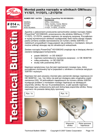 Montaż paska rozrządu w silnikach GM/Isuzu Y17DT, Y17DTL i Z17DTH NUMER REF. GATES: # 014 PL 22/05/07 MARKA: MODEL: SILNIK: KOD SILNIKA: Zestaw PowerGrip® Kit K015563XS i K025563XS OPEL/ VAUXHALL Astra, Combo, Corsa, Meriva 1.7 Di / DTi (ISUZU) / CDTi Y17DT, Y17DTL, Z17DTH Zgodnie z zaleceniami producenta samochodów zestaw rozrządu Gates PowerGrip® K015563XS, przeznaczony dla silników GM/Isuzu Y17DT, Y17DTL i Z17DTH, zawiera napinacz ze sprężyną zwojową. Początkowo w wyżej wymienionych silnikach występowały dwie różne wersje napędu paska (zmiana została wprowadzona od numeru silnika 328705) i w niektórych przypadkach mogą pojawić się problemy z montażem, których można uniknąć stosując się do określonych wskazówek. Zestaw rozrządu PowerGrip® K015563XS znajduje się w bieżącej ofercie i zawiera następujące komponenty: • • • • pasek 5563XS - nr OE 636227 napinacz automatyczny (sprężyna zwojowa) - nr OE 5636739 rolkę pośrednią - nr OE 636730 śrubę rolki pośredniej (M12) Napinacz sprężynowy (rys.2a) jest napinaczem nowego typu, który początkowo montowany był w pojazdach z silnikiem o numerze seryjnym 328705 i wyższym. Napinacz ten jest używany również jako zamiennik starego napinacza (nr OE 5636724 - rys. 1a), który nie jest już dostępny jako oryginalna część zamienna (OE). W jednostkach napędowych do numeru silnika 328704 występuje problem z montażem nowego napinacza na istniejącym wsporniku silnika. Na rys.1b przedstawiono, w jaki sposób napinacz starszego typu umieszczony jest pod dolną łapą wspornika silnika. Nowy napinacz nie posiada takiej płyty oporowej. Rys. 1a Rys. 1b Wspornik silnika Technical Bulletin 009EU Płyta oporowa napinacza Copyright © 2007 Gates Corporation Page 1/4 Aby zastąpić napinacz starego typu nowym – sprężynowym, należy wymienić wspornik silnika, ponieważ dolna łapa musi mieć taką samą długość, jak dwie pozostałe. Dodatkowo, należy zamontować gwintowany kołek (OE nr kat.5636706 rys. 2b) do mocowania sprężyny zwojowej nowego napinacza. # 014 PL Rys. 2a Rys. 2b 22/05/07 Kołek gwintowany Napinacz sprężynowy Niezbędnym okazało się dostosowanie niektórych elementów zestawu do starszych pojazdów. W związku z tym, że nowy wspornik (nr OE 568110) jest dość kosztowny, firma Gates wprowadziła jedno skuteczne i tanie rozwiązanie dla wszystkich silników. Rozwiązanie to polega na wprowadzeniu elementu dystansowego (rys. 3), wykonanego ze stali o wysokiej jakości, o takiej samej grubości jak płytka oporowa oryginalnego napinacza, kompensującego różnicę długości łap wspornika silnika. Jako alternatywa oferowany jest rozbudowany zestaw K025563XS, który zawiera wszystkie element konieczne do wymiany i/lub adaptacji układu, zarówno w nowych jak i starych aplikacjach. Rys. 3 Zestaw K025563XS obejmuje: • • • • • • • pasek 5563XS – nr OE 636227 napinacz sprężynowy – nr OE 5636739 śrubę napinacza (M10) – nr OE 5636713 gwintowany kołek – nr OE 5636706 element dystansowy (rys.3) o takiej samej grubości jak płytka oporowa napinacza starszego typu rolkę pośrednią – nr OE 636730 śrubę rolki pośredniej (M12) Technical Bulletin 009EU Copyright © 2007 Gates Corporation Page 2/4 Procedurę montażową przedstawiono poniżej. Ważne: Silnik musi być zimny. Ustawić silnik w Górnym Martwym Położeniu (GMP). Unieruchomić koło pasowe wałka rozrządu (śruba M6 w położeniu odpowiadającym godzinie 8-ej na tarczy zegara) i koło pasowe pompy wtryskowej (śruba M8 w położeniu odpowiadającym godzinie 5-ej). # 014 PL 22/05/07 Silnik powinien być podparty a wspornik silnika wymontowany. A) silniki z zamontowany napinaczem starszego typu 1) 2) 3) wymontować stary napinacz, sprężynę, rolkę pośrednią i pasek zamontować nową rolkę pośrednią ze śrubą włożyć i dokręcić (momentem 18,6 Nm) gwintowany kołek z prawej strony koła pasowego pompy wtryskowej (rys.4) Rys.4 Rys.5 Kołek gwintowany Element dystansowy 4) zamontować nowy napinacz sprężynowy (sprężyna na kołku, ręcznie dokręcić śrubę) 5) obrócić napinacz w kierunku przeciwnym do ruchu wskazówek zegara (kluczem imbusowym) tak, aby otwór sześciokątny (na klucz imbusowy) znalazł się w położeniu odpowiadającemu w przybliżeniu godzinie 5-ej na tarczy zegara 6) dokręcić śrubę 7) założyć nowy pasek (pasek musi być napięty z lewej strony silnika - strony bez napinacza) 8) poluzować śrubę napinacza, który napnie pasek; dokręcić śrubę napinacza (momentem 38 Nm) (jednocześnie unieruchamiając napinacz za pomocą klucza imbusowego) 9) wymontować śruby unieruchamiające wałek rozrządu i pompę wtryskową 10) obrócić silnik o 720° (2 obroty), sprawdzić GMP, poluzować napinacz, dokręcić śrubę napinacza (momentem 38 Nm) (jednocześnie unieruchamiając napinacz za pomocą klucza imbusowego) 11) przykleić element dystansowy (rys.5) na dolnej łapie wspornika silnika (użyć preparatu loctite lub superglue), aby uniknąć Technical Bulletin 009EU Copyright © 2007 Gates Corporation Page 3/4 poluzowania elementu dystansowego przy późniejszym odkręcaniu śruby wspornika. 12) zamontować inne wymontowane elementy B) Silniki z zamontowanym napinaczem sprężynowym # 014 PL 22/05/07 UWAGA: dla tej wersji nie jest wymagane użycie gwintowanego kołka ani elementu dystansowego 1) wymontować stary napinacz, rolkę pośrednią i pasek 2) zamontować nową rolkę pośrednią ze śrubą 3) zamontować nowy napinacz (sprężyna na kołku, ręcznie dokręcić śrubę) 4) obrócić napinacz w kierunku przeciwnym do ruchu wskazówek zegara (kluczem imbusowym) tak, aby otwór sześciokątny (na klucz imbusowy) znalazł się w położeniu odpowiadającemu w przybliżeniu godzinie 5-ej na tarczy zegara 5) dokręcić śrubę 6) założyć nowy pasek (pasek musi być napięty z lewej strony silnika - stronie bez napinacza) 7) poluzować śr