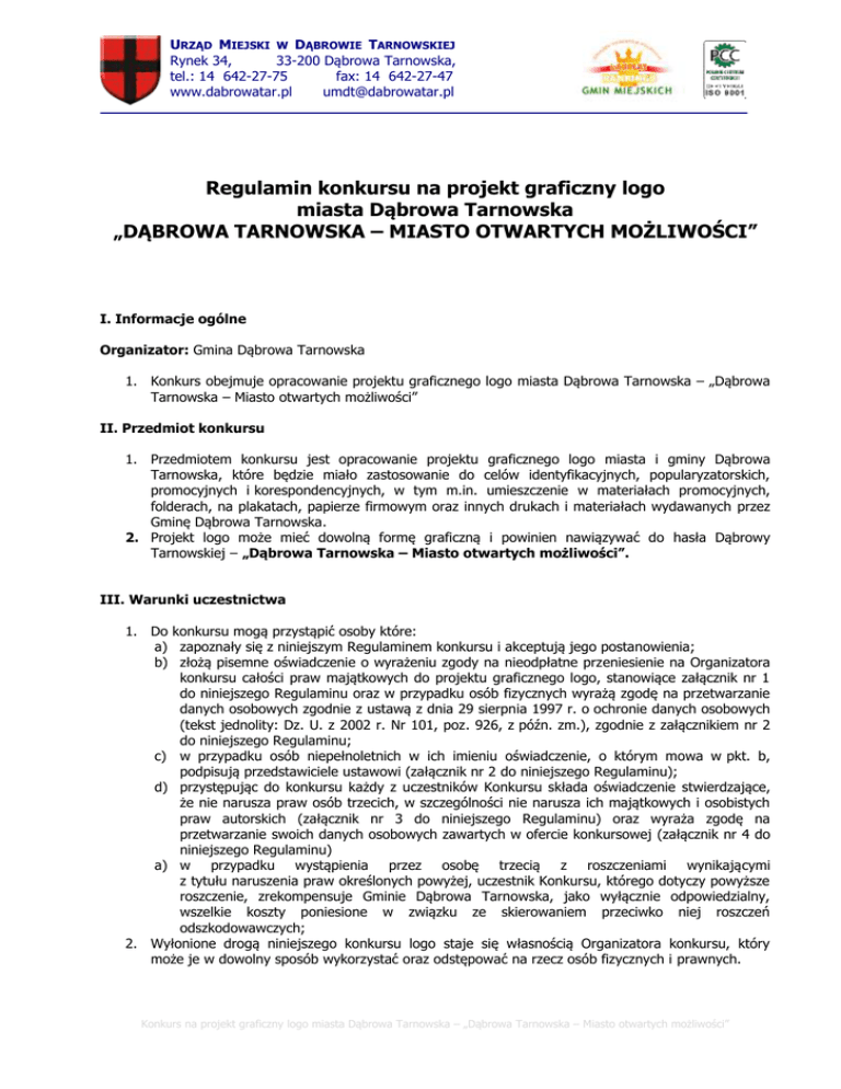 URZĄD MIEJSKI W DĄBROWIE TARNOWSKIEJ Rynek 34, 33-200 Dąbrowa Tarnowska, tel.: 14 642-27-75 fax: 14 642-27-47 www.dabrowatar.pl [email protected] Regulamin konkursu na projekt graficzny logo miasta Dąbrowa Tarnowska „DĄBROWA TARNOWSKA – MIASTO OTWARTYCH MOŻLIWOŚCI” I. Informacje ogólne Organizator: Gmina Dąbrowa Tarnowska 1. Konkurs obejmuje opracowanie projektu graficznego logo miasta Dąbrowa Tarnowska – „Dąbrowa Tarnowska – Miasto otwartych możliwości” II. Przedmiot konkursu 1. Przedmiotem konkursu jest opracowanie projektu graficznego logo miasta i gminy Dąbrowa Tarnowska, które będzie miało zastosowanie do celów identyfikacyjnych, popularyzatorskich, promocyjnych i korespondencyjnych, w tym m.in. umieszczenie w materiałach promocyjnych, folderach, na plakatach, papierze firmowym oraz innych drukach i materiałach wydawanych przez Gminę Dąbrowa Tarnowska. 2. Projekt logo może mieć dowolną formę graficzną i powinien nawiązywać do hasła Dąbrowy Tarnowskiej – „Dąbrowa Tarnowska – Miasto otwartych możliwości”. III. Warunki uczestnictwa 1. Do konkursu mogą przystąpić osoby które: a) zapoznały się z niniejszym Regulaminem konkursu i akceptują jego postanowienia; b) złożą pisemne oświadczenie o wyrażeniu zgody na nieodpłatne przeniesienie na Organizatora konkursu całości praw majątkowych do projektu graficznego logo, stanowiące załącznik nr 1 do niniejszego Regulaminu oraz w przypadku osób fizycznych wyrażą zgodę na przetwarzanie danych osobowych zgodnie z ustawą z dnia 29 sierpnia 1997 r. o ochronie danych osobowych (tekst jednolity: Dz. U. z 2002 r. Nr 101, poz. 926, z późn. zm.), zgodnie z załącznikiem nr 2 do niniejszego Regulaminu; c) w przypadku osób niepełnoletnich w ich imieniu oświadczenie, o którym mowa w pkt. b, podpisują przedstawiciele ustawowi (załącznik nr 2 do niniejszego Regulaminu); d) przystępując do konkursu każdy z uczestników Konkursu składa oświadczenie stwierdzające, że nie narusza praw osób trzecich, w szczególności nie narusza ich majątkowych i osobistych praw autorskich (załącznik nr 3 do niniejszego Regulaminu) oraz wyraża zgodę na przetwarzanie swoich danych osobowych zawartych w ofercie konkursowej (załącznik nr 4 do niniejszego Regulaminu) a) w przypadku wystąpienia przez osobę trzecią z roszczeniami wynikającymi z tytułu naruszenia praw określonych powyżej, uczestnik Konkursu, którego dotyczy powyższe roszczenie, zrekompensuje Gminie Dąbrowa Tarnowska, jako wyłącznie odpowiedzialny, wszelkie koszty poniesione w związku ze skierowaniem przeciwko niej roszczeń odszkodowawczych; 2. Wyłonione drogą niniejszego konkursu logo staje się własnością Organizatora konkursu, który może je w dowolny sposób wykorzystać oraz odstępować na rzecz osób fizycznych i prawnych. Konkurs na projekt graficzny logo miasta Dąbrowa Tarnowska – „Dąbrowa Tarnowska – Miasto otwartych możliwości” IV. Forma prezentacji pracy konkursowej 1. Projekt logo należy składać zgodnie z poniższymi założeniami: a) wydrukowane na sztywnym papierze formatu A4 b) zapisane na nośniku elektronicznym (na płycie CD lub DVD) w formatach pliku *.cdr (CorelDRAW) lub *.psd (Photshop) oraz w formacie służącym do prezentacji i drukowania *.pdf (o jakości drukarskiej), *.jpg (o wysokiej rozdzielczości), *.png (o wysokiej rozdzielczości). c) pliki muszą dopuszczać możliwości zmiany skali i proporcji obrazu bez utraty jakości. d) projekt logo powinien być przygotowany w następujących wersjach: a) kolorowej na białym tle; b) kolorowej na czarnym tle; c) w skali szarości lub czarno-białej tzw. faksowej; 2. Prace konkursowe powinny znajdować się w zaklejonych kopertach z napisem: „Konkurs na projekt logo - Dąbrowa Tarnowska – Miasto otwartych możliwości”. 3. Każdy uczestnik konkursu może zgłosić maksymalnie 3 projekty graficzne. V. Miejsce i termin składania prac konkursowych: 1. Prace konkursowe wraz z wypełnionymi załącznikami należy składać w siedzibie Organizatora: Urząd Miejski w Dąbrowie Tarnowskiej, Rynek 34, 33-200 Dąbrowa Tarnowska, w pok. 20 (tj. sekretariat UMDT), lub przesłać pocztą na adres Organizatora w terminie do 1 marca 2013 r. (decyduje data stempla pocztowego) z podpisem na kopercie: „Konkurs na projekt graficzny logo miasta Dąbrowa Tarnowska – Miasto otwartych możliwości”. 2. Prace konkursowe niespełniające wymagań, o których mowa w Regulaminie konkursu lub nadesłane po upływie terminu, o którym mowa w pkt. 1 nie będą podlegały ocenie Komisji Konkursowej. VI. Zasady przyznawania nagród: 1. Wyboru laureata konkursu na projekt graficzny logo Dąbrowy Tarnowskiej – „Dąbrowa Tarnowska – Miasto otwartych możliwości” dokonuje Komisja Konkursowa powołana przez Burmistrza Dąbrowy Tarnowskiej. 2. Decyzja Komisji Konkursowej o przyznaniu nagrody jest ostateczna i nie przysługuje od niej odwołanie. 3. Komisja Konkursowa przyzna nagrodę rzeczową dla zwycięzcy konkursu w wysokości 1.000,00 zł. (słownie: jeden tysiąc zł) brutto. VII. Rozstrzygnięcie konkursu: 1. Planowana data ogłoszenia wyników: 8 marca 2013 r. 2. Wyniki konkursu zostaną podane do publicznej wiadomości na stronie internetowej Urzędu Miejskiego w Dąbrowie Tarnowskiej www.dabrowatar.pl . VIII. Organizacja konkursu: Urząd Miejski w Dąbrowie Tarnowskiej Referat Promocji Kultury i Informatyzacji Rynek 34 33-200 Dąbrowa Tarnowska [email protected] [email protected] Konkurs na projekt graficzny logo miasta Dąbrowa Tarnowska – „Dąbrowa Tarnowska – Miasto otwartych możliwości” Załącznik nr 1 do Regulaminu konkursu na projekt graficzny logo „Dąbrowa Tarnowska – Miasto otwartych możliwości” WYRAŻENIE ZGODY NA NIEODPŁATNE PRZENIESIENIE NA ORGANIZATORA KONKURSU CAŁOŚCI PRAW MAJĄTKOWYCH DO PROJEKTU GRAFICZNEGO LOGO MIASTA DĄBROWA TARNOWSKA ............................................