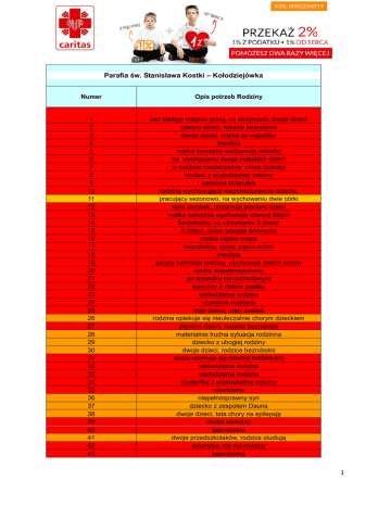 Parafia św. Stanisława Kostki – Kołodziejówka Numer Opis potrzeb Rodziny 1 2 3 4 5 6 7 8 9 10 11 12 13 14 15 16 17 18 19 20 21 22 23 24 25 26 27 28 29 30 31 32 33 34 35 36 37 38 39 40 41 42 43 bez stałego miejsca pracy, na utrzymaniu dwoje dzieci czworo dzieci, rodzice bezrobotni dwoje dzieci, matka po wypadku inwalida matka samotnie wychowuje dziecko na wychowaniu dwoje malutkich dzieci w rodzinie nieuleczalnie chore dziecko student z wielodzietnej rodziny samotna emerytka rodzina wychowująca niepełnosprawne dziecko pracujący sezonowo, na wychowaniu dwie córki niski zarobek, utrzymuje pięcioro dzieci matka samotnie wychowuje czworo dzieci bezrobotny, na utrzymaniu 3 dzieci 6 dzieci, ojciec pracuje dorywczo osoba ciężko chora bezrobotny, ojciec pięciu dzieci inwalida jedyny karmiciel rodziny, wychowuje dwóch synów osoba niepełnosprawna po wypadku samochodowym samotny o niskim zasiłku wielodzietna rodzina uczestnik majdanu troje dzieci, mały zasiłek rodzina opiekuje się nieuleczalnie chorym dzieckiem pięcioro dzieci, rodzice bezrobotni materialnie trudna sytuacja rodzinna dziecko z ubogiej rodziny dwoje dzieci, rodzice bezrobotni ciocia opiekuje się dwoma bratankami wielodzietna rodzina wielodzietna rodzina studentka z wielodzietnej rodziny niewidoma niepełnosprawny syn dziecko z zespołem Dauna dwoje dzieci, tata chory na epilepsję osoba samotna bezrobotna dwoje przedszkolaków, rodzice studiują emerytka, nie ma rodziny bezrobotna 1 44 45 46 47 48 49 50 51 52 53 54 55 56 57 58 59 60 61 62 63 64 65 66 67 68 69 70 71 72 73 74 75 76 77 78 79 80 81 82 83 84 85 86 87 88 89 90 91 92 93 małe dzieci, tata bez pracy ojciec samotnie wychowuje syna samotna osoba samotna osoba w starszym wieku samotny osoba w podeszłym wieku wielodzietna rodzina 7 dzieci w rodzinie nieuleczalnie chore dziecko w rodzinie dwoje studentów troje dzieci, rodzice pracują sezonowo siedmioro dzieci, ojciec bezrobotny samotna emerytka jedno dziecko, niski zarobek rodziców mały zarobek osoba samotna osoba niepełnosprawna rodzina opiekuje się nieuleczalnie chorą córeczką samotna emerytka trudna sytuacja materialna rodziny uczestnik majdanu wielodzietna rodzina rodzice na pracach sezonowych, jedno dziecko samotny emeryta sierota, opiekują się dziadkowie wielodzietna rodzina osoba samotna dwoje dzieci student troje dzieci, rodzice nie pracują wdowa uczestnik majdanu troje dzieci, pracuje matka samotny emeryta rodzina wychowująca dziecko z porażeniem mózgowym po wypadku samochodowym osoby w podeszłym wieku matka wychowuje czworo dzieci inwalida bezrobotny, na utrzymaniu2 dzieci wielodzietna rodzina osoba samotna wielodzietna rodzina osoba niepełnosprawna uczestnik majdanu osoba starsza po wylewie dziecko z ubogiej rodziny osoba samotna dwoje dzieci, tata bez pracy niewidoma 2 Duszpasterski Ośrodek bł. Jana Pawła II - Lwów Numer 1 2 3 Opis potrzeb Rodziny Małżeństwo, 4 dzieci w wieku 1-6 lat, potrzeby: żywność, środki czystości Małżeństwo, 3 dzieci w wieku 1-5 lat, potrzeby: żywność, środki czystości Małżeństwo, 3 synów w wieku 3-7 lat, potrzeby: żywność, środki czystości, odzież Małżeństwo , 2 dzieci w wieku 1-5 lat, potrzeby: żywność, środki czystości 4 5 6 7 8 9 Małżeństwo , 3 córki i 1 syn w wieku 11–17 lat, potrzeby: żywność, środki czystości, odzież. Trudna sytuacja mieszkaniowa (jeden pokój komunalny) Małżeństwo, 3 dzieci w wieku 1-4 lat, potrzeby: żywność, środki czystości Samotna matka, bezrobotna (azerbejdżanka), dziecko 9 miesięcy, potrzeby: żywność dla dziecka, środki czystości i pielegnacyjne Samotna matka, bezrobotna, dziecko 3 lata, potrzeby: żywność, środki czystości Emerytka, syn alkoholik, potrzeby: żywność - rodzina objęta już pomocą. 3