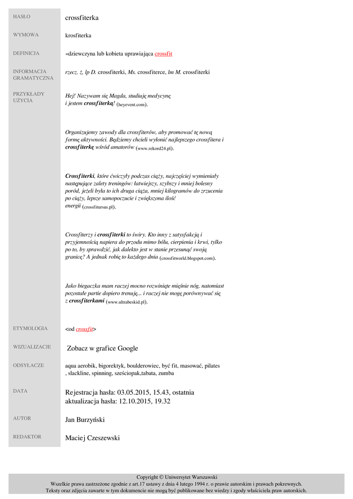 HASŁO crossfiterka WYMOWA krosfiterka DEFINICJA «dziewczyna lub kobieta uprawiająca crossfit» INFORMACJA GRAMATYCZNA rzecz. ż, lp D. crossfiterki, Ms. crossfiterce, lm M. crossfiterki PRZYKŁADY UŻYCIA Hej! Nazywam się Magda, studiuję medycynę i jestem crossfiterką! (heyevent.com). Organizujemy zawody dla crossfiterów, aby promować tę nową formę aktywności. Będziemy chcieli wyłonić najlepszego crossfitera i crossfiterkę wśród amatorów (www.rekord24.pl). Crossfiterki, które ćwiczyły podczas ciąży, najczęściej wymieniały następujące zalety treningów: łatwiejszy, szybszy i mniej bolesny poród, jeżeli była to ich druga ciąża, mniej kilogramów do zrzucenia po ciąży, lepsze samopoczucie i zwiększona ilość energii (crossfitursus.pl). Crossfiterzy i crossfiterki to świry. Kto inny z satysfakcją i przyjemnością napiera do przodu mimo bólu, cierpienia i krwi, tylko po to, by sprawdzić, jak dalekto jest w stanie przesunąć swoją granicę? A jednak robię to każdego dnia (crossfitworld.blogspot.com). Jako biegaczka mam raczej mocno rozwinięte mięśnie nóg, natomiast pozostałe partie dopiero trenuję... i raczej nie mogę porównywać się z crossfiterkami (www.ultrabeskid.pl). ETYMOLOGIA WIZUALIZACJE <od crossfit> Zobacz w grafice Google ODSYŁACZE aqua aerobik, bigorektyk, boulderowiec, być fit, masować, pilates , slackline, spinning, sześciopak,tabata, zumba DATA Rejestracja hasła: 03.05.2015, 15.43, ostatnia aktualizacja hasła: 12.10.2015, 19.32 AUTOR Jan Burzyński REDAKTOR Maciej Czeszewski Copyright © Uniwersytet Warszawski Wszelkie prawa zastrzeżone zgodnie z art.17 ustawy z dnia 4 lutego 1994 r. o prawie autorskim i prawach pokrewnych. Teksty oraz zdjęcia zawarte w tym dokumencie nie mogą być publikowane bez wiedzy i zgody właściciela praw autorskich. Powered by TCPDF (www.tcpdf.org)
