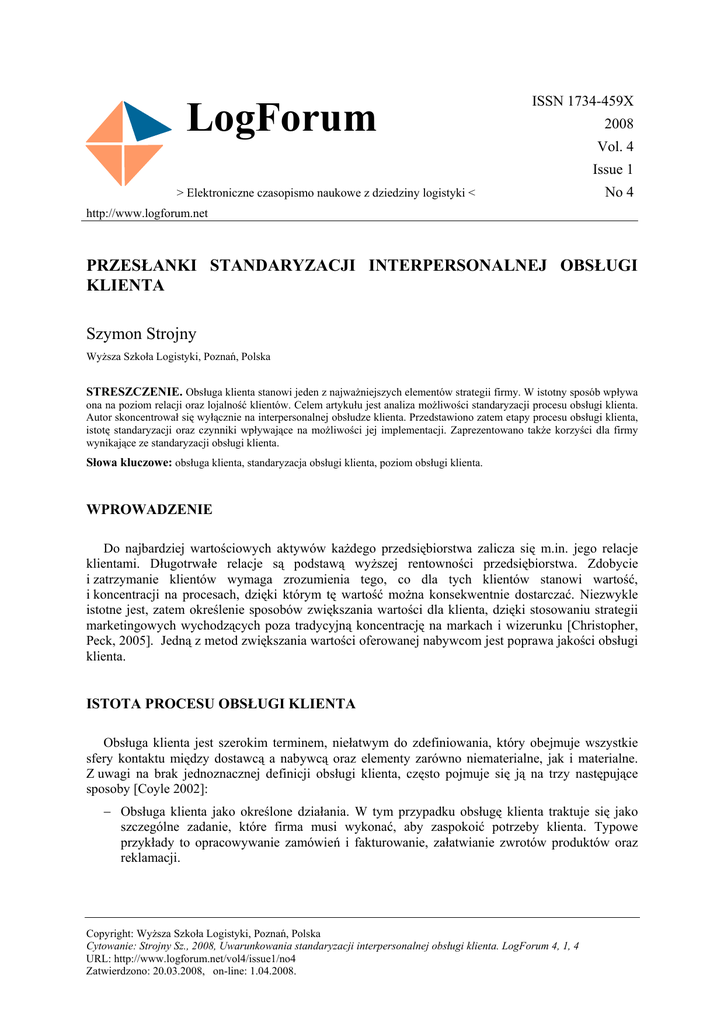 LogForum ISSN 1734-459X 2008 Vol. 4 Issue 1 > Elektroniczne czasopismo naukowe z dziedziny logistyki < No 4 http://www.logforum.net PRZESŁANKI STANDARYZACJI INTERPERSONALNEJ OBSŁUGI KLIENTA Szymon Strojny Wyższa Szkoła Logistyki, Poznań, Polska STRESZCZENIE. Obsługa klienta stanowi jeden z najważniejszych elementów strategii firmy. W istotny sposób wpływa ona na poziom relacji oraz lojalność klientów. Celem artykułu jest analiza możliwości standaryzacji procesu obsługi klienta. Autor skoncentrował się wyłącznie na interpersonalnej obsłudze klienta. Przedstawiono zatem etapy procesu obsługi klienta, istotę standaryzacji oraz czynniki wpływające na możliwości jej implementacji. Zaprezentowano także korzyści dla firmy wynikające ze standaryzacji obsługi klienta. Słowa kluczowe: obsługa klienta, standaryzacja obsługi klienta, poziom obsługi klienta. WPROWADZENIE Do najbardziej wartościowych aktywów każdego przedsiębiorstwa zalicza się m.in. jego relacje klientami. Długotrwałe relacje są podstawą wyższej rentowności przedsiębiorstwa. Zdobycie i zatrzymanie klientów wymaga zrozumienia tego, co dla tych klientów stanowi wartość, i koncentracji na procesach, dzięki którym tę wartość można konsekwentnie dostarczać. Niezwykle istotne jest, zatem określenie sposobów zwiększania wartości dla klienta, dzięki stosowaniu strategii marketingowych wychodzących poza tradycyjną koncentrację na markach i wizerunku [Christopher, Peck, 2005]. Jedną z metod zwiększania wartości oferowanej nabywcom jest poprawa jakości obsługi klienta. ISTOTA PROCESU OBSŁUGI KLIENTA Obsługa klienta jest szerokim terminem, niełatwym do zdefiniowania, który obejmuje wszystkie sfery kontaktu między dostawcą a nabywcą oraz elementy zarówno niematerialne, jak i materialne. Z uwagi na brak jednoznacznej definicji obsługi klienta, często pojmuje się ją na trzy następujące sposoby [Coyle 2002]: − Obsługa klienta jako określone działania. W tym przypadku obsługę klienta traktuje się jako szczególne zadanie, które firma musi wykonać, aby zaspokoić potrzeby klienta. Typowe przykłady to opracowywanie zamówień i fakturowanie, załatwianie zwrotów produktów oraz reklamacji. Copyright: Wyższa Szkoła Logistyki, Poznań, Polska Cytowanie: Strojny Sz., 2008, Uwarunkowania standaryzacji interpersonalnej obsługi klienta. LogForum 4, 1, 4 URL: http://www.logforum.net/vol4/issue1/no4 Zatwierdzono: 20.03.2008, on-line: 1.04.2008. Strojny Sz., 2008, Uwarunkowania standaryzacji interpersonalnej obsługi klienta. LogForum 4, 1, 4. URL: http://www.logforum.net/vol4/issue1/no4 − Obsługa klienta jako pomiar wykonania działań. Obsługę klienta rozpatruje się tu w kategoriach określonych mierników realizacji wyników działań, takich jak odsetek zamówień dostarczonych terminowo i w całości oraz liczba zamówień opracowanych w przewidywanym czasie. − Obsługa klienta jako filozofia. Na tym poziomie rozumienia, obsługę klienta podnosi się do rangi zobowiązania, za które odpowiedzialna jest cała firma. Polega ona na zapewnieniu klientowi satysfakcji dzięki możliwie najlepszej obsłudze. W szeroko rozumianej obsłudze klienta bierze się pod uwagę wszystkie trzy opisane sposoby, począwszy od ostatniego. I tak, w pierwszym etapie przedsiębiorstwo przyjmuje filozofię całkowicie zorientowaną na klienta. Oznacza to, że potrzeby klienta stanowią punkt wyjścia w planowaniu strategii firmy, a zasobami kieruje się tak, aby te potrzeby rozpoznać i zaspokoić. W drugim etapie określa się standardy i mierniki, oceniające wykonanie poszczególnych elementów obsługi. Są one z natury mierzalne i łatwo poddają się standaryzacji. Następnie identyfikuje się kilka elementów ważnych w obsłudze i określa ich relatywne znaczenie. Z kolei w końcowym, trzecim etapie ustala się przebieg procesu obsługi klienta, który pozwoli na wykonanie i ocenę poszczególnych działań związanych z obsługą. Wspomniany proces obsługi jest punktem wyjścia do bardziej szczegółowych opracowań z zakresu problematyki obsługi klienta. Proces ten składa się z kilku elementów [Kempny 2001]. W literaturze przedmiotu autorzy najczęściej proponują podział elementów procesu obsługi klienta na trzy grupy: przedtransakcyjne, transakcyjne i potransakcyjne. 1. Przedtransakcyjne elementy obsługi klienta [Rutkowski et al 2001]. Są to elementy związane z przygotowaniem przedsiębiorstwa do obsługi. Odgrywają one ogromna rolę w kształtowaniu oczekiwań klienta, wpływają na jego postrzeganie firmy, a także satysfakcję z oferty. Są to działania nierutynowe, wymagające całościowego spojrzenia na firmę i w związku z tym ich przygotowanie, z reguły, powierza się naczelnej kadrze zarządzającej. Do kluczowych elementów należy zaliczyć: − Przygotowanie standardów obsługi klienta. Przygotowując taka politykę należy dokładnie rozpoznać potrzeby i preferencje klientów, do których adresowana jest oferta firmy, oraz to jak te potrzeby mogą różnić się pomiędzy poszczególnymi segmentami klientów. Następnie należy zdefiniować cele, które ma realizować polityka obsługi klienta i dopiero wówczas projektować standardy obsługi klienta. Polityka obsługi klienta powinna zawierać zdefiniowane mierniki umożliwiające monitorowanie oferowanego poziomu usług, częstotliwość ich pomiaru a także działania, które należy podjąć w wypadku ich odchylenia od ustalonej normy. − Udostępnienie klientowi pisemnej wersji księgi obsługi klienta. Obsługa klienta jest usługą, która już ze swej definicji jest niematerialna i jej zakup wiąże się dla klienta z ryzykiem. Przedstawienie klientowi polityki firmy w zakresie obsługi klienta pozwala mu zapoznać się z ofertą firmy w zakresie jego obsługi i tym samym zminimalizować swą niepewność. − Dostosowanie struktury organizacyjnej. Kształtując strukt