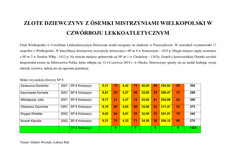 ZŁOTE DZIEWCZYNY Z ÓSEMKI MISTRZYNIAMI WIELKOPOLSKI W CZWÓRBOJU LEKKOATLETYCZNYM Finał Wielkopolski w Czwórboju Lekkoatletycznym Dziewcząt został rozegrany na stadionie w Puszczykowie. W zawodach wystartowało 17 zespołów z Wielkopolski. W klasyfikacji drużynowej zwyciężyły dziewczęta z SP nr 8 w Krotoszynie - 1435 p. Drugie miejsce zajęły uczennice z SP nr 3 w Środzie Wlkp. -1412 p. Na trzecim miejscu uplasowała się SP nr 1 w Chodzieży - 1367p. Zespół z krotoszyńskiej Ósemki uzyskał bezpośredni awans na Mistrzostwa Polski, które odbędą się 12-14 czerwca 2014 r. w Olecku. Dziewczyny spisały się na medal śrubując swoje rekordy życiowe, należą im się ogromne gratulacje. Skład zwycięskiej drużyny SP 8: Zasieczna Dominika 2001 SP 8 Krotoszyn 9,31 75 4,42 75 46,00 89 204,84 65 304 Kaczmarek Kornelia 2001 SP 8 Krotoszyn 8,81 95 4,27 68 32,00 52 200,47 73 288 Mikołajczyk Julia 2001 SP 8 Krotoszyn 9,17 81 4,37 73 43,00 81 204,99 65 300 Olisiewicz Dominika 2001 SP 8 Krotoszyn 9,19 80 4,65 88 32,00 52 211,41 53 273 Drygas Wioletta 2002 SP 8 Krotoszyn 9,63 64 4,01 55 32,50 53 201,91 70 242 Nowak Klaudia 2002 SP 8 Krotoszyn 9,31 75 4,33 71 34,50 58 204,15 66 270 0 1435 SP 8 Krotoszyn Trener: Hubert Wronek, Łukasz Rak 0 0 0