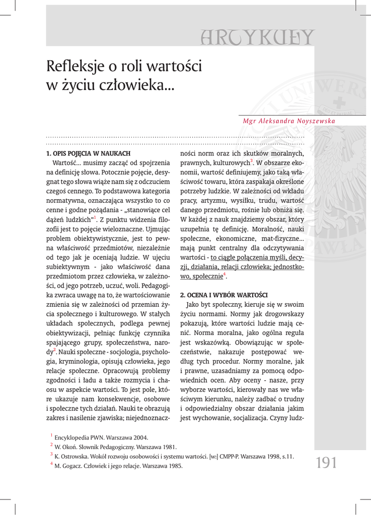 ARTYKUŁY Refleksje o roli wartości w życiu człowieka... Mg r A lek sandra Noysze wska 1. Opis pojęcia w naukach Wartość... musimy zacząć od spojrzenia na definicję słowa. Potocznie pojęcie, desygnat tego słowa wiąże nam się z odczuciem czegoś cennego. To podstawowa kategoria normatywna, oznaczająca wszystko to co cenne i godne pożądania - „stanowiące cel dążeń ludzkich”1. Z punktu widzenia filozofii jest to pojęcie wieloznaczne. Ujmując problem obiektywistycznie, jest to pewna właściwość przedmiotów, niezależnie od tego jak je oceniają ludzie. W ujęciu subiektywnym - jako właściwość dana przedmiotom przez człowieka, w zależności, od jego potrzeb, uczuć, woli. Pedagogika zwraca uwagę na to, że wartościowanie zmienia się w zależności od przemian życia społecznego i kulturowego. W stałych układach społecznych, podlega pewnej obiektywizacji, pełniąc funkcję czynnika spajającego grupy, społeczeństwa, narody2. Nauki społeczne - socjologia, psychologia, kryminologia, opisują człowieka, jego relacje społeczne. Opracowują problemy zgodności i ładu a także rozmycia i chaosu w aspekcie wartości. To jest pole, które ukazuje nam konsekwencje, osobowe i społeczne tych działań. Nauki te obrazują zakres i nasilenie zjawiska; niejednoznacz- ności norm oraz ich skutków moralnych, prawnych, kulturowych3. W obszarze ekonomii, wartość definiujemy, jako taką właściwość towaru, która zaspakaja określone potrzeby ludzkie. W zależności od wkładu pracy, artyzmu, wysiłku, trudu, wartość danego przedmiotu, rośnie lub obniża się. W każdej z nauk znajdziemy obszar, który uzupełnia tę definicję. Moralność, nauki społeczne, ekonomiczne, mat-fizyczne... mają punkt centralny dla odczytywania wartości - to ciągłe połączenia myśli, decyzji, działania, relacji człowieka; jednostkowo, społecznie4. 2. Ocena i wybór wartości Jako byt społeczny, kieruje się w swoim życiu normami. Normy jak drogowskazy pokazują, które wartości ludzie mają cenić. Norma moralna, jako ogólna reguła jest wskazówką. Obowiązując w społeczeństwie, nakazuje postępować według tych procedur. Normy moralne, jak i prawne, uzasadniamy za pomocą odpowiednich ocen. Aby oceny - nasze, przy wyborze wartości, kierowały nas we właściwym kierunku, należy zadbać o trudny i odpowiedzialny obszar działania jakim jest wychowanie, socjalizacja. Czyny ludz- 1 Encyklopedia PWN. Warszawa 2004. 2 W. Okoń. Słownik Pedagogiczny. Warszawa 1981. 3 K. Ostrowska. Wokół rozwoju osobowości i systemu wartości. [w:] CMPP-P. Warszawa 1998, s.11. 4 M. Gogacz. Człowiek i jego relacje. Warszawa 1985. 191 ARTICLES kie pokrywają się z potrzebami jednostki i społeczeństwa. Są one w większym, lub mniejszym stopniu zgodne z prawami nauki, natury. Bo właśnie nauka i jej aksjomaty pomagają, tłumaczą, ułatwiają znaleźć odpowiedź na nurtujące pytania; związane z życiem osobniczym i społecznym. Człowiek jako podmiot działający, wciąż ustosunkowuje się w jakiś sposób do przedmiotów, do osób oraz do faktów, zjawisk, z którymi w tym działaniu się styka. Karol Wojtyła analizując zagadnienie normy i wartości, zwraca uwagę, że wartość moralna nie może być tylko przedmiotem przeżycia emocjonalnego. Musi być ona również przedmiotem poznania, czyli przedstawienia intelektualnego oraz chcenia5. „Wartość moralna antycypowana intelektem i przyjmowana chceniem (wolą) osoby, bywa w każdym czynie niejako wydobywana z dynamiki bytu tejże osoby, ze stosunku tego, kim ona jest, do tego, kim powinna się stawać”6. 3. Decyzje, wybory Rozpatrując problem umiejętności wyboru, podjęcia decyzji, należy podkreślić wagę czynników jakimi są procesy związane z wychowaniem. To, czy będziemy umieli podjąć właściwą decyzję, zależy od woli człowieka oraz od jego dojrzałości. Gdyż właśnie, podejmowanie decyzji, ujawnia nam, że człowiek jest Osobą. Jest on suwerennym podmiotem. Wybieramy to, co nam odpowiada. W to angażujemy naszą wolę i nasze siły poznawcze. 4. Między dobrem a złem Przedmiotem naszego wyboru, decyzji jest dobro poznane i chciane. Od człowie- 192 ka i jego decyzji, zależy porządek moralny i prawny. Stabilność społeczeństwa i stabilność osobowości człowieka też zależy od odpowiednich wyborów7. Dobra, pojawiające się przed człowiekiem, nie są równe. Naszym zadaniem jest wiedzieć, co jakim jest dobrem, i odpowiednio je traktować. Człowiek, dzięki udziałowi zmysłów i intelektu, może rzeczywistość wchłaniać w siebie. Żyć nią w sposób duchowy. Wiek XIX i XX przynosi bogaty rozwój psychologii osobowości. Później zaczęto interesować się i prowadzić badania w zakresie psychologii zwierząt; różne eksperymenty na bazie rozwoju techniki. Ale wiek XX zostawia też wielkie doświadczenie - całej ludzkości. Nauki społeczne musiały przepracować, omówić, opisać, to traumatyczne doświadczenie Zła8 - w różnych jego obliczach. Od okresu II wojny światowej rozpoczyna się intensywna praca nad rozwojem nauki o osobowości człowieka. Szczególne zainteresowanie kierowano na obszar wiedzy o cechach, budowie i pochodzeniu charakterów, przekonań, uzdolnień, poglądów... To dawało podstawę do wyjaśniania wielu aspektów moralnych, etycznych. Próbowano wyjaśniać motywy działań, reakcji. Drugi wątek, który rozwinął się w psychologii osobowości, to wątek moralistyczny. Od najdawniejszych czasów dyskutowano, ciągle budując pewne zasady do ocen, jakim człowiek jest, a jakim być powinien. Rozpatrywano sprawy dotyczące charakteru i w ogóle osobowości człowieka, od strony ideałów i norm moralnych. Wielu autorów danych dziedzin ukazuje związek wpływu ideałów moralnych na konstrukcje teorii psychologicznych. 5 K. Wojtyła. Wykłady Lubelskie. Lublin, s. 290. 6 Tamże, s.291. 7 M. Gogacz. Podstawy Wychowania. Niepokalan