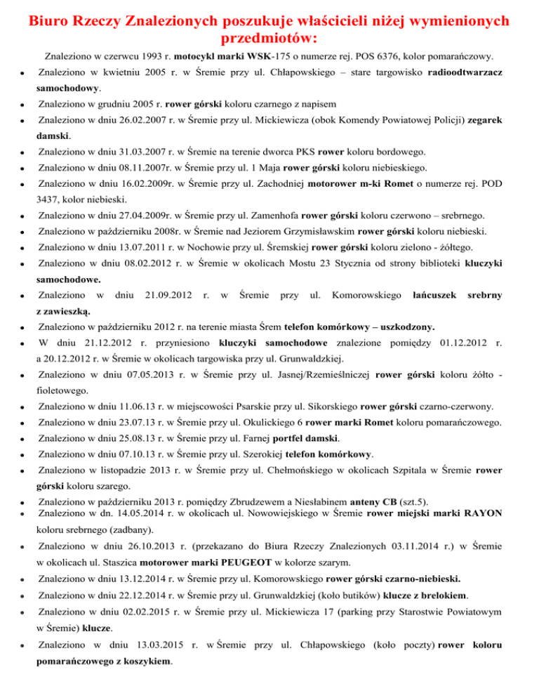 Biuro Rzeczy Znalezionych poszukuje właścicieli niżej wymienionych przedmiotów: Znaleziono w czerwcu 1993 r. motocykl marki WSK-175 o numerze rej. POS 6376, kolor pomarańczowy. Znaleziono w kwietniu 2005 r. w Śremie przy ul. Chłapowskiego – stare targowisko radioodtwarzacz samochodowy. Znaleziono w grudniu 2005 r. rower górski koloru czarnego z napisem Znaleziono w dniu 26.02.2007 r. w Śremie przy ul. Mickiewicza (obok Komendy Powiatowej Policji) zegarek damski. Znaleziono w dniu 31.03.2007 r. w Śremie na terenie dworca PKS rower koloru bordowego. Znaleziono w dniu 08.11.2007r. w Śremie przy ul. 1 Maja rower górski koloru niebieskiego. Znaleziono w dniu 16.02.2009r. w Śremie przy ul. Zachodniej motorower m-ki Romet o numerze rej. POD 3437, kolor niebieski. Znaleziono w dniu 27.04.2009r. w Śremie przy ul. Zamenhofa rower górski koloru czerwono – srebrnego. Znaleziono w październiku 2008r. w Śremie nad Jeziorem Grzymisławskim rower górski koloru niebieski. Znaleziono w dniu 13.07.2011 r. w Nochowie przy ul. Śremskiej rower górski koloru zielono - żółtego. Znaleziono w dniu 08.02.2012 r. w Śremie w okolicach Mostu 23 Stycznia od strony biblioteki kluczyki samochodowe. Znaleziono w dniu 21.09.2012 r. w Śremie przy ul. Komorowskiego łańcuszek srebrny z zawieszką. Znaleziono w październiku 2012 r. na terenie miasta Śrem telefon komórkowy – uszkodzony. W dniu 21.12.2012 r. przyniesiono kluczyki samochodowe znalezione pomiędzy 01.12.2012 r. a 20.12.2012 r. w Śremie w okolicach targowiska przy ul. Grunwaldzkiej. Znaleziono w dniu 07.05.2013 r. w Śremie przy ul. Jasnej/Rzemieślniczej rower górski koloru żółto fioletowego. Znaleziono w dniu 11.06.13 r. w miejscowości Psarskie przy ul. Sikorskiego rower górski czarno-czerwony. Znaleziono w dniu 23.07.13 r. w Śremie przy ul. Okulickiego 6 rower marki Romet koloru pomarańczowego. Znaleziono w dniu 25.08.13 r. w Śremie przy ul. Farnej portfel damski. Znaleziono w dniu 07.10.13 r. w Śremie przy ul. Szerokiej telefon komórkowy. Znaleziono w listopadzie 2013 r. w Śremie przy ul. Chełmońskiego w okolicach Szpitala w Śremie rower górski koloru szarego. Znaleziono w październiku 2013 r. pomiędzy Zbrudzewem a Niesłabinem anteny CB (szt.5). Znaleziono w dn. 14.05.2014 r. w okolicach ul. Nowowiejskiego w Śremie rower miejski marki RAYON koloru srebrnego (zadbany). Znaleziono w dniu 26.10.2013 r. (przekazano do Biura Rzeczy Znalezionych 03.11.2014 r.) w Śremie w okolicach ul. Staszica motorower marki PEUGEOT w kolorze szarym. Znaleziono w dniu 13.12.2014 r. w Śremie przy ul. Komorowskiego rower górski czarno-niebieski. Znaleziono w dniu 22.12.2014 r. w Śremie przy ul. Grunwaldzkiej (koło butików) klucze z brelokiem. Znaleziono w dniu 02.02.2015 r. w Śremie przy ul. Mickiewicza 17 (parking przy Starostwie Powiatowym w Śremie) klucze. Znaleziono w dniu 13.03.2015 r. w Śremie przy ul. Chłapowskiego (koło poczty) rower koloru pomarańczowego z koszykiem. Znaleziono w dniu 23.03.2015 r. w Nochowie przy ul. Śremskiej rower koloru czarnego. Znaleziono w dniu 12.05.2015 r. w Śremie przy ul. 1 Maja rower koloru szaro niebieskiego. Znaleziono w dniu 16.06.2015 r. w Śremie przy ul. Grunwaldzkiej w okolicach targowiska klucze patentowe. Właścicieli prosimy o kontakt: Starostwo Powiatowe w Śremie ul. Mickiewicza 17, pokój nr 25 Tel.:061-28-37-001 wew. 340