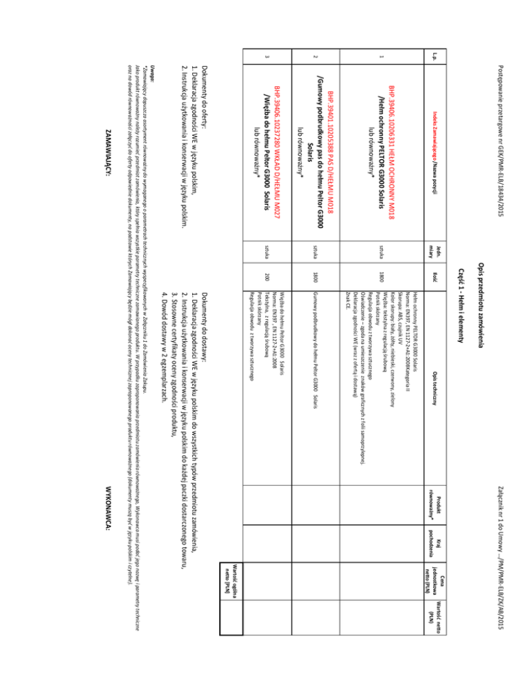 Ilość Postępowanie przetargowe nr GEK/PMR-ELB/18434/2015 Opis przedmiotu zamówienia Jedn. miary Część 1 - Hełm i elementy Indeks Zamawiającego /Nazwa pozycji Opis techniczny Hełm ochronny PELTOR G3000 Solaris Norma: EN397, EN 1127-2+A1:2008Kategoria II Skorupa: ABS, czujnik UV Kolor skorupy: biały, żółty, niebieski, czerwony, zielony Więźba: tekstylna z regulacją śrubową Potnik skórzany Regulacja obwodu z tworzywa sztucznego Oświadczenie – zgoda na umieszczenie znaków graficznych z folii samoprzylepnej. Deklaracja zgodności WE (wraz z ofertą i dostawą) Znak CE. L.p. Gumowy podbrudkowy do hełmu Peltor G3000 Solaris 1800 1800 sztuka sztuka 200 BHP.39406.10206331 HEŁM OCHRONNY M018 /Hełm ochronny PELTOR G3000 Solaris lub równoważny* 2 BHP.39401.10205388 PAS D/HEŁMU M018 /Gumowy podbrudkowy pas do hełmu Peltor G3000 Solaris lub równoważny* sztuka Więźba do hełmu Peltor G3000 Solaris Norma: EN397 , EN 1127-2+A1:2008 Tekstylna, z regulacją śrubową Potnik skórzany Regulacja obwodu z tworzywa sztucznego 1 3 BHP.39406.10237280 WKŁAD D/HEŁMU M027 /Więźba do hełmu Peltor G3000 Solaris lub równoważny* Dokumenty do oferty: 1. Deklaracja zgodności WE w języku polskim, 2. Instrukcja użytkowania i konserwacji w języku polskim. Kraj pochodzenia Cena jednostkowa netto (PLN) Wartość netto (PLN) Załącznik nr 1 do Umowy …/PM/PMR-ELB/ZK/AB/2015 Produkt równoważny* Wartość ogólna netto [PLN] Dokumenty do dostawy: 1. Deklaracja zgodności WE w języku polskim do wszystkich typów przedmiotu zamówienia, 2. Instrukcja użytkowania i konserwacji w języku polskim do każdej paczki dostarczonego towaru, 3. Stosowne certyfikaty oceny zgodności produktu, 4. Dowód dostawy w 2 egzemplarzach. WYKONAWCA: Uwaga: *Zamawiający dopuszcza asortyment równoważny do wymaganego o parametrach technicznych wyspecyfikowanych w Załączniku 1 do Zamówienia Zakupu. Jako produkt równoważny należy rozumieć przedmiot zamówienia, który spełnia wszystkie parametry techniczne zamawianego produktu. W przypadku zaproponowania przedmiotu zamówienia równoważnego, Wykonawca musi podać jego nazwę i parametry techniczne oraz na dowód równoważności załączyć do oferty odpowiednie dokumenty, na podstawie których Zamawiający będzie mógł dokonać oceny technicznej zaproponowanego produktu równoważnego (dokumenty muszą być w języku polskim i czytelne). ZAMAWIAJĄCY: Indeks Zamawiającego /Nazwa pozycji sztuka Jedn. miary 200 Ilość Postępowanie przetargowe nr GEK/PMR-ELB/18434/2015 Opis przedmiotu zamówienia L.p. BHP.39406.10216755 STOŻEK Z/FILCU M025 /Stożek z filcu lub równoważny* Opis techniczny Filcowa czapeczka dla spawacza wykonana z jednego kawałka filcu. Wyprofilowana do kształtu głowy. Różne rozmiary (54-62) Część 2 - Stożek z filcu 1 Dokumenty do dostawy: Dowód dostawy w 2 egzemplarzach. Kraj pochodzenia Wartość ogólna netto [PLN] Cena jednostkowa netto (PLN) Wartość netto (PLN) Załącznik nr 1 do Umowy …/PM/PMR-ELB/ZK/AB/2015 Produkt równoważny* WYKONAWCA: Uwaga: *Zamawiający dopuszcza asortyment równoważny do wymaganego o parametrach technicznych wyspecyfikowanych w Załączniku 1 do Zamówienia Zakupu. Jako produkt równoważny należy rozumieć przedmiot zamówienia, który spełnia wszystkie parametry techniczne zamawianego produktu. W przypadku zaproponowania przedmiotu zamówienia równoważnego, Wykonawca musi podać jego nazwę i parametry techniczne oraz na dowód równoważności załączyć do oferty odpowiednie dokumenty, na podstawie których Zamawiający będzie mógł dokonać oceny technicznej zaproponowanego produktu równoważnego (dokumenty muszą być w języku polskim i czytelne). ZAMAWIAJĄCY: Indeks Zamawiającego /Nazwa pozycji sztuka Jedn. miary 90 Ilość Postępowanie przetargowe nr GEK/PMR-ELB/18434/2015 Opis przedmiotu zamówienia L.p. BHP.39406.10206346 HEŁM Z/PRZYŁBICĄ M018 /Hełm elektroizolacyjny ochronny z przyłbicą klasy 2 biały lub równoważny* Opis techniczny A) Hełm - zdolność do amortyzacji po kondycjonowaniu w temperaturach (-30ºC, +50ºC) - odporność na przebicie po kondycjonowaniu w temperaturach (-30ºC, +50ºC) - odporność na odpryski stopionego metalu - odporność na odkształcenie boczne (LD) - własności chroniące przed porażeniem prądem (klasa 0) 1000V AC, 1500V DC - zakres regulacji obwodu głowy 53-63cm B) Zintegrowana osłona twarzy klasy 2 - moce optyczne, współczynnik przepuszczania światła, - współczynnik luminacji rozproszenia światła - 1 klasa optyczna - odpornośc na promieniowanie UV (numer kodowy i stopień ochrony filtru) - 2C-1,2 - ochrona przed zagrożeniami termicznymi wywołanymi łukiem elektrycznym klasa 2 - współczynnik VLT >75% klasa 0 - odporność na uderzenia o średniej energii (prędkość uderzenia do 120m/s kulką o masie 0,86g) (B) - ochrona przed kroplami i rozbryzgami cieczy (3); - ochrona przed stopionymi metalami i gorącymi ciałami stałymi(9); - odporność na zamglenie (N) - ochrona przed zagrożeniami termicznymi wywołanymi łukiem elektrycznym (parametry łuku BOX TEST 7kA/0,5s) 8cal/cm2. - pełna zgodność z normami PN-EN 397:2012 / EN 397:2012; PN-EN 50365:2005 / EN 50365:2002; PN-EN 166:2003 / EN 166:2001; GS-ET 29:2010 oraz z dyrektywą 89/686/EEC - okres użytkowania 36 miesięcy - kolor biały C. Wyposażenie -Worek do przechowywania i transportu hełmu -Okulary chroniące przed olśnieniem słonecznym z filtrem ANTI-UV+etui Zgoda na umieszczenie oznakowania hełmu symbolem komórki organizacyjnej (naklejka samoprzylepna). Część 3 - Hełm z przyłbicą 1 Dokumenty do oferty: 1. Deklaracja zgodności WE w języku polskim, 2. Instrukcja użytkowania i konserwacji w języku polskim. Kraj pochodzenia Cena jednostkowa netto (PLN) Wartość netto (PLN) Załącznik nr 1 do Umowy …/PM/PMR-ELB/ZK/AB/2015 Produkt równoważny* Wartość ogólna netto [PLN] Dokumenty do dostawy: 1. Deklaracja zgodn