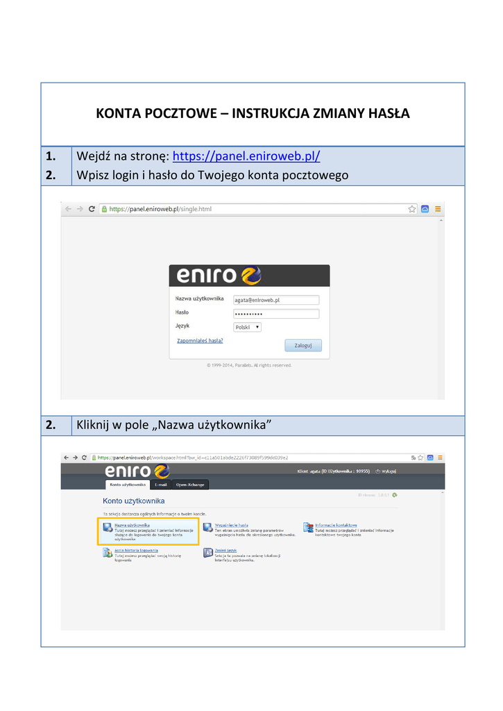 KONTA POCZTOWE – INSTRUKCJA ZMIANY HASŁA 1. 2. Wejdź na stronę: https://panel.eniroweb.pl/ Wpisz login i hasło do Twojego konta pocztowego 2. Kliknij w pole „Nazwa użytkownika” 3. Następnie kliknij w przycisk „Reset hasła” 4. Wpisz nowe hasło i zatwierdź klikając w przycisk „Wyślij” (hasło powinno zawierać minimum 7 znaków, wielkie i małe litery oraz znaki specjalne) 5. 6. Gotowe! Zaloguj się na swoje konto pocztowe: https://poczta.eniroweb.pl/ i upewnij się, że zmiany zostały zapisane