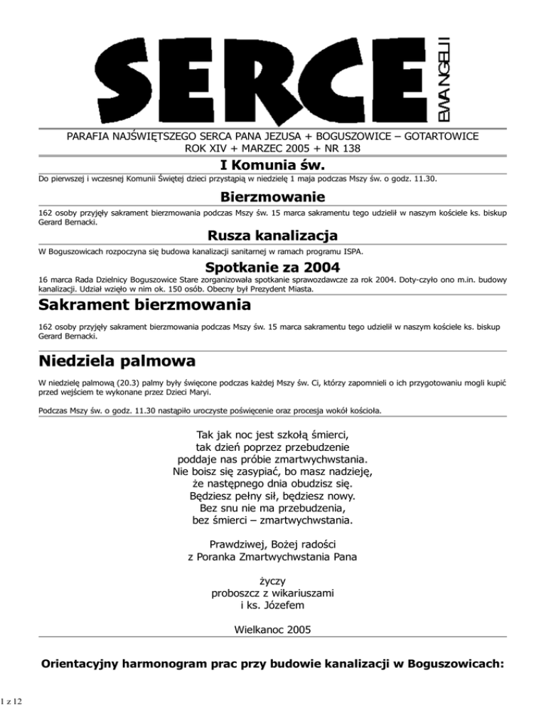 1 z 12 PARAFIA NAJŚWIĘTSZEGO SERCA PANA JEZUSA + BOGUSZOWICE – GOTARTOWICE ROK XIV + MARZEC 2005 + NR 138 Do pierwszej i wczesnej Komunii Świętej dzieci przystąpią w niedzielę 1 maja podczas Mszy św. o godz. 11.30. 162 osoby przyjęły sakrament bierzmowania podczas Mszy św. 15 marca sakramentu tego udzielił w naszym kościele ks. biskup Gerard Bernacki. W Boguszowicach rozpoczyna się budowa kanalizacji sanitarnej w ramach programu ISPA. 16 marca Rada Dzielnicy Boguszowice Stare zorganizowała spotkanie sprawozdawcze za rok 2004. Doty-czyło ono m.in. budowy kanalizacji. Udział wzięło w nim ok. 150 osób. Obecny był Prezydent Miasta. 162 osoby przyjęły sakrament bierzmowania podczas Mszy św. 15 marca sakramentu tego udzielił w naszym kościele ks. biskup Gerard Bernacki. W niedzielę palmową (20.3) palmy były święcone podczas każdej Mszy św. Ci, którzy zapomnieli o ich przygotowaniu mogli kupić przed wejściem te wykonane przez Dzieci Maryi. Podczas Mszy św. o godz. 11.30 nastąpiło uroczyste poświęcenie oraz procesja wokół kościoła. Tak jak noc jest szkołą śmierci, tak dzień poprzez przebudzenie poddaje nas próbie zmartwychwstania. Nie boisz się zasypiać, bo masz nadzieję, że następnego dnia obudzisz się. Będziesz pełny sił, będziesz nowy. Bez snu nie ma przebudzenia, bez śmierci – zmartwychwstania. Prawdziwej, Bożej radości z Poranka Zmartwychwstania Pana życzy proboszcz z wikariuszami i ks. Józefem Wielkanoc 2005 Orientacyjny harmonogram prac przy budowie kanalizacji w Boguszowicach: 2 z 12 · · · · · · · · · · · · · · · ul. Błękitna – marzec, maj, wrzesień 2005 Kolberga – marzec 2005 Ziemska, Jesienna – marzec, maj, lipiec 2005 Małachowskiego, Dunikowskiego – czerwiec 2005 Boguszowicka, Wiejska, Jemiołowa – lipiec 2005 Małachowskiego, Gotartowicka – lipiec 2005 Małachowskiego, Baczyńskiego, Gronowa – sierpień 2005 Spacerowa, Wąska, Sołtystwo – październik 2005 Kłokocińska, Małachowskiego – październik 2005 Urocza, Krótka, Baczyńskiego, Ogrodowa – styczeń 2006 Gronowa, Mokra – styczeń 2006 Baczyńskiego, Kłokocińska – marzec 2006 Rajska – sierpień, październik, grudzień 2006 Jemiołowa, Gronowa, Gotartowicka – marzec 2007 Boguszowicka – marzec 2007 Wraz z wiosną ruszą w Boguszowicach długo zapowiadane prace nad budową kanalizacji w ramach programu ISPA. Na pierwszy ogień pójdą ulice Błękitna, Kolberga Ziemska i Jesienna. Ostateczne zakończenie prac i uruchomienie całej inwestycji zaplanowano na rok 2007. W ramach budowy kanalizacji w Boguszowicach do ułożenia jest około 30 kilometrów rur oraz konieczna jest budowa 6 przepompowni ścieków. Prace zostaną przeprowadzone w ciągu najbliższych 30 miesięcy (2,5 roku), a ich koszt wyniesie około 4,5 mln euro (20 mln zł). W najbliższym czasie geodeci wyznaczą w terenie dokładny przebieg kanalizacji. Następnie do prac przystąpi firma wykonawcza. Każdy dom, na 2-3 dni przed rozpoczęciem robót, zostanie powiadomiony, kiedy w pobliżu posesji zostanie rozpoczęta budowa. Zawsze będzie możliwość dotarcia do domu. Niestety czasem tylko pieszo. Przez kilka najbardziej „gorących” dni nie będzie można dojechać do swojej posesji samochodem. Jeśli chce się z niego stale korzystać trzeba go więc będzie zawczasu umieścić u rodziny lub dalszych sąsiadów. Harmonogram prac jest jedynie orientacyjny i może ulegać pewnym zmianom. Wiadomo już, że z powodu ostrej zimy początek prac uległ opóźnieniu. Czytając harmonogram należy pamiętać, że budowa nie zawsze pokrywa się z jedną ulicą. Stąd prace w różnych częściach tej samem ulicy mogą być prowadzone w różnym czasie. Porządkowanie terenu po budowie - naprawa chodników i ulic - będzie dokonywana stopniowo i z pewnym opóźnieniem. Dopiero po zakończeniu prac na całym odcinku oraz po stwierdzeniu, że są one wykonane prawidłowo ulice otrzymają nowe nawierzchnie. Wcześniej będą naprawiane jedynie tymczasowo. Przyłączenia do kanalizacji oraz uruchomienie całej inwestycji nastąpi dopiero w roku 2007. Wtedy to zakończy się budowa 6 przepompowni oraz sieci m.in. na terenie Gotartowic oraz Ligockiej Kuźni, co pozwoli na odprowadzanie ścieków do orzepowickiej oczyszczalni. Wtedy także konieczne będzie dokonanie podłączenia budynku do nowej kanalizacji. Według stanu prawnego obowiązującego obecnie koszty przyłączenia obciążają właściciela posesji. Na sfinansowanie kosztów podłączenia do kanalizacji możliwe jest zaciągnięcie, na bardzo korzystnych warunkach, kredytu w Banku Ochrony Środowiska. Szczegółowych informacji w tej sprawie można uzyskać w Punkcie Informacji o Kanalizacji lub u przewodniczącego rady Dzielnicy Boguszowice pana Jana Mury. Dodatkowo wszystkich informacji o budowie kanalizacji można uzyskać w Punkcie Informacji o Kanalizacji mieszczącym się w Urzędzie Miasta Rybnika w pokoju nr 009 (parter starej części Urzędu) – telefon: 422-30-11, wew. 7019. Uwagi przyjmują także wszyscy członkowie Rady Dzielnicy Boguszowice Stare. Krystian Dziurok Serdecznie zapraszamy uczniów szkół podstawowych i gimnazjów do udziału w kolejnej – VI edycji regionalnego konkursu literackiego 3 z 12 Tematy prac konkursowych: · Moje marzenia o szczęśliwej rodzinie. · Czym jest Msza Święta w życiu chrześcijanina? Prace finałowe należy przesłać na adres: Jolanta Niebrzydowska, ul. Jastrzębska 17C/4, 44-253 Rybnik, do 20 maja 2005 roku. Uczestnictwo: · w konkursie biorą udział uczniowie szkół podstawowych i gimnazjów (Szkoły Podstawowe – klasy I – III; Szkoły Podstawowe – klasy IV – VI; Gimnazja) można zgłosić po 2 najlepsze prace w każdej grupie wiekowej i tematycznej; · · prace powinny zawierać; imię i nazwisko autora, klasę, dokładny adres szkoły, imię i nazwisko nauczyciela/opiekuna; · prace powinny być napisane przez ucznia sam