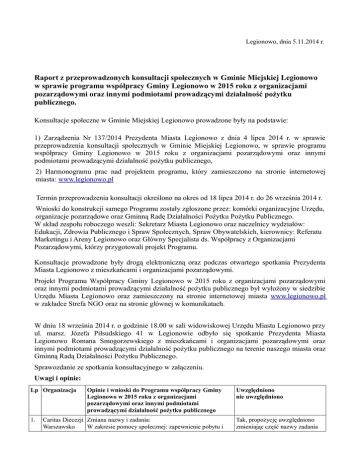 Legionowo, dnia 5.11.2014 r. Raport z przeprowadzonych konsultacji społecznych w Gminie Miejskiej Legionowo w sprawie programu współpracy Gminy Legionowo w 2015 roku z organizacjami pozarządowymi oraz innymi podmiotami prowadzącymi działalność pożytku publicznego. Konsultacje społeczne w Gminie Miejskiej Legionowo prowadzone były na podstawie: 1) Zarządzenia Nr 137/2014 Prezydenta Miasta Legionowo z dnia 4 lipca 2014 r. w sprawie przeprowadzenia konsultacji społecznych w Gminie Miejskiej Legionowo, w sprawie programu współpracy Gminy Legionowo w 2015 roku z organizacjami pozarządowymi oraz innymi podmiotami prowadzącymi działalność pożytku publicznego, 2) Harmonogramu prac nad projektem programu, który zamieszczono na stronie internetowej miasta: www.legionowo.pl Termin przeprowadzenia konsultacji określono na okres od 18 lipca 2014 r. do 26 września 2014 r. Wnioski do konstrukcji samego Programu zostały zgłoszone przez: komórki organizacyjne Urzędu, organizacje pozarządowe oraz Gminną Radę Działalności Pożytku Pożytku Publicznego. W skład zespołu roboczego weszli: Sekretarz Miasta Legionowo oraz naczelnicy wydziałów: Edukacji, Zdrowia Publicznego i Spraw Społecznych, Spraw Obywatelskich, kierownicy: Referatu Marketingu i Areny Legionowo oraz Główny Specjalista ds. Współpracy z Organizacjami Pozarządowymi, którzy przygotowali projekt Programu. Konsultacje prowadzone były drogą elektroniczną oraz podczas otwartego spotkania Prezydenta Miasta Legionowo z mieszkańcami i organizacjami pozarządowymi. Projekt Programu Współpracy Gminy Legionowo w 2015 roku z organizacjami pozarządowymi oraz innymi podmiotami prowadzącymi działalność pożytku publicznego był wyłożony w siedzibie Urzędu Miasta Legionowo oraz zamieszczony na stronie internetowej miasta www.legionowo.pl w zakładce Strefa NGO oraz na stronie głównej w komunikatach. W dniu 18 września 2014 r. o godzinie 18.00 w sali widowiskowej Urzędu Miasta Legionowo przy ul. marsz. Józefa Piłsudskiego 41 w Legionowie odbyło się spotkanie Prezydenta Miasta Legionowo Romana Smogorzewskiego z mieszkańcami i organizacjami pozarządowymi oraz innymi podmiotami prowadzącymi działalność pożytku publicznego na terenie naszego miasta oraz Gminną Radą Działalności Pożytku Publicznego. Sprawozdanie ze spotkania konsultacyjnego w załączeniu. Uwagi i opinie: Lp Organizacja 1. Opinie i wnioski do Programu współpracy Gminy Legionowo w 2015 roku z organizacjami pozarządowymi oraz innymi podmiotami prowadzącymi działalność pożytku publicznego Caritas Diecezji Zmiana nazwy i zadania: Warszawsko W zakresie pomocy społecznej: zapewnienie pobytu i Uwzględniono nie uwzględniono Tak, propozycję uwzględniono zmieniając część nazwy zadania Praskiej wsparcia dla 40 bezdomnych mężczyzn z terenu Legionowa w okresie od 01.01.2015 r.-31.12.2015r. 2. Artbale Stowarzyszenie Rozwoju Edukacji Kulturalnej i Sztuki 1. Zmiany zapisów dot. powiązania celów i zadań priorytetowych Programu: 2. wprowadzenie nowego zadania w zakresie promocji i organizacji wolontariatu, jak i działalności na rzecz organizacji pozarządowych przez organizację pozarządową w ramach działalności Legionowskiego Centrum Wspierania Organizacji Pozarządowych i Inicjatyw Lokalnych 3. Stowarzyszenie Wprowadzenie nowego zadania w zakresie wspierania i Legionowska upowszechniania kultury fizycznej: Akademia b) wśród dorosłych mieszkańców: taekwon-do Sportów Walki Tak, uwzględniono 4. UKS Concordia Wprowadzenie nowego zadania w zakresie wspierania i Zapasy upowszechniania kultury fizycznej Legionowo a) wśród dzieci i młodzieży: zapasy Tak, uwzględniono 5. Stowarzyszenie 1. Zadanie: „ Poradnictwo obywatelskie w formie działań Tak, uwzględniono zapisy i Pro Vobis informacyjno-doradczych, księgowości, szkolenia i wprowadzono do programu pkt 1 wsparcie dla nowopowstałych i potrzebujących tego pkt 3 , nie wprowadzono pkt 2 wsparcia organizacji pozarządowych, 2. w zakresie działalności na rzecz osób w wieku emerytalnym będących mieszkańcami Gminy Legionowo, nowe zadanie „mające na celu porozumienie między- pokoleniowe dziadkowie a wnuki” 3. w zakresie ochrony i promocji zdrowia: a) program informacyjno-edukacyjny na temat chorób zakaźnych występujących w otaczającym nas środowisku, takich jak wszawica, grzybica, boreliozaposzerzanie wiedzy na temat dróg zakażenia, objawów choroby i postępowania w przypadku narażenia na czynniki zakaźne oraz edukacja profilaktyczna b) edukacja prawna właścicieli i pracowników handlowych i gastronomicznych prowadzących sprzedaż napojów alkoholowych i środków farmaceutycznych dostępnych bez recepty, mająca na celu zmniejszenie sprzedaży i spożycia wśród dzieci i młodzieży: alkoholu, środków farmaceutycznych oraz środków odurzających 6. Stowarzyszenie 2) w zakresie przeciwdziałania uzależnieniom i Tak, uwzględniono Lepsze Dziś patologiom społecznym: (wprowadzenie nowych zapisów) a) działania o charakterze wspierającym i podtrzymującym osoby uzależnione będące w trakcie procesu terapeutycznego, osoby które zakończyły proces terapeutyczny, oraz działania o charakterze motywującym do podjęcia leczenia b) działania o charakterze profilaktycznym skierowane do młodzieży zagrożonej uzależnieniem c) integrowanie środowiska osób uzależnionych i działania o charakterze nauki konstruktywnego spędzania wolnego czasu Tak, uwzględniono postulowane przez Artbale zapisy podczas posiedzenia Gminnej Rady Działalności Pożytku Publicznego w dniu 20 października 2014r. 7 Oddział Rejonowy Polski Czerwony Krzyż W zakresie w zakresie ochrony i promocji zdrowia dopisanie do punktu a) krzewienie honorowego krwiodawstwa zapisu „i dawstwa szpiku kostnego” na terenie Gminy Legionowo Tak, uwzględniono 8. LTS Legionowo Proponuje wprowadzenie np. punktacji określającej wypełnienie konkretnych parametrów