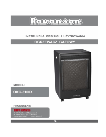 OSTRZEŻENIA ! ! - PRZED PRZYSTĄPIENIEM DO UŻYTKOWANIA OGRZEWACZA GAZOWEGO NALEŻY DOKŁADNIE ZAPOZNAĆ SIĘ Z TREŚCIĄ NINIEJSZEJ INSTRUKCJI, ZAWIERAJĄCEJ WSKAZÓWKI I ZALECENIA DOTYCZĄCE PRAWIDŁOWEGO UŻYTKOWANIA I OBSŁUGI - To urządzenie powinno być instalowane zgodnie z obowiązującym prawem - To urządzenie wymaga instalacji oraz konserwacji przeprowadzanej przez kompetentną osobę - Używaj wyłącznie w dobrze wentlowanym pomieszczeniu - Ten ogrzewacz musi mieć zapewniony dopływ świeżego powietrza w przeciwnym wypadku proces spalania nie będzie przebiegał w sposób właściwy - W małych pomieszczeniach należy zastosować dodatkową wentylację - To urządzenie powinno być używane wyłącznie do ogrzewania przestrzeni - To urządzenie nie powinno być używane w piwnicach oraz pomieszczeniach znajdujących się poniżej gruntu. Nie wolno go również używać w wielopiętrowych blokach. - Urządzenie to wymaga stosowania węża i reduktora. Skontaktuj się ze swoim dostawcą gazu. - Nie można umieszczać jakichkolwiek rzeczy na tym urządzeniu lub obok niego - W pobliżu urządzenia nie wolno przechowywać chemikaliów, materiałów łatwopalnych lub aerozoli - Nie wolno używać tego urządzenia w miejscach , gdzie unoszą się opary lub pył z substancji łatwopalnych. Nie wolno również stosować go w miejscach gdzie składuje się benzynę lub inne łatwopalne materiały. - Urządzenie to powinno być instalowane zgodnie z obowiązującym prawem i używane tylko w dobrze wentylowanych pomieszczeniach - Nie można używać urządzenia w przyczepach i pojazdach kempingowych ! OSTRZEŻENIE ! ·- W przypadku wyczucia zapachu gazu należy natychmiast zakręcić wszystkie zawory gazu. Zarówno zawór znajdujący się na urządzeniu jak i na butli. - Należy zgasić (wyłączyć) każdy otwarty płomień. - Nie wolno włączać jakiegokolwiek urządzenia. - Nie należy dotykać żadnego włącznika elektrycznego. - Nie wolno używać telefonu w budynku. - Natychmiast wezwać swojego dostawcę gazu, telefonując od sąsiada. Należy zastosować się do instrukcji dostawcy gazu. - Jeśli kontakt z dostawcą gazu jest niemożliwy, proszę wezwać straż pożarną. ! OSTRZEŻENIE ! Użytkownik bierze na siebie wszelkie ryzyko montażu i obsługi ogrzewacza gazowego. Niezastosowanie się do ostrzeżeń i wskazówek z instrukcji może spowodować poważne obrażenia cielesne, śmierć lub straty materialne. Jeśli użytkownik nie może przeczytać lub w pełni zrozumieć instrukcji, powinien skontaktować się ze sprzedawcą. Dostawca nie odpowiada za niedbalstwo użytkownika. UWAGA Proszę przeczytać uważnie całą instrukcję przed próbami montażu, uruchamiania lub obsługi tego ogrzewacza. Niewłaściwe użytkowanie tego ogrzewacza może spowodować poważne obrażenia lub śmierć wskutek poparzeń, wybuchu pożaru, porażenia prądem oraz zatrucia tlenkiem węgla. • Urządzenie to musi być instalowane zgodnie z obowiązującym prawem. • Instalacja powinna zostać wykonane przez wykwalifikowaną osobę. • Wszelkie naprawy należy przeprowadzać w autoryzowanym serwisie. • Niewłaściwa instalacja, regulacja, przeróbka, mogą spowodować obrażenia cielesne lub stratę materialną. • Nie wolno podejmować prób przeróbki urządzenia w jakikolwiek sposób. • Nie wolno w żadnym wypadku wymieniać reduktora na inny niż zalecany przez producenta ogrzewacza. Właściwe parametry zasilania urządzenia podane są na tabliczce znamionowej. • Przed użyciem należy usunąć wszystkie zabezpieczenie ochronne założone na czas transportu. • W żadnym wypadku nie wolno instalować lub używać ogrzewacza w żadnym z wymienionych miejsc: - Sypialnia lub łazienka - Samochód lub przyczepa kempingowa - W miejscach, gdzie zasłony, meble, odzież, lub inne przedmioty łatwopalne są w odległości mniejszej niż 2 m od przodu, górnej powierzchni lub boków ogrzewacza - Kominek - Pomieszczenia i miejsca, w których urządzenie będzie narażone na bezpośrednie oddziaływanie wiatru lub przeciągu - Miejsca o dużym natężeniu ruchu - Sutereny lub pomieszczenia znajdujące się poniżej poziomu terenu - Budynki wielopoziomowe • Ten ogrzewacz wymaga do właściwego działania wentylacji w postaci świeżego powietrza z zewnątrz. Posiada on system bezpieczeństwa w postaci płomyka analizatora spalin, reagującego na zmniejszenie się zawartości tlenu w powietrzu. System ten wyłączy ogrzewacz, jeśli zawartość tlenu nie będzie wystarczająca do prawidłowej pracy urządzenia. System ten zapobiega gromadzeniu się w pomieszczeniu nadmiernej ilości takich produktów spalania jak CO2 czy CO (tzw. czadu). • W żadnym wypadku nie wolno uruchamiać grzejnika w zamkniętych pomieszczeniach. W czasie pracy urządzenie wprowadza do pomieszczenia, w którym jest użytkowane produkty spalania dlatego tak istotny jest napływ świeżego powietrza. • Jeśli ogrzewacz się wyłącza, proszę nie zapalać go ponownie do momentu zapewnienia dopływu świeżego powietrza. Jeśli ogrzewacz pozostaje wyłączony, proszę zwrócić się do serwisu. • Do zasilania urządzenia nie wolno używać gazu ziemnego. Urządzenie jest zaprojektowane do zasilania gazem LPG propan-butan (G30 36/37mbar I3B/P). • Nie podłączać urządzenia bezpośrednio do butli gazowej. Urządzenie wymaga stosowania reduktora o ciśnieniu wyjściowym 36/37mbar • Nie wolno składować lub używać w pobliżu ogrzewacza benzyny ani innych gazów i cieczy łatwopalnych . • Przed użyciem cały system gazowy, wężyk, regulator, reduktor, świeca analizatora spalin lub palniki powinny zostać sprawdzone na obecność wycieków lub uszkodzenia, oraz co najmniej raz na rok, przez wykwalifikowanego serwisanta. • Wszelkie próby na obecność wycieków powinny być wykonane mieszaniną wody z mydłem lub za pomocą specjalistycznego sprzętu pomiarowego. W celu wykrycia ewentualnych wyc