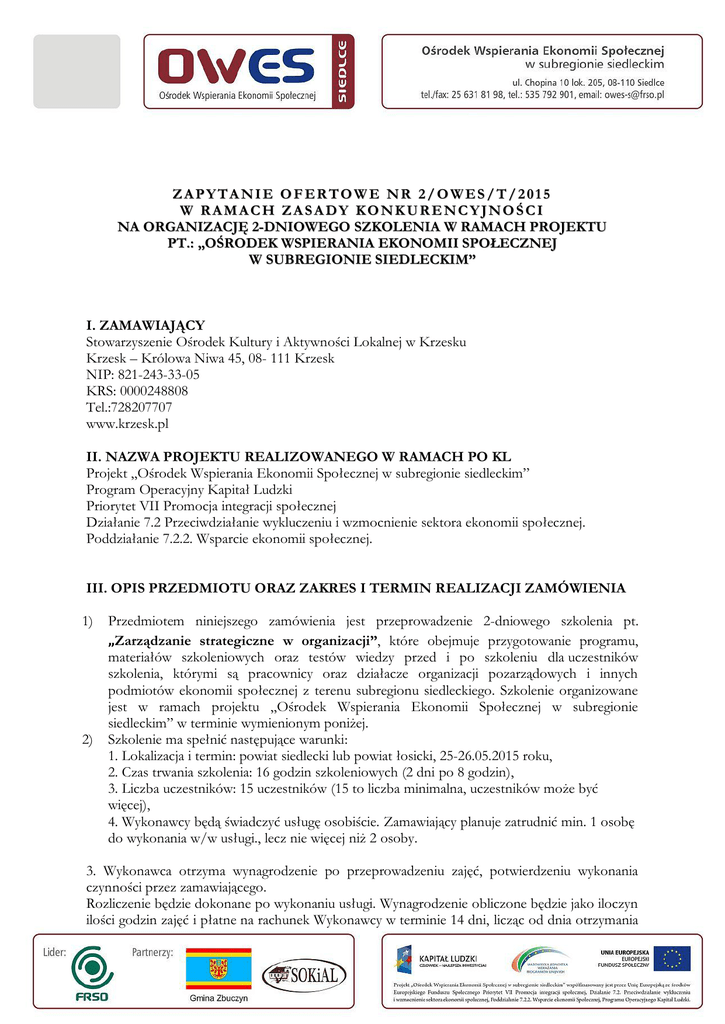ZAPYTANIE OF ERTOWE NR 2/OWES/T/201 5 W RAMACH ZASADY KONKURENCYJNOŚCI NA ORGANIZACJĘ 2-DNIOWEGO SZKOLENIA W RAMACH PROJEKTU PT.: „OŚRODEK WSPIERANIA EKONOMII SPOŁECZNEJ W SUBREGIONIE SIEDLECKIM” I. ZAMAWIAJĄCY Stowarzyszenie Ośrodek Kultury i Aktywności Lokalnej w Krzesku Krzesk – Królowa Niwa 45, 08- 111 Krzesk NIP: 821-243-33-05 KRS: 0000248808 Tel.:728207707 www.krzesk.pl II. NAZWA PROJEKTU REALIZOWANEGO W RAMACH PO KL Projekt „Ośrodek Wspierania Ekonomii Społecznej w subregionie siedleckim” Program Operacyjny Kapitał Ludzki Priorytet VII Promocja integracji społecznej Działanie 7.2 Przeciwdziałanie wykluczeniu i wzmocnienie sektora ekonomii społecznej. Poddziałanie 7.2.2. Wsparcie ekonomii społecznej. III. OPIS PRZEDMIOTU ORAZ ZAKRES I TERMIN REALIZACJI ZAMÓWIENIA 1) 2) Przedmiotem niniejszego zamówienia jest przeprowadzenie 2-dniowego szkolenia pt. „Zarządzanie strategiczne w organizacji”, które obejmuje przygotowanie programu, materiałów szkoleniowych oraz testów wiedzy przed i po szkoleniu dla uczestników szkolenia, którymi są pracownicy oraz działacze organizacji pozarządowych i innych podmiotów ekonomii społecznej z terenu subregionu siedleckiego. Szkolenie organizowane jest w ramach projektu „Ośrodek Wspierania Ekonomii Społecznej w subregionie siedleckim” w terminie wymienionym poniżej. Szkolenie ma spełnić następujące warunki: 1. Lokalizacja i termin: powiat siedlecki lub powiat łosicki, 25-26.05.2015 roku, 2. Czas trwania szkolenia: 16 godzin szkoleniowych (2 dni po 8 godzin), 3. Liczba uczestników: 15 uczestników (15 to liczba minimalna, uczestników może być więcej), 4. Wykonawcy będą świadczyć usługę osobiście. Zamawiający planuje zatrudnić min. 1 osobę do wykonania w/w usługi., lecz nie więcej niż 2 osoby. 3. Wykonawca otrzyma wynagrodzenie po przeprowadzeniu zajęć, potwierdzeniu wykonania czynności przez zamawiającego. Rozliczenie będzie dokonane po wykonaniu usługi. Wynagrodzenie obliczone będzie jako iloczyn ilości godzin zajęć i płatne na rachunek Wykonawcy w terminie 14 dni, licząc od dnia otrzymania przez Zamawiającego prawidłowego pod względem formalnym i merytorycznym rachunku/faktury. W przypadku braku środków na rachunku projektu Zamawiający skontaktuje się z Wykonawcą celem wspólnego ustalenia innego terminu płatności. 4. Wspólny Słownik Zamówień (CPV): - 80500000-9 - usługi szkoleniowe 5. Z wybranym Wykonawcą zostanie podpisana umowa. 6. Wykonawca powinien prowadzić zajęcia w oparciu o ramowy program szkolenia oraz opracować komplet własnych materiałów autorskich niezbędnych do zagwarantowania wysokiej jakości dydaktycznej prowadzonych zajęć. Zamawiający zapewnia: bazę dydaktyczną i sprzęt komputery, projektor, flip-chart, bloki do flip-charta, pisaki oraz inne pomoce dydaktyczne (w miarę potrzeb i możliwości), a także warunki zgodne z przepisami BHP w trakcie trwania szkolenia. Zamawiający zapewnia materiały szkoleniowe dla uczestników – kopie materiałów autorskich przygotowanych przez szkoleniowca, teczka, notatnik, długopis i inne w miarę potrzeb. IV. WYMAGANIA I WARUNKI ZAMAWIAJĄCEGO O udzielenie zamówienia mogą ubiegać się Wykonawcy, którzy posiadają doświadczenie, umiejętności i wiedzę z zakresu tematyki szkolenia, nie są powiązani osobowo lub kapitałowo z zamawiającym, zobowiązują się do samodzielnego wykonania zamówienia oraz: a) Posiadają wykształcenie wyższe, b) Posiadają doświadczenie zawodowe w zakresie przygotowywania dokumentów planistycznych dla podmiotów ekonomii społecznej/strategii rozwoju regionalnego lub lokalnego w obszarach związanych z ekonomią społeczną (np. kultura, społeczeństwo obywatelskie, turystyka, itp.), c) Znają specyfikę funkcjonowania ekonomii społecznej w województwie mazowieckim, d) Posiadają niezbędne umiejętności techniczne związane z prowadzeniem szkoleń i odpowiednich środków dydaktycznych, e) Akceptują treść zapytania bez zastrzeżeń, przy czym złożenie oferty jest uważane za akceptację treści zapytania, f) Wypełnią i złożą w terminie ofertę – Załącznik nr 1 do Zapytania ofertowego. g) Z możliwości realizacji zamówienia wykluczeni są Wykonawcy powiązani osobowo lub kapitałowo z Zamawiającym lub z osobami upoważnionymi do zaciągania zobowiązań w imieniu Zamawiającego lub z osobami wykonującymi w imieniu Zamawiającego czynności związane z przygotowaniem i przeprowadzeniem procedury wyboru Wykonawcy, w szczególności poprzez: uczestnictwo w spółce jako wspólnik spółki cywilnej lub spółki osobowej, posiadanie udziałów lub co najmniej 10% akcji, pełnienie funkcji członka organu nadzorczego lub zarządzającego, prokurenta, pełnomocnika pozostawanie w związku małżeńskim, w stosunku pokrewieństwa lub powinowactwa w linii prostej, bocznej drugiego stopnia lub w stosunku przysposobienia, opieki lub kurateli. Oferta powinna zawierać: Dane osobowe oferenta Cenę jednostkową brutto za jedną godzinę szkoleniową Termin ważności oferty V. KRYTERIA WYBORU WYKONAWCY 1) Zgodność zakresu oferowanej usługi z opisem przedmiotu zamówienia, zgodność złożonej oferty z opisem zawartości – warunek formalny. Niespełnienie przez Wykonawcę tych warunków powoduje odrzucenie złożonej oferty. 2) Kryterium wyboru oferty najkorzystniejszej będzie cena rozumiana jako cena jednostkowa brutto za jedną godzinę lekcyjną świadczenia usługi szkoleniowej oraz doświadczenie wykonawcy (80%/20%). 3) Kryteria wyboru: 1. Cena – 80 pkt. Oferta z najniższą ceną otrzyma maksymalną liczbę punktów w ramach kryterium. Zastosowany wzór do obliczenia punktowego: cena najniższa ocena oferty = ---------------------- x 80 pkt. cena badana gdzie: cena najniższa – najniższa wartość brutto spośród ofert nieodrzuconych, cena badana – wartość brutto oferty badanej. 2. Doświadczenie trenerskie w latach 