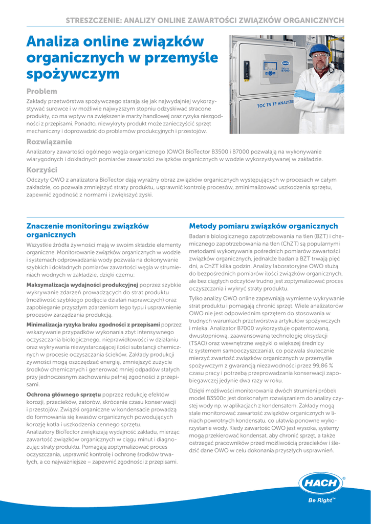 STRESZCZENIE: ANALIZY ONLINE ZAWARTOŚCI ZWIĄZKÓW ORGANICZNYCH Analiza online związków organicznych w przemyśle spożywczym Problem Zakłady przetwórstwa spożywczego starają się jak najwydajniej wykorzystywać surowce i w możliwie najwyższym stopniu odzyskiwać stracone produkty, co ma wpływ na zwiększenie marży handlowej oraz ryzyka niezgodności z przepisami. Ponadto, niewykryty produkt może zanieczyścić sprzęt mechaniczny i doprowadzić do problemów produkcyjnych i przestojów. Rozwiązanie Analizatory zawartości ogólnego węgla organicznego (OWO) BioTector B3500 i B7000 pozwalają na wykonywanie wiarygodnych i dokładnych pomiarów zawartości związków organicznych w wodzie wykorzystywanej w zakładzie. Korzyści Odczyty OWO z analizatora BioTector dają wyraźny obraz związków organicznych występujących w procesach w całym zakładzie, co pozwala zmniejszyć straty produktu, usprawnić kontrolę procesów, zminimalizować uszkodzenia sprzętu, zapewnić zgodność z normami i zwiększyć zyski. Znaczenie monitoringu związków organicznych Wszystkie źródła żywności mają w swoim składzie elementy organiczne. Monitorowanie związków organicznych w wodzie i systemach odprowadzania wody pozwala na dokonywanie szybkich i dokładnych pomiarów zawartości węgla w strumieniach wodnych w zakładzie, dzięki czemu: Maksymalizacja wydajności produkcyjnej poprzez szybkie wykrywanie zdarzeń prowadzących do strat produktu (możliwość szybkiego podjęcia działań naprawczych) oraz zapobieganie przyszłym zdarzeniom tego typu i usprawnienie procesów zarządzania produkcją. Minimalizacja ryzyka braku zgodności z przepisami poprzez wskazywanie przypadków wykonania zbyt intensywnego oczyszczania biologicznego, nieprawidłowości w działaniu oraz wykrywania niewystarczającej ilości substancji chemicznych w procesie oczyszczania ścieków. Zakłady produkcji żywności mogą oszczędzać energię, zmniejszyć zużycie środków chemicznych i generować mniej odpadów stałych przy jednoczesnym zachowaniu pełnej zgodności z przepisami. Ochrona głównego sprzętu poprzez redukcję efektów korozji, przecieków, zatorów, skrócenie czasu konserwacji i przestojów. Związki organiczne w kondensacie prowadzą do formowania się kwasów organicznych powodujących korozję kotła i uszkodzenia cennego sprzętu. Analizatory BioTector zwiększają wydajność zakładu, mierząc zawartość związków organicznych w ciągu minut i diagnozując straty produktu. Pomagają zoptymalizować proces oczyszczania, usprawnić kontrolę i ochronę środków trwałych, a co najważniejsze – zapewnić zgodności z przepisami. Metody pomiaru związków organicznych Badania biologicznego zapotrzebowania na tlen (BZT) i chemicznego zapotrzebowania na tlen (ChZT) są popularnymi metodami wykonywania pośrednich pomiarów zawartości związków organicznych, jednakże badania BZT trwają pięć dni, a ChZT kilka godzin. Analizy laboratoryjne OWO służą do bezpośrednich pomiarów ilości związków organicznych, ale bez ciągłych odczytów trudno jest zoptymalizować proces oczyszczania i wykryć straty produktu. Tylko analizy OWO online zapewniają wymierne wykrywanie strat produktu i pomagają chronić sprzęt. Wiele analizatorów OWO nie jest odpowiednim sprzętem do stosowania w trudnych warunkach przetwórstwa artykułów spożywczych i mleka. Analizator B7000 wykorzystuje opatentowaną, dwustopniową, zaawansowaną technologię oksydacji (TSAO) oraz wewnętrzne wężyki o większej średnicy (z systemem samooczyszczania), co pozwala skutecznie mierzyć zwartość związków organicznych w przemyśle spożywczym z gwarancją niezawodności przez 99,86 % czasu pracy i potrzebą przeprowadzania konserwacji zapobiegawczej jedynie dwa razy w roku. Dzięki możliwości monitorowania dwóch strumieni próbek model B3500c jest doskonałym rozwiązaniem do analizy czystej wody np. w aplikacjach z kondensatem. Zakłady mogą stale monitorować zawartość związków organicznych w liniach powrotnych kondensatu, co ułatwia ponowne wykorzystanie wody. Kiedy zawartość OWO jest wysoka, systemy mogą przekierować kondensat, aby chronić sprzęt, a także ostrzegać pracowników przed możliwością przecieków i śledzić dane OWO w celu dokonania przyszłych usprawnień. STRESZCZENIE: ANALIZY ONLINE ZAWARTOŚCI ZWIĄZKÓW ORGANICZNYCH Wybierz indywidualne rozwiązania monitoringu zawartości związków organicznych. B7000i Typowa aplikacja Zakres OWO • Sterowanie procesami przemysłowymi • Wlot i wylot oczyszczalni ścieków • Nabiał B3500e • Wylot z oczyszczalni ścieków przemysłowych • Wylot oczyszczalni ścieków komunalnych B3500c • Linia powrotna kondensatu • Woda chłodząca • Woda demineralizowana 0 - 100 do 0 - 20.000 ppm 0 - 250 lub 1.000 ppm 0 - 25 lub 100 ppm TIC/TOC, TC, VOC BOD/COD po skorelowaniu TN oraz TP dostępne w B7000 TIC/TOC, TC BZT/ChZT po skorelowaniu TIC/TOC, TC, VOC BZT/ChZT po skorelowaniu Tak Tak Tak Wężyki reaktora i próbki Rurki reaktora i próbki Reaktor Charakterystyka próbki Cząsteczki <2 mm Brudne Tłuszcz, olej, smary, osad i sole Wahania pH Cząsteczki <100 µm Częściowo zanieczyszczone Niektóre tłuszcze, oleje, smary, osad Niektóre wahania pH Cząsteczki <100 µm Czyste Bez tłuszczy, oleju, smarów, stabilne pH Liczba strumieni 6 1 2 Tryb OWO Dwuetapowe zaawansowane utlanianie Samooczyszczanie 1.250 mm × 750 mm × 320 mm 750 mm × 500 mm × 320 mm 750 mm × 500 mm × 320 mm (49,21 cal × 29,53 cal × 12,60 cal) (29,52 cal × 19,68 cal × 12,59 cal) (29.5 cal × 19.7 cal × 12.6 cal) Certyfikacja Serwis i wsparcie techniczne Hach® Analizator OWO BiotTector został zaprojektowany w sposób umożliwiający wykorzystanie go w trudnym środowisku ścieków przemysłowych. Niezależna agencja ochrony środowiska poświadcza, że podczas 3-miesięcznych testów w oczyszczalni ścieków przemysłowych urządzenie wy
