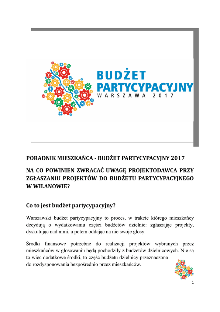 PORADNIK MIESZKAŃCA - BUDŻET PARTYCYPACYJNY 2017 NA CO POWINIEN ZWRACAĆ UWAGĘ PROJEKTODAWCA PRZY ZGŁASZANIU PROJEKTÓW DO BUDŻETU PARTYCYPACYJNEGO W WILANOWIE? Co to jest budżet partycypacyjny? Warszawski budżet partycypacyjny to proces, w trakcie którego mieszkańcy decydują o wydatkowaniu części budżetów dzielnic: zgłaszając projekty, dyskutując nad nimi, a potem oddając na nie swoje głosy. Środki finansowe potrzebne do realizacji projektów wybranych przez mieszkańców w głosowaniu będą pochodziły z budżetów dzielnicowych. Nie są to więc dodatkowe środki, to część budżetu dzielnicy przeznaczona do rozdysponowania bezpośrednio przez mieszkańców. 1 W tegorocznej edycji budżetu partycypacyjnego (na rok 2017), decyzją Zarządu Dzielnicy Wilanów m.st. Warszawy, do dyspozycji w naszej dzielnicy będzie kwota wynosząca 1 200 000 zł. Dzielnica została podzielona na dwa obszary terytorialne (podział widoczny jest na mapie załączonej do poradnika). Ustalono możliwość zgłaszania projektów jedynie o charakterze lokalnym. Każdy z obszarów otrzymał równą kwotę tj. 600 000 zł. Jednocześnie ustalony został górny limit wartości jednego projektu, który wynosi 300 000zł. Jakie projekty można zgłosić? Projekt możliwy do realizacji w ramach budżetu partycypacyjnego w m.st. Warszawie na rok 2017 musi spełniać następujące warunki: • • • • • • • musi być możliwy do zrealizowania w ciągu jednego roku (w 2017 roku, w roku 2016 możliwe jest przeprowadzenie prostych prac przygotowawczych), z efektu ewentualnej realizacji projektu powinni móc korzystać wszyscy mieszkańcy Warszawy, powinien być zlokalizowany na terenie ogólnodostępnym, projekt musi mieścić się w zadaniach własnych m.st. Warszawy, przypisanych do realizacji dzielnicom lub jednostkom organizacyjnym m.st. Warszawy (np. ZDM, ZOM), nie może być projektem częściowym – powinien zakładać realizację zadania w takim zakresie, aby jego wykonanie nie wymagało przeprowadzenia dodatkowych prac w kolejnych latach (np.: nie będą realizowane projekty zakładające wykonanie wyłącznie dokumentacji projektowej, czy tylko jednej z wielu części większego zadania; w przypadku projektów inwestycyjnych musi być możliwe dokonanie wszelkich niezbędnych odbiorów w roku 2017), musi być zgodny ze strategiami i programami przyjętymi do realizacji przez m.st. Warszawę, całkowity koszt realizacji projektu musi mieścić się w puli dostępnej na w danym obszarze terytorialnym. Należy pamiętać o tym, że zadania możliwe do realizacji w ramach budżetu partycypacyjnego muszą spełniać kryterium użyteczności 2 publicznej wynikające z charakteru zadań własnych gminy – dostęp do efektu ich realizacji nie może być ograniczony. HARMONOGRAM: • • • • • • • zgłaszanie projektów – od 16 listopada 2015 r. do 15 stycznia 2016 r. dyskusje na projektami – od 15 lutego do 6 marca 2016 r. weryfikacja zgłoszonych projektów – od 14 marca do 31 maja 2016 r. losowanie kolejności projektów na listach – do 2 czerwca 2016 r. spotkania z autorami projektów, które znajdą się na liście do głosowania – do 24 czerwca 2016 r. głosowanie – od 14 do 24 czerwca 2016 r. ogłoszenie listy projektów do realizacji – do 15 lipca 2016 r. PRIORYTETY INWESTYCYJNE DZIELNICY NA 2016 ROK : 1. Budowa ul. Zdrowej na odc. Wilanowska - droga L4 wraz z budową mostka, połączeniem z al. Rzeczypospolitej oraz fragmentami ulic L3 i L4. 2. Budowa ul. Nowokabackiej - etap II. 3. Budowa szkoły podstawowej wraz z zapleczem sportowym przy ul. św. Urszuli Ledóchowskiej. 4. Budowa przedszkola wraz z infrastrukturą przy ul. Zdrowej. 5. Budowa kompleksu boisk w Zespole Szkolno-Przedszkolnym nr 3 przy ul. Przyczółkowej 27. 6. Budowa szkoły podstawowej i gimnazjum w Miasteczku Wilanów. 7. Budowa Międzypokoleniowego Centrum Edukacji przy ul. Radosnej 11. 8. Zakup czujników do budynku Urzędu Dzielnicy w ramach projektu „Wysoce innowacyjne narzędzia kontroli budynków 3 w zakresie efektywności GAP”. 9. Przebudowa ulicy Bruzdowej wraz z infrastrukturą od POW do ul. Prętowej. 10. Przebudowa ulicy Jarej wraz z infrastrukturą na odcinku od skrzyżowania z ul. Bruzdową (wraz ze skrzyżowaniem) do Wału Zawadowskiego. 11. Budowa drogi oznaczonej w MPZP osiedla Arbuzowa – bis – Rzodkiewki symbolem L3 wraz infrastrukturą. 12. Budowa drogi oznaczonej w MPZP Powsin – Zamość symbolem 24KUD wraz z infrastrukturą. 13. Budowa wraz infrastrukturą drogi oznaczonej w MPZP osiedla Arbuzowa- bis -Rzodkiewki symbolem L4. 14. Budowa wraz z infrastrukturą drogi oznaczonej w MPZP Zawad i Kępy Zawadowskiej symbolem 37KUD. INFORMACJE DOTYCZĄCE WŁASNOŚCI GRUNTÓW i PLANÓW MIEJSCOWYCH W DZIELNICY WILANÓW: Zgodnie z uchwałą Zarządu Dzielnicy Wilanów w sprawie określenia szczegółowych zasad przeprowadzenia budżetu partycypacyjnego w dzielnicy Wilanów na rok 2017 dopuszcza się możliwość zgłaszania projektów na terenach będących we władaniu m.st. Warszawy. W przypadku składania projektów inwestycyjnych oznacza to, że muszą dotyczyć terenów i obiektów stanowiących własność m.st. Warszawy. W pozostałych przypadkach – nie ma takich ograniczeń. UWAGA! Teren tzw. Plaży Wilanów nie należy do m.st. Warszawy. Docelowe zagospodarowanie tego terenu będzie możliwe dopiero po uzyskaniu tego gruntu na własność przez m.st Warszawa. W Dzielnicy Wilanów wiele gruntów należy do prywatnych inwestorów lub wspólnot mieszkaniowych. Aby upewnić się, czy będzie możliwa realizacja danego projektu, należy zajrzeć do mapy 4 własności gruntów Dzielnicy Wilanów m.st. Warszawy, dostępnej w Serwisie Mapowym m.st. Warszawy pod adresem: http://www.mapa.um.warszawa.pl/ w dziale „własność” – bezpośredni odnośnik: http://mapa.um.warszawa.pl/mapaApp1/mapa?service=mapa_wlasnosci Składając projekty do budżetu partycypac