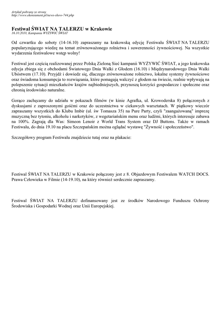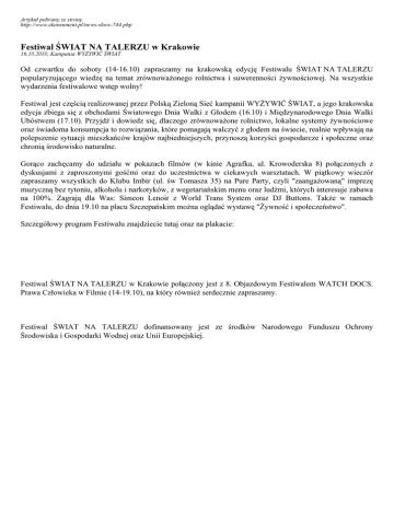 Artykuł pobrany ze strony http://www.ekonsument.pl/news-show-744.php Festiwal ŚWIAT NA TALERZU w Krakowie 16.10.2010, Kampania WYŻYWIĆ ŚWIAT Od czwartku do soboty (14-16.10) zapraszamy na krakowską edycję Festiwalu ŚWIAT NA TALERZU popularyzującego wiedzę na temat zrównoważonego rolnictwa i suwerenności żywnościowej. Na wszystkie wydarzenia festiwalowe wstęp wolny! Festiwal jest częścią realizowanej przez Polską Zieloną Sieć kampanii WYŻYWIĆ ŚWIAT, a jego krakowska edycja zbiega się z obchodami Światowego Dnia Walki z Głodem (16.10) i Międzynarodowego Dnia Walki Ubóstwem (17.10). Przyjdź i dowiedz się, dlaczego zrównoważone rolnictwo, lokalne systemy żywnościowe oraz świadoma konsumpcja to rozwiązania, które pomagają walczyć z głodem na świecie, realnie wpływają na polepszenie sytuacji mieszkańców krajów najbiedniejszych, przynoszą korzyści gospodarcze i społeczne oraz chronią środowisko naturalne. Gorąco zachęcamy do udziału w pokazach filmów (w kinie Agrafka, ul. Krowoderska 8) połączonych z dyskusjami z zaproszonymi gośćmi oraz do uczestnictwa w ciekawych warsztatach. W piątkowy wieczór zapraszamy wszystkich do Klubu Imbir (ul. św Tomasza 35) na Pure Party, czyli "zaangażowaną" imprezę muzyczną bez tytoniu, alkoholu i narkotyków, z wegetariańskim menu oraz ludźmi, których interesuje zabawa na 100%. Zagrają dla Was: Simeon Lenoir z World Trans System oraz DJ Buttons. Także w ramach Festiwalu, do dnia 19.10 na placu Szczepańskim można oglądać wystawę "Żywność i społeczeństwo". Szczegółowy program Festiwalu znajdziecie tutaj oraz na plakacie: Festiwal ŚWIAT NA TALERZU w Krakowie połączony jest z 8. Objazdowym Festiwalem WATCH DOCS. Prawa Człowieka w Filmie (14-19.10), na który również serdecznie zapraszamy. Festiwal ŚWIAT NA TALERZU dofinansowany jest ze środków Narodowego Funduszu Ochrony Środowiska i Gospodarki Wodnej oraz Unii Europejskiej.