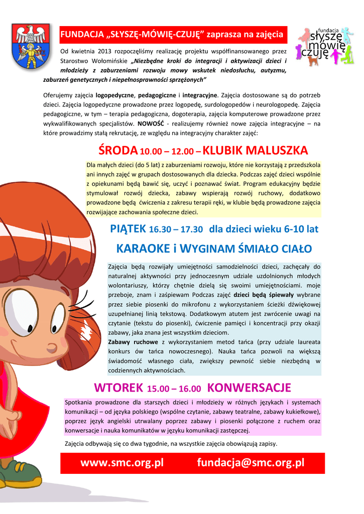FUNDACJA „SŁYSZĘ-MÓWIĘ-CZUJĘ” zaprasza na zajęcia Od kwietnia 2013 rozpoczęliśmy realizację projektu współfinansowanego przez Starostwo Wołomińskie „Niezbędne kroki do integracji i aktywizacji dzieci i młodzieży z zaburzeniami rozwoju mowy wskutek niedosłuchu, autyzmu, zaburzeń genetycznych i niepełnosprawności sprzężonych” Oferujemy zajęcia logopedyczne, pedagogiczne i integracyjne. Zajęcia dostosowane są do potrzeb dzieci. Zajęcia logopedyczne prowadzone przez logopedę, surdologopedów i neurologopedę. Zajęcia pedagogiczne, w tym – terapia pedagogiczna, dogoterapia, zajęcia komputerowe prowadzone przez wykwalifikowanych specjalistów. NOWOŚĆ - realizujemy również nowe zajęcia integracyjne – na które prowadzimy stałą rekrutację, ze względu na integracyjny charakter zajęć: ŚRODA 10.00 – 12.00 – KLUBIK MALUSZKA Dla małych dzieci (do 5 lat) z zaburzeniami rozwoju, które nie korzystają z przedszkola ani innych zajęć w grupach dostosowanych dla dziecka. Podczas zajęć dzieci wspólnie z opiekunami będą bawić się, uczyć i poznawać świat. Program edukacyjny będzie stymulował rozwój dziecka, zabawy wspierają rozwój ruchowy, dodatkowo prowadzone będą ćwiczenia z zakresu terapii ręki, w klubie będą prowadzone zajęcia rozwijające zachowania społeczne dzieci. PIĄTEK 16.30 – 17.30 dla dzieci wieku 6-10 lat KARAOKE i WYGINAM ŚMIAŁO CIAŁO Zajęcia będą rozwijały umiejętności samodzielności dzieci, zachęcały do naturalnej aktywności przy jednoczesnym udziale uzdolnionych młodych wolontariuszy, którzy chętnie dzielą się swoimi umiejętnościami. moje przeboje, znam i zaśpiewam Podczas zajęć dzieci będą śpiewały wybrane przez siebie piosenki do mikrofonu z wykorzystaniem ścieżki dźwiękowej uzupełnianej linią tekstową. Dodatkowym atutem jest zwrócenie uwagi na czytanie (tekstu do piosenki), ćwiczenie pamięci i koncentracji przy okazji zabawy, jaka znana jest wszystkim dzieciom. Zabawy ruchowe z wykorzystaniem metod tańca (przy udziale laureata konkurs ów tańca nowoczesnego). Nauka tańca pozwoli na większą świadomość własnego ciała, zwiększy pewność siebie niezbędną w codziennych aktywnościach. WTOREK 15.00 – 16.00 KONWERSACJE Spotkania prowadzone dla starszych dzieci i młodzieży w różnych językach i systemach komunikacji – od języka polskiego (wspólne czytanie, zabawy teatralne, zabawy kukiełkowe), poprzez język angielski utrwalany poprzez zabawy i piosenki połączone z ruchem oraz konwersacje i nauka komunikatów w języku komunikacji zastępczej. Zajęcia odbywają się co dwa tygodnie, na wszystkie zajęcia obowiązują zapisy. www.smc.org.pl [email protected]