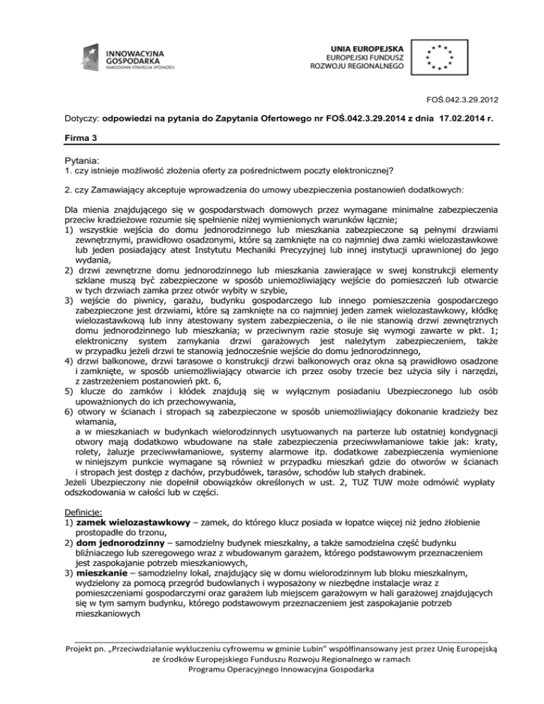 FOŚ.042.3.29.2012 Dotyczy: odpowiedzi na pytania do Zapytania Ofertowego nr FOŚ.042.3.29.2014 z dnia 17.02.2014 r. Firma 3 Pytania: 1. czy istnieje możliwość złożenia oferty za pośrednictwem poczty elektronicznej? 2. czy Zamawiający akceptuje wprowadzenia do umowy ubezpieczenia postanowień dodatkowych: Dla mienia znajdującego się w gospodarstwach domowych przez wymagane minimalne zabezpieczenia przeciw kradzieżowe rozumie się spełnienie niżej wymienionych warunków łącznie; 1) wszystkie wejścia do domu jednorodzinnego lub mieszkania zabezpieczone są pełnymi drzwiami zewnętrznymi, prawidłowo osadzonymi, które są zamknięte na co najmniej dwa zamki wielozastawkowe lub jeden posiadający atest Instytutu Mechaniki Precyzyjnej lub innej instytucji uprawnionej do jego wydania, 2) drzwi zewnętrzne domu jednorodzinnego lub mieszkania zawierające w swej konstrukcji elementy szklane muszą być zabezpieczone w sposób uniemożliwiający wejście do pomieszczeń lub otwarcie w tych drzwiach zamka przez otwór wybity w szybie, 3) wejście do piwnicy, garażu, budynku gospodarczego lub innego pomieszczenia gospodarczego zabezpieczone jest drzwiami, które są zamknięte na co najmniej jeden zamek wielozastawkowy, kłódkę wielozastawkową lub inny atestowany system zabezpieczenia, o ile nie stanowią drzwi zewnętrznych domu jednorodzinnego lub mieszkania; w przeciwnym razie stosuje się wymogi zawarte w pkt. 1; elektroniczny system zamykania drzwi garażowych jest należytym zabezpieczeniem, także w przypadku jeżeli drzwi te stanowią jednocześnie wejście do domu jednorodzinnego, 4) drzwi balkonowe, drzwi tarasowe o konstrukcji drzwi balkonowych oraz okna są prawidłowo osadzone i zamknięte, w sposób uniemożliwiający otwarcie ich przez osoby trzecie bez użycia siły i narzędzi, z zastrzeżeniem postanowień pkt. 6, 5) klucze do zamków i kłódek znajdują się w wyłącznym posiadaniu Ubezpieczonego lub osób upoważnionych do ich przechowywania, 6) otwory w ścianach i stropach są zabezpieczone w sposób uniemożliwiający dokonanie kradzieży bez włamania, a w mieszkaniach w budynkach wielorodzinnych usytuowanych na parterze lub ostatniej kondygnacji otwory mają dodatkowo wbudowane na stałe zabezpieczenia przeciwwłamaniowe takie jak: kraty, rolety, żaluzje przeciwwłamaniowe, systemy alarmowe itp. dodatkowe zabezpieczenia wymienione w niniejszym punkcie wymagane są również w przypadku mieszkań gdzie do otworów w ścianach i stropach jest dostęp z dachów, przybudówek, tarasów, schodów lub stałych drabinek. Jeżeli Ubezpieczony nie dopełnił obowiązków określonych w ust. 2, TUZ TUW może odmówić wypłaty odszkodowania w całości lub w części. Definicje: 1) zamek wielozastawkowy – zamek, do którego klucz posiada w łopatce więcej niż jedno żłobienie prostopadłe do trzonu, 2) dom jednorodzinny – samodzielny budynek mieszkalny, a także samodzielna część budynku bliźniaczego lub szeregowego wraz z wbudowanym garażem, którego podstawowym przeznaczeniem jest zaspokajanie potrzeb mieszkaniowych, 3) mieszkanie – samodzielny lokal, znajdujący się w domu wielorodzinnym lub bloku mieszkalnym, wydzielony za pomocą przegród budowlanych i wyposażony w niezbędne instalacje wraz z pomieszczeniami gospodarczymi oraz garażem lub miejscem garażowym w hali garażowej znajdujących się w tym samym budynku, którego podstawowym przeznaczeniem jest zaspokajanie potrzeb mieszkaniowych ___________________________________________________________________________________________ Projekt pn. „Przeciwdziałanie wykluczeniu cyfrowemu w gminie Lubin” współfinansowany jest przez Unię Europejską ze środków Europejskiego Funduszu Rozwoju Regionalnego w ramach Programu Operacyjnego Innowacyjna Gospodarka Odpowiedź na pytanie 1: Oferty w ramach niniejszego postępowania, zgodnie z pkt. XII przedmiotowego Zapytania Ofertowego, należy przedłożyć Zamawiającemu za pośrednictwem poczty lub złożyć osobiście w sekretariacie tut. Urzędu. Oferty złożone w inny, niż wyżej wskazany sposób (w tym oferty przesłane za pośrednictwem poczty elektronicznej), nie będą uwzględniane. Odpowiedź na pytanie 2: Nie przewiduje się wprowadzania do umowy ubezpieczenia postanowień dodatkowych. Ubezpieczenie na wskazanych w Zapytaniu Ofertowym warunkach funkcjonuje od dnia 01.09.2012 r. i nie stwierdza się konieczności ich zmiany. WÓJT GMINY /-/ Irena Rogowska ___________________________________________________________________________________________ Projekt pn. „Przeciwdziałanie wykluczeniu cyfrowemu w gminie Lubin” współfinansowany jest przez Unię Europejską ze środków Europejskiego Funduszu Rozwoju Regionalnego w ramach Programu Operacyjnego Innowacyjna Gospodarka