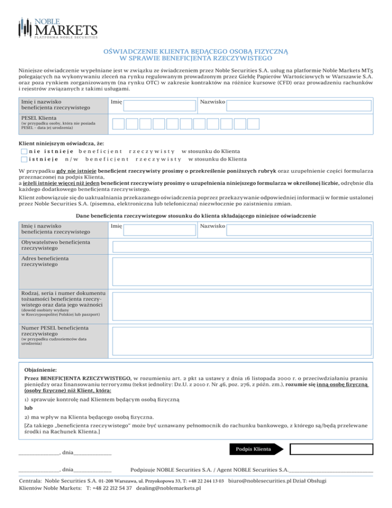 OŚWIADCZENIE KLIENTA BĘDĄCEGO OSOBĄ FIZYCZNĄ W SPRAWIE BENEFICJENTA RZECZYWISTEGO Niniejsze oświadczenie wypełniane jest w związku ze świadczeniem przez Noble Securities S.A. usług na platformie Noble Markets MT5 polegających na wykonywaniu zleceń na rynku regulowanym prowadzonym przez Giełdę Papierów Wartościowych w Warszawie S.A. oraz poza rynkiem zorganizowanym (na rynku OTC) w zakresie kontraktów na różnice kursowe (CFD) oraz prowadzeniu rachunków i rejestrów związanych z takimi usługami. Imię i nazwisko beneficjenta rzeczywistego Imię Nazwisko PESEL Klienta (w przypadku osoby, która nie posiada PESEL – data jej urodzenia) Klient niniejszym oświadcza, że: nie istnieje istnieje beneficjent n/w beneficjent rzeczywisty rzeczywisty w stosunku do Klienta w stosunku do Klienta W przypadku gdy nie istnieje beneficjent rzeczywisty prosimy o przekreślenie poniższych rubryk oraz uzupełnienie części formularza przeznaczonej na podpis Klienta, a jeżeli istnieje więcej niż jeden beneficjent rzeczywisty prosimy o uzupełnienia niniejszego formularza w określonej liczbie, odrębnie dla każdego dodatkowego beneficjenta rzeczywistego. Klient zobowiązuje się do uaktualniania przekazanego oświadczenia poprzez przekazywanie odpowiedniej informacji w formie ustalonej przez Noble Securities S.A. (pisemna, elektroniczna lub telefoniczna) niezwłocznie po zaistnieniu zmian. Dane beneficjenta rzeczywistegow stosunku do klienta składającego niniejsze oświadczenie Imię i nazwisko beneficjenta rzeczywistego Imię Nazwisko Obywatelstwo beneficjenta rzeczywistego Adres beneficjenta rzeczywistego Rodzaj, seria i numer dokumentu tożsamości beneficjenta rzeczywistego oraz data jego ważności (dowód osobisty wydany w Rzeczypospolitej Polskiej lub paszport) Numer PESEL beneficjenta rzeczywistego (w przypadku cudzoziemców data urodzenia) Objaśnienie: Przez BENEFICJENTA RZECZYWISTEGO, w rozumieniu art. 2 pkt 1a ustawy z dnia 16 listopada 2000 r. o przeciwdziałaniu praniu pieniędzy oraz finansowaniu terroryzmu (tekst jednolity: Dz.U. z 2010 r. Nr 46, poz. 276, z późn. zm.), rozumie się inną osobę fizyczną (osoby fizyczne) niż Klient, która: 1) sprawuje kontrolę nad Klientem będącym osobą fizyczną lub 2) ma wpływ na Klienta będącego osobą fizyczna. [Za takiego „beneficjenta rzeczywistego” może być uznawany pełnomocnik do rachunku bankowego, z którego są/będą przelewane środki na Rachunek Klienta.] _______________, dnia______________ _______________, dnia______________ Podpis Klienta Podpisuje NOBLE Securities S.A. / Agent NOBLE Securities S.A._______________________________ Centrala: Noble Securities S.A. 01-208 Warszawa, ul. Przyokopowa 33, T: +48 22 244 13 03 [email protected] Dział Obsługi Klientów Noble Markets: T: +48 22 212 54 37 [email protected]