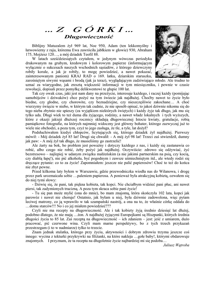 … Z G Ó R K I … Długowieczność Biblijny Matuzalem Ŝył 969 lat, Noe 950, Adam (ten lekkomyślny i łatwowierny z raju, któremu Ewa zawróciła jabłkiem w głowie) 930, Abraham 175, MojŜesz 120…, a mój dziadek Teofil 88. W latach sześćdziesiątych czytałem, w jedynym wówczas periodyku drukowanym na grubym, kredowym i kolorowym papierze (informującym wyłącznie o sukcesach naszych wschodnich sąsiadów, z którego dziewczyny robiły korale, a jak je robiły, to mogę powiedzieć, a nawet pokazać, zainteresowanym paniom) KRAJ RAD o 169. latku, dziarskim staruszku, zarośniętym siwymi wąsami i brodą (jak ja teraz), wyglądającym zadziwiająco młodo. Ale trudno to uznać za wiarygodne, jak zresztą większość informacji w tym miesięczniku, i pewnie w czasie rewolucji, dopisali przez pomyłkę delikwentowi te głupie 100 lat. Tak czy owak czas, jaki jest nam dany na przeŜycie, interesuje kaŜdego, i raczej kaŜdy (pomijając samobójców i dziwaków) chce poŜyć na tym świecie jak najdłuŜej. Choćby nawet to Ŝycie było biedne, czy głodne, czy chorowite, czy beznadziejne, czy nieszczęśliwie zakochane… A choć wierzymy święcie w niebo, w którym tak cudnie, Ŝe nie sposób opisać, to jakoś dziwnie nikomu się do tego nieba zbytnio nie spieszy (za wyjątkiem niektórych świętych) i kaŜdy Ŝyje tak długo, jak mu się tylko uda. Długi wiek to teŜ duma dla Ŝyjącego, rodziny, a nawet władz lokalnych i tych wyŜszych, które z okazji jakiejś dłuŜszej rocznicy składają długowiecznej Istocie kwiaty, gratulacje, robią pamiątkowe fotografie, na których najmniej widoczny jest główny bohater, którego zazwyczaj juŜ to wiele nie obchodzi, a poza tym, czyŜ to jego zasługa, Ŝe tle, a tyle, lat doŜył? Podsłuchiwałem kiedyś chłopców, licytujących się, którego dziadek Ŝył najdłuŜej. Pierwszy mówił: - Mój dziadek Ŝył 85 lat! Drugi się chwalił: - A mój Ŝył 98 lat! Trzeci zaś stwierdził, dumny jak paw: - A mój Ŝył tak długo, Ŝe musieliśmy go zastrzelić! Ale Ŝarty na bok, bo problem jest powaŜny i dotyczy kaŜdego z nas, i kaŜdy się zastanawia co robić, albo czego nie robić, Ŝeby poŜyć jak najdłuŜej. Oczywiście: zdrowo się odŜywiać, Ŝyć bezstresowo – najlepiej w udanym związku małŜeńskim (a nie jakimś partnerskim na psią, czy kocią, czy diablą łapę!), nie pić alkoholu, być pogodnym i zawsze uśmiechniętym itd., ale wtedy rodzi się dręczące pytanie: co to za Ŝycie! Zapomniałem: jeszcze nie palić papierosów! Choć to teŜ do końca nie zbyt pewne. Przed kilkoma laty byłem w Warszawie, gdzie przewodniczka wiodła nas do Wilanowa, i drogę przez park urozmaicała sobie …paleniem papierosa. A poniewaŜ była atrakcyjną kobietą, ozwałem się do niej tymi słowy: - Dziwię się, Ŝe pani, tak piękna kobieta, tak kopci. Nie chciałbym widzieć pani płuc, ani nawet piersi, tak zadymionych trucizną. A poza tym skraca sobie pani Ŝycie! - Tu się pan moŜe mylić (ona do mnie), bo mam znajomą, która skończyła 102 lata, kopci jak parowóz i nawet nie choruje! Ostatnio, jak byłam u niej, była dziwnie zadowolona, więc pytam leciwej matrony, co ją wprawiło w tak szampański nastrój, a ona na to, Ŝe właśnie córkę oddała do …domu starców!!! No i co jej miałem powiedzieć??? Czyli nie ma recepty na długowieczność. Ale i tak kobiety Ŝyją średnio dziesięć lat dłuŜej, podobno dlatego, Ŝe nie mają …Ŝon. A najdłuŜej Ŝyjącymi Europejkami są Hiszpanki, których średnia długości Ŝycia to 85 lat. Zaś receptą na długowieczność – ich zdaniem – jest: jeść z umiarem, duŜo pracować, pić czerwone wina. Czyli mam marne perspektywy, bo z tych trzech przykazań przestrzegam (i to w nadmiarze) tylko to trzecie. Znam jednak stulatka, którego przy Ŝyciu, aktywności i dobrym zdrowiu trzyma jeszcze coś innego: wycina z tekturki przykrywki na filiŜanki, na które nakleja …gołe baby!, którymi obdarowuje znajomych. I przyznam, Ŝe ta recepta na długoletnie Ŝycie najbardziej mi się podoba… Juliusz Wątroba Koła sie łobracajóm Jako to móm być spolygliwy dalij, kie pod szłapami cały świat mi gore, kie picio woło wysuszóme pole, a prózny corek teskni za kwakami. Biyda, bestyja, jowejczy i kwiczy, jakbych babucia podrzinoł pitwokym, aji się ślubno cosik na mie boczy, Ŝe się belóntóm tukej po próŜnicy. I jyno wszycko ciyńgym mie dosrowo: ty szkwety w chałpie, koczka, baby plynta, z siwkym się Ŝerym i wadzym się z krowóm - móm doś Ŝywota tego – do imyntu. Nale się koła ciyńgym łobracajóm, jako ty pjane taneczniki społym, tóŜ worce czakać, bo i jo pomału siednym jak cesorz za stołym i pojym… Juliusz Wątroba Słowniczek gwarowy spolygliwy - godzien zaufania szłapy – stopy corek – przegródka w piwnicy jowejczy – narzeka babuć – świnia pitwok – tępy nóŜ belóntóm – chodzę bez celu szkwety – smarkacze plynta – długa spódnica do imyntu - całkowicie worce - warto