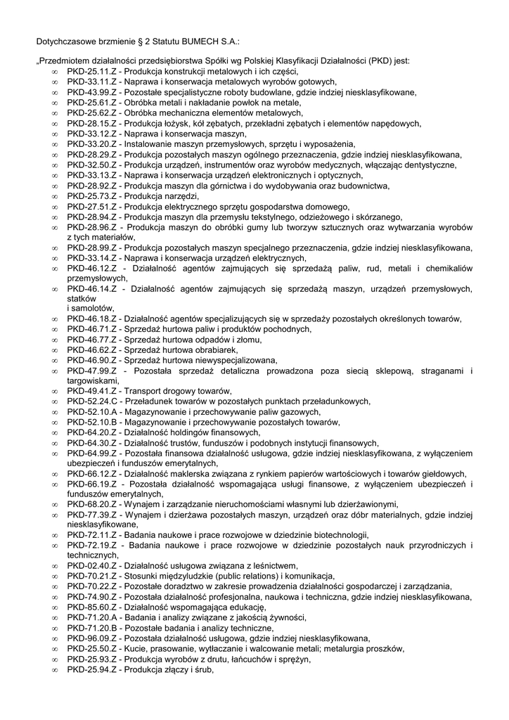Dotychczasowe brzmienie § 2 Statutu BUMECH S.A.: „Przedmiotem działalności przedsiębiorstwa Spółki wg Polskiej Klasyfikacji Działalności (PKD) jest: • PKD-25.11.Z - Produkcja konstrukcji metalowych i ich części, • PKD-33.11.Z - Naprawa i konserwacja metalowych wyrobów gotowych, • PKD-43.99.Z - Pozostałe specjalistyczne roboty budowlane, gdzie indziej niesklasyfikowane, • PKD-25.61.Z - Obróbka metali i nakładanie powłok na metale, • PKD-25.62.Z - Obróbka mechaniczna elementów metalowych, • PKD-28.15.Z - Produkcja łożysk, kół zębatych, przekładni zębatych i elementów napędowych, • PKD-33.12.Z - Naprawa i konserwacja maszyn, • PKD-33.20.Z - Instalowanie maszyn przemysłowych, sprzętu i wyposażenia, • PKD-28.29.Z - Produkcja pozostałych maszyn ogólnego przeznaczenia, gdzie indziej niesklasyfikowana, • PKD-32.50.Z - Produkcja urządzeń, instrumentów oraz wyrobów medycznych, włączając dentystyczne, • PKD-33.13.Z - Naprawa i konserwacja urządzeń elektronicznych i optycznych, • PKD-28.92.Z - Produkcja maszyn dla górnictwa i do wydobywania oraz budownictwa, • PKD-25.73.Z - Produkcja narzędzi, • PKD-27.51.Z - Produkcja elektrycznego sprzętu gospodarstwa domowego, • PKD-28.94.Z - Produkcja maszyn dla przemysłu tekstylnego, odzieżowego i skórzanego, • PKD-28.96.Z - Produkcja maszyn do obróbki gumy lub tworzyw sztucznych oraz wytwarzania wyrobów z tych materiałów, • PKD-28.99.Z - Produkcja pozostałych maszyn specjalnego przeznaczenia, gdzie indziej niesklasyfikowana, • PKD-33.14.Z - Naprawa i konserwacja urządzeń elektrycznych, • PKD-46.12.Z - Działalność agentów zajmujących się sprzedażą paliw, rud, metali i chemikaliów przemysłowych, • PKD-46.14.Z - Działalność agentów zajmujących się sprzedażą maszyn, urządzeń przemysłowych, statków i samolotów, • PKD-46.18.Z - Działalność agentów specjalizujących się w sprzedaży pozostałych określonych towarów, • PKD-46.71.Z - Sprzedaż hurtowa paliw i produktów pochodnych, • PKD-46.77.Z - Sprzedaż hurtowa odpadów i złomu, • PKD-46.62.Z - Sprzedaż hurtowa obrabiarek, • PKD-46.90.Z - Sprzedaż hurtowa niewyspecjalizowana, • PKD-47.99.Z - Pozostała sprzedaż detaliczna prowadzona poza siecią sklepową, straganami i targowiskami, • PKD-49.41.Z - Transport drogowy towarów, • PKD-52.24.C - Przeładunek towarów w pozostałych punktach przeładunkowych, • PKD-52.10.A - Magazynowanie i przechowywanie paliw gazowych, • PKD-52.10.B - Magazynowanie i przechowywanie pozostałych towarów, • PKD-64.20.Z - Działalność holdingów finansowych, • PKD-64.30.Z - Działalność trustów, funduszów i podobnych instytucji finansowych, • PKD-64.99.Z - Pozostała finansowa działalność usługowa, gdzie indziej niesklasyfikowana, z wyłączeniem ubezpieczeń i funduszów emerytalnych, • PKD-66.12.Z - Działalność maklerska związana z rynkiem papierów wartościowych i towarów giełdowych, • PKD-66.19.Z - Pozostała działalność wspomagająca usługi finansowe, z wyłączeniem ubezpieczeń i funduszów emerytalnych, • PKD-68.20.Z - Wynajem i zarządzanie nieruchomościami własnymi lub dzierżawionymi, • PKD-77.39.Z - Wynajem i dzierżawa pozostałych maszyn, urządzeń oraz dóbr materialnych, gdzie indziej niesklasyfikowane, • PKD-72.11.Z - Badania naukowe i prace rozwojowe w dziedzinie biotechnologii, • PKD-72.19.Z - Badania naukowe i prace rozwojowe w dziedzinie pozostałych nauk przyrodniczych i technicznych, • PKD-02.40.Z - Działalność usługowa związana z leśnictwem, • PKD-70.21.Z - Stosunki międzyludzkie (public relations) i komunikacja, • PKD-70.22.Z - Pozostałe doradztwo w zakresie prowadzenia działalności gospodarczej i zarządzania, • PKD-74.90.Z - Pozostała działalność profesjonalna, naukowa i techniczna, gdzie indziej niesklasyfikowana, • PKD-85.60.Z - Działalność wspomagająca edukację, • PKD-71.20.A - Badania i analizy związane z jakością żywności, • PKD-71.20.B - Pozostałe badania i analizy techniczne, • PKD-96.09.Z - Pozostała działalność usługowa, gdzie indziej niesklasyfikowana, • PKD-25.50.Z - Kucie, prasowanie, wytłaczanie i walcowanie metali; metalurgia proszków, • PKD-25.93.Z - Produkcja wyrobów z drutu, łańcuchów i sprężyn, • PKD-25.94.Z - Produkcja złączy i śrub, • • • • • • • • • • • • • • • • • • • • • • • • • PKD-25.71.Z - Produkcja wyrobów nożowniczych i sztućców, PKD-25.99.Z - Produkcja pozostałych gotowych wyrobów metalowych, gdzie indziej niesklasyfikowana, PKD-32.99.Z - Produkcja pozostałych wyrobów, gdzie indziej niesklasyfikowana, PKD-41.20.Z - Roboty budowlane związane ze wznoszeniem budynków mieszkalnych i niemieszkalnych, PKD-41.10.Z - Realizacja projektów budowlanych związanych ze wznoszeniem budynków, PKD-42.11.Z - Roboty związane z budową dróg i autostrad, PKD-42.12.Z - Roboty związane z budową dróg szynowych i kolei podziemnej, PKD-42.13.Z - Roboty związane z budową mostów i tuneli, PKD-42.21.Z - Roboty związane z budową rurociągów przesyłowych i sieci rozdzielczych, PKD-42.22.Z - Roboty związane z budową linii telekomunikacyjnych i elektroenergetycznych, PKD-42.91.Z - Roboty związane z budową obiektów inżynierii wodnej, PKD-42.99.Z - Roboty związane z budową pozostałych obiektów inżynierii lądowej i wodnej, gdzie indziej niesklasyfikowane, PKD-68.10.Z - Kupno i sprzedaż nieruchomości na własny rachunek, PKD-68.31.Z - Pośrednictwo w obrocie nieruchomościami, PKD-81.10.Z - Działalność pomocnicza związana z utrzymaniem porządku w budynkach, PKD-71.11.Z - Działalność w zakresie architektury, PKD-71.12.Z - Działalność w zakresie inżynierii i związane z nią doradztwo techniczne, PKD-05.10.Z - Wydobywanie węgla kamiennego, PKD-07.10.Z - Górnictwo rud żelaza, PKD-07.29.Z - Górnictwo pozostałych rud me