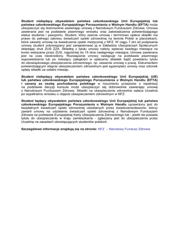 Student niebędący obywatelem państwa członkowskiego Unii Europejskiej lub państwa członkowskiego Europejskiego Porozumienia o Wolnym Handlu (EFTA) może ubezpieczyć się dobrowolnie zawierając umowę z Narodowym Funduszem Zdrowia. Umowa zawierana jest na podstawie pisemnego wniosku oraz zaświadczenia potwierdzającego status studenta i paszportu. Student, który zawrze umowę i terminowo opłaca składki ma prawo do pełnego zakresu świadczeń opieki zdrowotnej na terenie Polski w placówkach, które zawarły umowę na świadczenia opieki medycznej z NFZ. W ciągu 7 dni od podpisania umowy student zobowiązany jest zarejestrować ją w Zakładzie Ubezpieczeń Społecznych składając druk ZUS ZZA. Składkę z tytułu umowy należy wpłacać każdego miesiąca na konto wskazane przez ZUS, najpóźniej do 15 dnia następnego miesiąca. Umowa zawierana jest na czas nieokreślony. Rozwiązanie umowy następuje na podstawie pisemnego wypowiedzenia lub po miesiącu zaległości w opłacaniu składek bądź powstaniu tytułu do obowiązkowego ubezpieczenia zdrowotnego, np. zawarcie umowę o pracę. Dokumentem potwierdzającym objęcie ubezpieczeniem zdrowotnym jest egzemplarz umowy oraz odcinek opłaty składki za ostatni miesiąc. Student niebędący obywatelem państwa członkowskiego Unii Europejskiej (UE) lub państwa członkowskiego Europejskiego Porozumienia o Wolnym Handlu (EFTA) i uznany za osobę pochodzenia polskiego w rozumieniu przepisów o repatriacji na podstawie decyzji konsula może ubezpieczyć się dobrowolnie zawierając umowę z Narodowym Funduszem Zdrowia. Składki na ubezpieczenie zdrowotne opłaca Uczelnia po wypełnieniu wniosku o objęcie ubezpieczeniem zdrowotnym w NFZ. Student będący obywatelem państwa członkowskiego Unii Europejskiej lub państwa członkowskiego Europejskiego Porozumienia o Wolnym Handlu uprawniony jest do bezpłatnych świadczeń opieki zdrowotnej udzielanych przez świadczeniodawców, którzy zawarli umowy na udzielanie świadczeń opieki zdrowotnej z Narodowym Funduszem Zdrowia na podstawie Europejskiej Karty Ubezpieczenia Zdrowotnego lub - jeżeli nie posiada tytułu do ubezpieczenia w kraju zamieszkania - zgłaszany jest do ubezpieczenia przez Uczelnię na zasadach obowiązujących studentów polskich. Szczegółowe informacje znajdują się na stronie: NFZ – Narodowy Fundusz Zdrowia