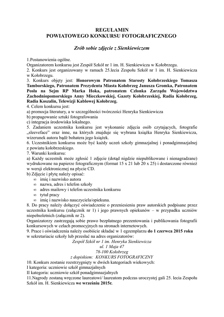 REGULAMIN POWIATOWEGO KONKURSU FOTOGRAFICZNEGO Zrób sobie zdjęcie z Sienkiewiczem 1.Postanowienia ogólne. Organizatorem konkursu jest Zespół Szkół nr 1 im. H. Sienkiewicza w Kołobrzegu. 2. Konkurs jest organizowany w ramach 25.lecia Zespołu Szkół nr 1 im. H. Sienkiewicza w Kołobrzegu. 3. Konkurs objęty jest: Honorowym Patronatem Starosty Kołobrzeskiego Tomasza Tamborskiego, Patronatem Prezydenta Miasta Kołobrzeg Janusza Gromka, Patronatem Posła na Sejm RP Marka Hoka, patronatem Członka Zarządu Województwa Zachodniopomorskiego Anny Mieczkowskiej, Gazety Kołobrzeskiej, Radia Kołobrzeg, Radia Koszalin, Telewizji Kablowej Kołobrzeg. 4. Celem konkursu jest: a) promocja literatury, a w szczególności twórczości Henryka Sienkiewicza b) propagowanie sztuki fotografowania c) integracja środowiska lokalnego. 5. Zadaniem uczestnika konkursu jest wykonanie zdjęcia osób czytających, fotografie „sleeveface” oraz inne, na których znajduje się wybrana książka Henryka Sienkiewicza, wizerunek autora bądź bohatera jego książek. 6. Uczestnikiem konkursu może być każdy uczeń szkoły gimnazjalnej i ponadgimnazjalnej z powiatu kołobrzeskiego. 7. Warunki konkursu: a) Każdy uczestnik może zgłosić 1 zdjęcie (dotąd nigdzie niepublikowane i nienagradzane) wydrukowane na papierze fotograficznym (format 15 x 21 lub 20 x 25) i dostarczone również w wersji elektronicznej na płycie CD. b) Zdjęcie i płytę należy opisać: • imię i nazwisko autora • nazwa, adres i telefon szkoły • adres mailowy i telefon uczestnika konkursu • tytuł pracy • imię i nazwisko nauczyciela/opiekuna. 8. Do pracy należy dołączyć oświadczenie o przeniesieniu praw autorskich podpisane przez uczestnika konkursu (załącznik nr 1) i jego prawnych opiekunów – w przypadku uczniów niepełnoletnich (załącznik nr 2). Organizatorzy zastrzegają sobie prawo bezpłatnego prezentowania i publikowania fotografii konkursowych w celach promocyjnych na stronach internetowych. 9. Prace i oświadczenia należy osobiście składać w 1 egzemplarzu do 1 czerwca 2015 roku w sekretariacie szkoły lub przesłać na adres organizatorów: Zespół Szkół nr 1 im. Henryka Sienkiewicza ul. 1 Maja 47 78-100 Kołobrzeg z dopiskiem: KONKURS FOTOGRAFICZNY 10. Konkurs zostanie rozstrzygnięty w dwóch kategoriach wiekowych: I kategoria: uczniowie szkół gimnazjalnych II kategoria: uczniowie szkół ponadgimnazjalnych 11.Nagrody zostaną wręczone laureatowi/ laureatom podczas uroczystej gali 25. lecia Zespołu Szkół im. H. Sienkiewicza we wrześniu 2015r. Nauczyciele nagrodzonych uczestników konkursu otrzymają pamiątkowe dyplomy. 12. Postanowienia końcowe: Decyzje Komisji Konkursowej są ostateczne. Prace nie będę odsyłane autorom. Koordynatorki konkursu: mgr Joanna Jankowska – Iwańska mgr Anna Stolica - Dobrowolska Załącznik nr 1 Oświadczenie o przeniesieniu praw autorskich i przetwarzaniu danych osobowych. Oświadczam, że udzielam organizatorom Konkursu nieodpłatnej, bezterminowej i nieograniczonej terytorialnie licencji na umieszczenie pracy konkursowej na stronach internetowych organizatorów Konkursu, powielanie pracy każdą dostępną techniką i na wykorzystanie jej na wszystkich polach eksploatacji wymienionych w art. 50 ustawy z dnia 4 lutego 1994 r. o prawie autorskim i prawach pokrewnych (Dz. U. z 2006 r. Nr 90, poz.631, z późn. zm.), w szczególności w materiałach promocyjnych i edukacyjnych związanych z Konkursem oraz w innych publikacjach związanych z działalnością organizatora Konkursu. Udzielana licencja obejmuje prawo do wykonywania zależnego prawa autorskiego. Z chwilą dostarczenia pracy konkursowej do organizatora Konkursu na Organizatora przechodzi prawo własności do przysłanych materiałów. Jednocześnie wyrażam zgodę na przetwarzanie przez organizatorów Konkursu moich danych osobowych zgodnie z ustawą z 29 sierpnia 1997 r. o ochronie danych osobowych (Dz. U. z 2002 r. Nr 101, poz. 926, z późn. zm.), na potrzeby organizacji i promocji Konkursu. Ponadto wyrażam zgodę na nieodpłatne wykorzystanie mojego wizerunku przez organizatora Konkursu – zgodnie z ustawą z dnia 4 lutego 1994 r. o prawie autorskim i prawach pokrewnych (Dz. U. z 2006 r. Nr 90, poz. 631, z późn. zm.) na cele związane z promocją Konkursu. Możliwe formy rozpowszechnienia wizerunku to publikacje, Internet, telewizja. (data i miejsce) (czytelny podpis uczestnika konkursu) Załącznik nr 2 Wyrażam zgodę na przeniesienie praw autorskich, przetwarzanie danych osobowych oraz wykorzystanie wizerunku dziecka zgodnie z powyższą klauzulą. (data i miejsce) (czytelny podpis rodzica/opiekuna prawnego)