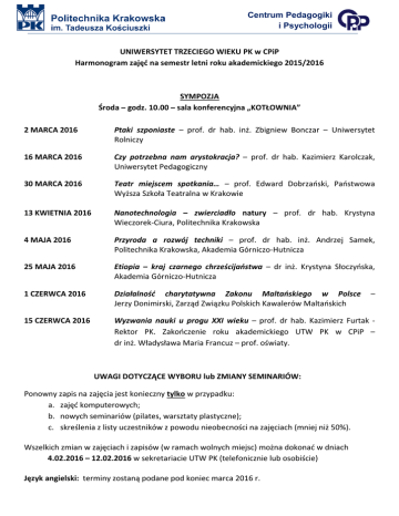 harmonogramem zajęć UTW w semestrze letnim