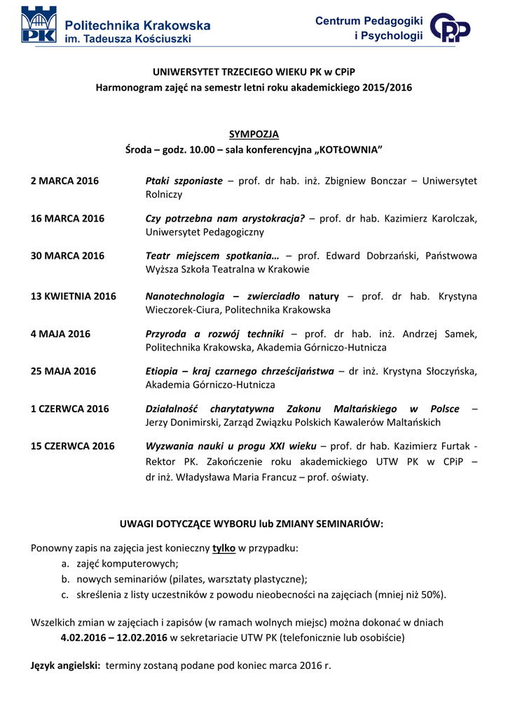 Centrum Pedagogiki i Psychologii UNIWERSYTET TRZECIEGO WIEKU PK w CPiP Harmonogram zajęć na semestr letni roku akademickiego 2015/2016 SYMPOZJA Środa – godz. 10.00 – sala konferencyjna „KOTŁOWNIA” 2 MARCA 2016 Ptaki szponiaste – prof. dr hab. inż. Zbigniew Bonczar – Uniwersytet Rolniczy 16 MARCA 2016 Czy potrzebna nam arystokracja? – prof. dr hab. Kazimierz Karolczak, Uniwersytet Pedagogiczny 30 MARCA 2016 Teatr miejscem spotkania… – prof. Edward Dobrzański, Państwowa Wyższa Szkoła Teatralna w Krakowie 13 KWIETNIA 2016 Nanotechnologia – zwierciadło natury – prof. dr hab. Krystyna Wieczorek-Ciura, Politechnika Krakowska 4 MAJA 2016 Przyroda a rozwój techniki – prof. dr hab. inż. Andrzej Samek, Politechnika Krakowska, Akademia Górniczo-Hutnicza 25 MAJA 2016 Etiopia – kraj czarnego chrześcijaństwa – dr inż. Krystyna Słoczyńska, Akademia Górniczo-Hutnicza 1 CZERWCA 2016 Działalność charytatywna Zakonu Maltańskiego w Polsce Jerzy Donimirski, Zarząd Związku Polskich Kawalerów Maltańskich 15 CZERWCA 2016 Wyzwania nauki u progu XXI wieku – prof. dr hab. Kazimierz Furtak Rektor PK. Zakończenie roku akademickiego UTW PK w CPiP – dr inż. Władysława Maria Francuz – prof. oświaty. UWAGI DOTYCZĄCE WYBORU lub ZMIANY SEMINARIÓW: Ponowny zapis na zajęcia jest konieczny tylko w przypadku: a. zajęć komputerowych; b. nowych seminariów (pilates, warsztaty plastyczne); c. skreślenia z listy uczestników z powodu nieobecności na zajęciach (mniej niż 50%). Wszelkich zmian w zajęciach i zapisów (w ramach wolnych miejsc) można dokonać w dniach 4.02.2016 – 12.02.2016 w sekretariacie UTW PK (telefonicznie lub osobiście) Język angielski: terminy zostaną podane pod koniec marca 2016 r. – KOMPUTEROWE: sala 404 CPIP. Poniedziałki 07.03.2016; 14.03.2016; 21.03.2016; 04.04.2016; 11.04.2016; 18.04.2016. • godz. 09.30 – Zdjęcia – fotomontaż, retusz, program GIMP – mgr inż. T. Pułka • godz. 11:00 – Jak sprawniej korzystać z komputera i internetu – mgr M. Rakoczy • godz. 12.30 – Prezentacja multimedialna - Power Point – mgr inż. T. Pułka Wtorki 08.03.2016; 15.03.2016; 22.03.2016; 05.04.2016; 12.04.2016; 19.04.2016. • godz. 09.30 – Jak sprawniej korzystać z komputera i internetu – mgr M. Rakoczy • godz. 11.00 – Rozwiązywanie problemów użytkownika komputera – mgr inż. T. Pułka • godz. 12.30 – Czas pracy i rozrywki z komputerem – mgr inż. T. Pułka Środy UWAGA: każda grupa ma inne terminy zajęć • godz. 10.00 – Zakupy przez internet – mgr M. Rakoczy (UWAGA! Aby rozpocząć ten kurs, trzeba posługiwać się skrzynką mailową) w dniach: 09.03.2016; 23.03.2016; 06.04.2016; 20.04.2016; 27.04.2016; 11.05.2016. • godz. 13.00 – Film (edycja i montaż) – mgr T. Pułka w dniach: 09.03.2016; 16.03.2016; 30.03.2016; 06.04.2016; 13.04.2016; 20.04.2016. Czwartki 10.03.2016; 17.03.2016; 31.03.2016; 07.04.2016; 14.04.2016; 21.04.2016. • godz. 09.30 – Obsługa i korzystanie z portalu społecznościowego Facebook – mgr M. Rakoczy (UWAGA! Aby rozpocząć ten kurs, trzeba posługiwać się skrzynką mailową) Piątki 11.03.2016; 18.03.2016; 01.04.2016; 08.04.2016; 15.04.2016; 22.04.2016. • godz. 10:00 – Ochrona systemu, programów i danych w komputerze – mgr T. Pułka TRENING PAMIĘCI I UMYSŁU, sala 2 CPiP. Prowadzący: mgr Małgorzata Rakoczy • wtorki godz. 11.30 terminy: 15.03; 29.03; 12.04; 26.04; 10.05; 24.05.2016. • czwartki godz. 11.00 terminy: 10.03; 31.03; 14.04; 28.04; 19.05; 09.06.2016. ARCHITEKTURA I INNE SZTUKI: środy; godz. 12.00; sala 2 CPIP. Prowadzący: mgr inż. arch. Urszula Synal, mgr Małgorzata Kizlich (04.05) Terminy: 16.03.2016; 06.04.2016; 20.04.2016; 04.05.2016; 18.05.2016; 08.06.2016. PEDAGOGICZNO-PSYCHOLOGICZNE: piątki; godz. 9.30; sala 2 CPIP. 11.03.2016 – O życiowej aktywności dojrzałej kobiety – mgr Marta Patena 01.04.2016 – Edukacja europejska – dr inż. Władysława Maria Francuz – prof. oświaty 15.04.2015 – Wstęp do psychologii społecznej – mgr Mikołaj Bohm 29.04.2016 – Komunikacja osób niesłyszących – mgr Agnieszka Kopyść-Woskowicz 13.05.2016 – Moje hobby – dr Barbara Cieniawa 03.06.2016 – Asertywność – dr Janina Wojtowicz-Piętka PROMOCJA ZDROWIA PSYCHICZNEGO I FIZYCZNEGO: środy; godz. 12.00; sala 2 CPIP. 09.03.2016 – Depresja - dr Grzegorz Mączka – CMUJ 30.03.2016 – Ziołolecznictwo – Brat Jan z Dukli, Grzegorz Ścieranka, Zakon Bonifratrów 13.04.2016 – Nadciśnienie i choroby serca – mgr Patryk Cyb, Apteka ZIKO 27.04.2016 – Zdrowa jama ustna – ważnym aspektem zdrowia – lek. stom. Magdalena Ciaputa 11.05.2016 – Terapia zajęciowa – mgr Monika Surówka, Bonifraterska Fund. Dobroczynna w Konarach 01.06.2016 – ZWIEDZANIE INSTYTUTU FIZYKI JĄDROWEJ PAN, ul. Radzikowskiego 152. 3 grupy po 15 osób – konieczność zapisku w sekretariacie UTW do dnia 25.05.2016 r. REKREACYJNO-RUCHOWE: hala sportowa ul. Kamienna 17. Prowadzący: mgr Barbara Grabacka – Pietruszka (ŚR, CZW), mgr Anita Łagosz – Michalec (PON, WT). • poniedziałki godz. 14.15 07.03; 21.03; 04.04; 11.04; 18.04; 25.04; 09.05; 16.05; 30.05.2016. • wtorki godz. 13.30 08.03; 22.03; 05.04; 12.04; 19.04; 26.04; 10.05; 17.05; 31.05.2016. • środy godz. 12.00 09.03; 30.03; 06.04; 13.04; 20.04; 27.04; 11.05; 18.05; 01.06.2016. • czwartki godz. 12.00 10.03; 31.03; 07.04; 14.04; 21.04; 28.04; 12.05; 19.05; 02.06.2016. TANIEC: sala Chóru CANTATA, budynek stołówki sala 104 (PON); ul. Krupnicza 38 (CZW). Prowadzący: mgr Anna Cygan • poniedziałki godz. 13.00 07.03; 14.03; 04.04; 11.04; 18.04; 25.04; 09.05; 16.05; 23.05.2016. • czwartki godz. 13.00 10.03; 17.03; 31.03; 07.04; 14.04; 21.04; 28.04; 05.05; 12.05; 19.05. STRETCHING I RELAKSACJA: sala Chóru CANTATA, bud. stołówki (PON); ul. Krupnicza 38 (WT, CZW). Prowadzący: mgr Anna Cygan • poniedziałki godz. 14.10 07.03; 14.03; 04.04; 11.04; 18.04; 25.04
