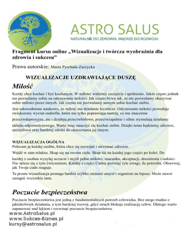 Fragment kursu online „Wizualizacje i twórcza wyobraźnia dla zdrowia i sukcesu” Prawa autorskie: Marta Pyrchała-Zarzycka WIZUALIZACJE UZDRAWIAJĄCE DUSZĘ Miłość Każdy chce kochać i być kochanym. W miłości widzimy szczęście i spełnienie. Jakże często jednak nie pozwalamy sobie na odczuwanie miłości. Jak często bywa tak, że nie pozwalamy okazywać sobie miłości przez innych. Jak często nie pozwalamy samym sobie kochać siebie. Jest udowodnione naukowo, że miłość ma działanie lecznicze. Odczuwanie miłości powoduje zwiększony wyrzut endorfin, które nie tylko poprawiają nastrój, co ma znaczenie przeciwdepresyjne, ale i działają przeciwbólowo, przeciwzapalnie i silnie stymulują działanie układu odpornościowego. Warto więc nauczyć się kochać siebie. Dzięki temu będziemy zdrowsi, szczęśliwsi oraz bardziej zdolni do okazywania jej innym. WIZUALIZACJA OGÓLNA Polecam ją każdej osobie, która chce się rozwijać i utrzymać zdrowie. Wejdź w stan relaksu. Skup się na swoim ciele. Skup się na każdej jego części po kolei. Do każdej z osobna wysyłaj uczucie i myśli pełne miłości, szacunku, akceptacji, docenienia i radości. Nie śpiesz się z tym ćwiczeniem. Każdej z części Ciebie poświęć tyle uwagi, ile potrzeba. Obserwuj, jak Twoje ciało reaguje. Ta prosta wizualizacja pomaga bardzo szybko zmienić umysł i organizm na lepsze. Może nawet zastąpić wszystkie inne. Poczucie bezpieczeństwa Poczucie bezpieczeństwa jest jedną z fundamentalnych potrzeb człowieka. Bez niego trudno o jakiekolwiek działania, a tym bardziej rozwój, gdyż strach blokuje realizację celów. Dlatego warto zapanować nad lękiem i rozwinąć poczucie bezpieczeństwa. WIZUALIZACJE OGÓLNE 1. Wejdź w stan relaksu. Oddychaj spokojnie i głęboko. Z każdym oddechem czujesz się coraz bardziej zrelaksowana. Wyobraź sobie, że jesteś dzieckiem w łonie kochającej matki. Jest tu cicho i spokojnie. Nic Ci tu nie zagraża. Jesteś bezpieczna. Twój byt jest bezpieczny. Przez pępowinę płynie do Ciebie tyle pokarmu i tlenu, ile tego potrzebujesz. Odczuwasz też miłość matki. Niczego Ci nie brakuje. Zagłębiaj się w tym uczuciu tak długo, jak tego pragniesz. 2 Wejdź w stan relaksu. Wyobrażaj sobie swoją codzienność. Wizualizuj, że przechodzisz przez swoje zwykłe obowiązki całkowicie bezpiecznie, gdyż jesteś otoczona kulą ciepłego światła. Ta kula neutralizuje wszelkie negatywne wpływy, więc nie dochodzą one do Ciebie. Ta kula wytwarza energię, która wypełnia Cię poczuciem bezpieczeństwa. Wizualizuj sobie każde swoje działanie z wciąż zwiększającym się poczuciem bezpieczeństwa. Spokój i harmonia Stres jest naszym codziennym towarzyszem. Nie oznacza to jednak, że powinniśmy mu się poddawać, tym bardziej, że stres przyczynia się do wielu chorób. Jest to spowodowane tym, że upośledza działanie układu immunologicznego. Przez to może się pośrednio przyczyniać nawet do wystąpienia chorób nowotworowych. Przewlekły i nie niwelowany stres nie tylko powoduje choroby, ale i problemy w życiu zawodowym i codziennym. Przez stres trudniej bowiem nam o podejmowanie racjonalnych decyzji, czy stosowne zachowywanie się. Opanujmy stres. WIZUALIZACJE OGÓLNE Powinny być to wszelkie wizualizacje z wyobrażeniem relaksu. 1. Wejdź w stan relaksu. Wyobraź sobie, że jesteś jeziorem. Wokół jest cisza i spokój. Pełna harmonia. Jesteś jeziorem pośrodku wielkiego lasu, którego gleby nie dotknęła ludzka stopa. Życie tu płynie w zgodzie z naturą. Odczuwaj, jak Twoje fale delikatnie i leniwie pluskają wydając przyjemny, kojący dźwięk, który jeszcze bardziej Cię relaksuje. 2. Możesz też sobie wyobrażać, że jesteś sobą, a Twoje zrelaksowane ciało unosi się delikatnie i bezpiecznie na powierzchni wody jeziora. Fale te delikatnie i przyjemnie Cię muskają, łagodnie obmywając i masując Ciebie. Ten subtelny masaż usuwa z Ciebie wszelki stres i zmęczenie. Niezależność i wolność Ludzie pragną niezależności i wolności. Często jednak nie są na nią psychicznie gotowi. Obawiają się jej, gdyż oznacza ona coś nowego – a ludzie boją się zmian. Ta nowość to samodzielne podejmowanie decyzji i ponoszenie ich konsekwencji. Strach jest zrozumiały, gdyż jest naturalną częścią ludzkiego istnienia. Ważne jest jednak, aby nad nim panować, gdyż bez niezależności, nie możemy się w pełni rozwijać. Bez wolności nasze życie nie może wyglądać tak, jak to sobie wymarzyliśmy. WIZUALIZACJE OGÓLNE 1. Wejdź w stan relaksu. Znajdź się w umyśle na łonie natury. Pobądź tam przez chwilę wczuwając się w nią. Następnie wyobraź sobie, że jesteś rzeką. Wolną i nieskrępowaną. Możesz popłynąć tam, gdzie chcesz. Kierunek Twojego ruchu zależy tylko od Ciebie. Możesz płynąć przez góry i doliny. Przez wsie i miasta. Po prostu płyń, doką chcesz. Nie masz żadnych ograniczeń. Podczas swojej wycieczki obserwuj otoczenie. Badaj, co spotykasz na swojej drodze. Wykonuj to ćwiczenie, jak długo chcesz. To ćwiczenie przydaje się zwłaszcza, kiedy czujesz presję i nie wiesz, jaką decyzję podjąć. Kiedy stoisz na życiowym rozdrożu. Po jakimś czasie trenując tę prostą i jakże przyjemną wizualizację, odnajdziesz własną drogę, gdyż to ćwiczenie stopniowo pomaga wyzbywać się ograniczających blokad. 2. Ta wizualizacja również - jak każda - zaczyna się od relaksu. I tu umysłem znajdź się na łonie natury. Jednakże tym razem stajesz się ptakiem. Jakim tylko chcesz - do Ciebie należy wybór gatunku. Fruń tam, gdzie tylko tego pragniesz. Zatrzymuj się, kiedy chcesz. Kontynuuj tę wizualizację, jak długo tego potrzebujesz. Zapraszam na kurs. Marta Pyrchała-Zarzycka www.astrosalus.pl www.astrosalus.pl/kursy-online www.sukces-biznes.pl http://www.astrosalus.com/ Kontakt: [email protected]