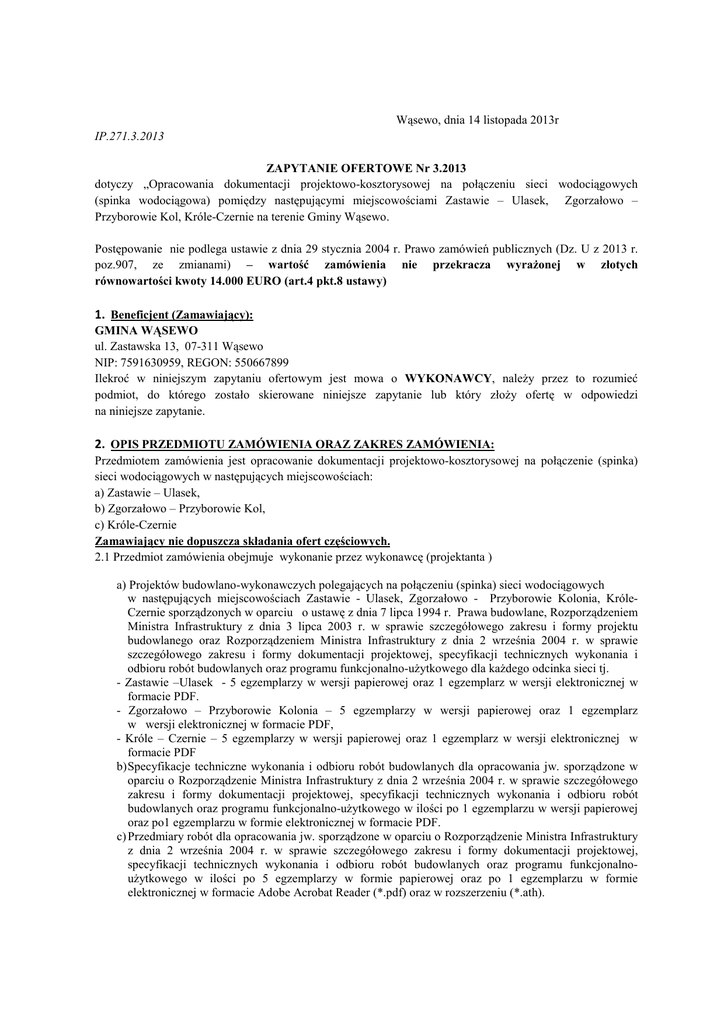 Wąsewo, dnia 14 listopada 2013r IP.271.3.2013 ZAPYTANIE OFERTOWE Nr 3.2013 dotyczy „Opracowania dokumentacji projektowo-kosztorysowej na połączeniu sieci wodociągowych (spinka wodociągowa) pomiędzy następującymi miejscowościami Zastawie – Ulasek, Zgorzałowo – Przyborowie Kol, Króle-Czernie na terenie Gminy Wąsewo. Postępowanie nie podlega ustawie z dnia 29 stycznia 2004 r. Prawo zamówień publicznych (Dz. U z 2013 r. poz.907, ze zmianami) – wartość zamówienia nie przekracza wyrażonej w złotych równowartości kwoty 14.000 EURO (art.4 pkt.8 ustawy) 1. Beneficjent (Zamawiający): GMINA WĄSEWO ul. Zastawska 13, 07-311 Wąsewo NIP: 7591630959, REGON: 550667899 Ilekroć w niniejszym zapytaniu ofertowym jest mowa o WYKONAWCY, należy przez to rozumieć podmiot, do którego zostało skierowane niniejsze zapytanie lub który złoży ofertę w odpowiedzi na niniejsze zapytanie. 2. OPIS PRZEDMIOTU ZAMÓWIENIA ORAZ ZAKRES ZAMÓWIENIA: Przedmiotem zamówienia jest opracowanie dokumentacji projektowo-kosztorysowej na połączenie (spinka) sieci wodociągowych w następujących miejscowościach: a) Zastawie – Ulasek, b) Zgorzałowo – Przyborowie Kol, c) Króle-Czernie Zamawiający nie dopuszcza składania ofert częściowych. 2.1 Przedmiot zamówienia obejmuje wykonanie przez wykonawcę (projektanta ) a) Projektów budowlano-wykonawczych polegających na połączeniu (spinka) sieci wodociągowych w następujących miejscowościach Zastawie - Ulasek, Zgorzałowo - Przyborowie Kolonia, KróleCzernie sporządzonych w oparciu o ustawę z dnia 7 lipca 1994 r. Prawa budowlane, Rozporządzeniem Ministra Infrastruktury z dnia 3 lipca 2003 r. w sprawie szczegółowego zakresu i formy projektu budowlanego oraz Rozporządzeniem Ministra Infrastruktury z dnia 2 września 2004 r. w sprawie szczegółowego zakresu i formy dokumentacji projektowej, specyfikacji technicznych wykonania i odbioru robót budowlanych oraz programu funkcjonalno-użytkowego dla każdego odcinka sieci tj. - Zastawie –Ulasek - 5 egzemplarzy w wersji papierowej oraz 1 egzemplarz w wersji elektronicznej w formacie PDF. - Zgorzałowo – Przyborowie Kolonia – 5 egzemplarzy w wersji papierowej oraz 1 egzemplarz w wersji elektronicznej w formacie PDF, - Króle – Czernie – 5 egzemplarzy w wersji papierowej oraz 1 egzemplarz w wersji elektronicznej w formacie PDF b) Specyfikacje techniczne wykonania i odbioru robót budowlanych dla opracowania jw. sporządzone w oparciu o Rozporządzenie Ministra Infrastruktury z dnia 2 września 2004 r. w sprawie szczegółowego zakresu i formy dokumentacji projektowej, specyfikacji technicznych wykonania i odbioru robót budowlanych oraz programu funkcjonalno-użytkowego w ilości po 1 egzemplarzu w wersji papierowej oraz po1 egzemplarzu w formie elektronicznej w formacie PDF. c) Przedmiary robót dla opracowania jw. sporządzone w oparciu o Rozporządzenie Ministra Infrastruktury z dnia 2 września 2004 r. w sprawie szczegółowego zakresu i formy dokumentacji projektowej, specyfikacji technicznych wykonania i odbioru robót budowlanych oraz programu funkcjonalnoużytkowego w ilości po 5 egzemplarzy w formie papierowej oraz po 1 egzemplarzu w formie elektronicznej w formacie Adobe Acrobat Reader (*.pdf) oraz w rozszerzeniu (*.ath). d) Kosztorysy inwestorskie dla opracowania jw. sporządzone w oparciu o Rozporządzenie Ministra Infrastruktury z dnia 18.05.2004 r. w sprawie określenia metod i podstaw sporządzania kosztorysu inwestorskiego, obliczania planowanych kosztów prac projektowych oraz planowanych kosztów robót budowlanych określonych w programie funkcjonalno-użytkowym w ilości po 2 egzemplarze w formie pisemnej. e) Wykonawca sporządzi kosztorysy nakładcze w ilości po 2 egzemplarze w formie pisemnej oraz w formie elektronicznej: w formacie Adobe Acrobat Reader (*.pdf) oraz w rozszerzeniu (*.ath). f) Informacja dotycząca bezpieczeństwa i ochrony zdrowia (BIOZ) - zgodnie z art. 20 ust. 1 pkt 1b) ustawy z dnia 07.07.1994 r. Prawo budowlane w ilości po 5 egzemplarzy w formie pisemnej oraz po 1 egzemplarzu w formie elektronicznej w formacie PDF. 2.2. Wykonawca wykona projekty budowlane na podstawie ustaleń z Zamawiającym. 2.3. Wykonawca zastosuje w projekcie rozwiązania standardowe skutkujące optymalizacją kosztów. 2.4. W związku z tym, że opracowania stanowiące przedmiot niniejszej umowy będą stanowiły opis przedmiotu zamówienia w postępowaniu o udzielenie zamówienia publicznego Wykonawca wykona je zgodnie z art. 29 i 30 ustawy Prawo zamówień publicznych pod rygorem odmowy dokonania odbioru przez Zamawiającego. 2.5. W przypadku zaproponowania przez Wykonawcę robót budowlanych, w ofercie przetargowej, materiałów lub urządzeń "równoważnych", tzn.: o parametrach nie gorszych niż przedstawione w zamawianej niniejszą umową dokumentacji projektowej – Wykonawca zobowiązuje się do wydania na etapie analizy ofert i na wniosek Zamawiającego pisemnej opinii na temat ich zgodności z opisem przedmiotu zamówienia. 2.6. Wykonawca w trakcie postępowania o udzielenie zamówienia publicznego, którego przedmiotem będą roboty budowlane wykonywane na podstawie dokumentacji projektowej będącej przedmiotem niniejszej umowy, udzieli odpowiedzi na zapytania dotyczące treści Specyfikacji Istotnych Warunków Zamówienia w zakresie opisu przedmiotu zamówienia oraz w razie potrzeby uzupełni tę dokumentacje. 2.7. Przedmiot zamówienia obejmuje również : a) uzyskanie map do celów projektowych, b) dokonanie uzgodnienia przebiegu tras sieci wodociągowej(spinka wodociągowa) oraz obiektów z nią związanych takich jak: hydranty, zasuwy, miejsca przejść pod ciekami wodnymi, drogami, urządzeń oraz kolizje terenu znajdujących się w obszarach projektowanych sieci (spinka). c) uzyskanie zgód właścicieli działek przez który przebiegać będzie projektowana sieć wodociągowa ( spinka wodociągowa). d) uzyskanie zgody na przejście prz
