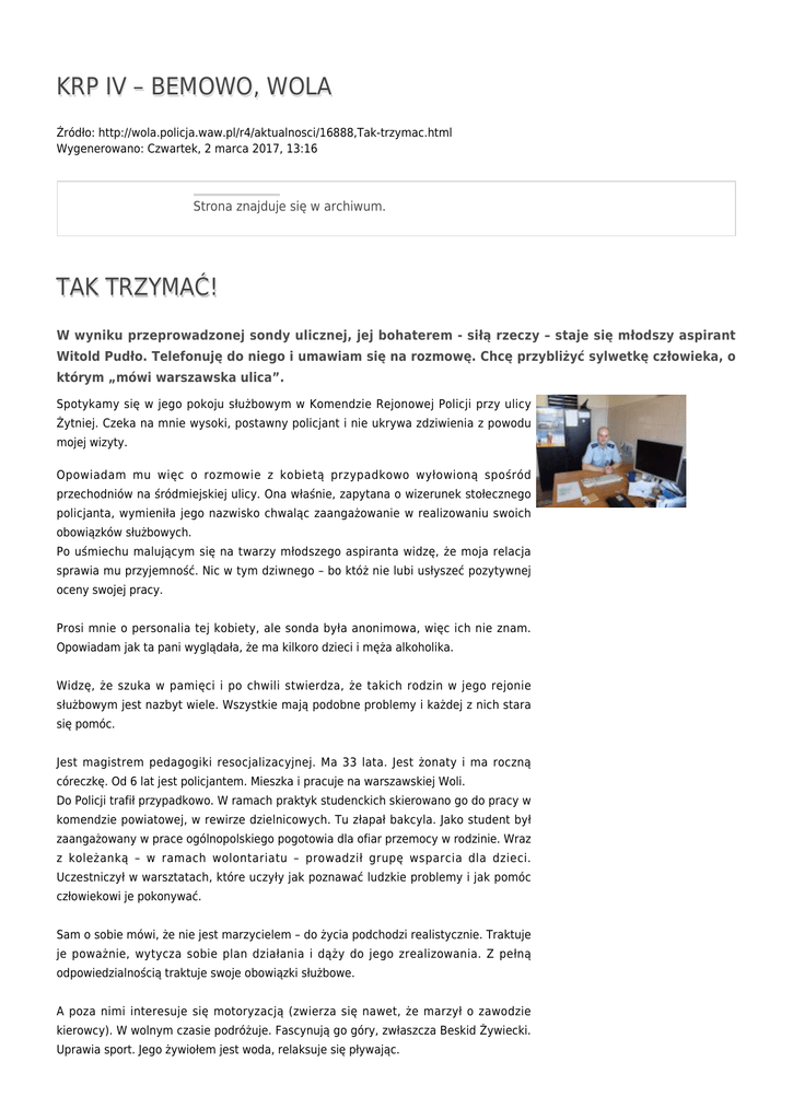 KRP IV – BEMOWO, WOLA Źródło: http://wola.policja.waw.pl/r4/aktualnosci/16888,Tak-trzymac.html Wygenerowano: Czwartek, 2 marca 2017, 13:16 Strona znajduje się w archiwum. TAK TRZYMAĆ! W wyniku przeprowadzonej sondy ulicznej, jej bohaterem - siłą rzeczy – staje się młodszy aspirant Witold Pudło. Telefonuję do niego i umawiam się na rozmowę. Chcę przybliżyć sylwetkę człowieka, o którym „mówi warszawska ulica”. Spotykamy się w jego pokoju służbowym w Komendzie Rejonowej Policji przy ulicy Żytniej. Czeka na mnie wysoki, postawny policjant i nie ukrywa zdziwienia z powodu mojej wizyty. Opowiadam mu więc o rozmowie z kobietą przypadkowo wyłowioną spośród przechodniów na śródmiejskiej ulicy. Ona właśnie, zapytana o wizerunek stołecznego policjanta, wymieniła jego nazwisko chwaląc zaangażowanie w realizowaniu swoich obowiązków służbowych. Po uśmiechu malującym się na twarzy młodszego aspiranta widzę, że moja relacja sprawia mu przyjemność. Nic w tym dziwnego – bo któż nie lubi usłyszeć pozytywnej oceny swojej pracy. Prosi mnie o personalia tej kobiety, ale sonda była anonimowa, więc ich nie znam. Opowiadam jak ta pani wyglądała, że ma kilkoro dzieci i męża alkoholika. Widzę, że szuka w pamięci i po chwili stwierdza, że takich rodzin w jego rejonie służbowym jest nazbyt wiele. Wszystkie mają podobne problemy i każdej z nich stara się pomóc. Jest magistrem pedagogiki resocjalizacyjnej. Ma 33 lata. Jest żonaty i ma roczną córeczkę. Od 6 lat jest policjantem. Mieszka i pracuje na warszawskiej Woli. Do Policji trafił przypadkowo. W ramach praktyk studenckich skierowano go do pracy w komendzie powiatowej, w rewirze dzielnicowych. Tu złapał bakcyla. Jako student był zaangażowany w prace ogólnopolskiego pogotowia dla ofiar przemocy w rodzinie. Wraz z koleżanką – w ramach wolontariatu – prowadził grupę wsparcia dla dzieci. Uczestniczył w warsztatach, które uczyły jak poznawać ludzkie problemy i jak pomóc człowiekowi je pokonywać. Sam o sobie mówi, że nie jest marzycielem – do życia podchodzi realistycznie. Traktuje je poważnie, wytycza sobie plan działania i dąży do jego zrealizowania. Z pełną odpowiedzialnością traktuje swoje obowiązki służbowe. A poza nimi interesuje się motoryzacją (zwierza się nawet, że marzył o zawodzie kierowcy). W wolnym czasie podróżuje. Fascynują go góry, zwłaszcza Beskid Żywiecki. Uprawia sport. Jego żywiołem jest woda, relaksuje się pływając. Zamieniamy jeszcze kilka zdań na temat specyfiki jego pracy, ale nie ona tym razem była przedmiotem rozmowy. Bo jaka ona jest wiemy, ale jak widać wykonywana z pasją jest doceniana przez obywatela. A przecież o to właśnie chodzi. Gratulujemy Panie Aspirancie - TAK TRZYMAĆ! mł. insp. Anita Engelard Ocena: 0/5 (0) Tweetnij
