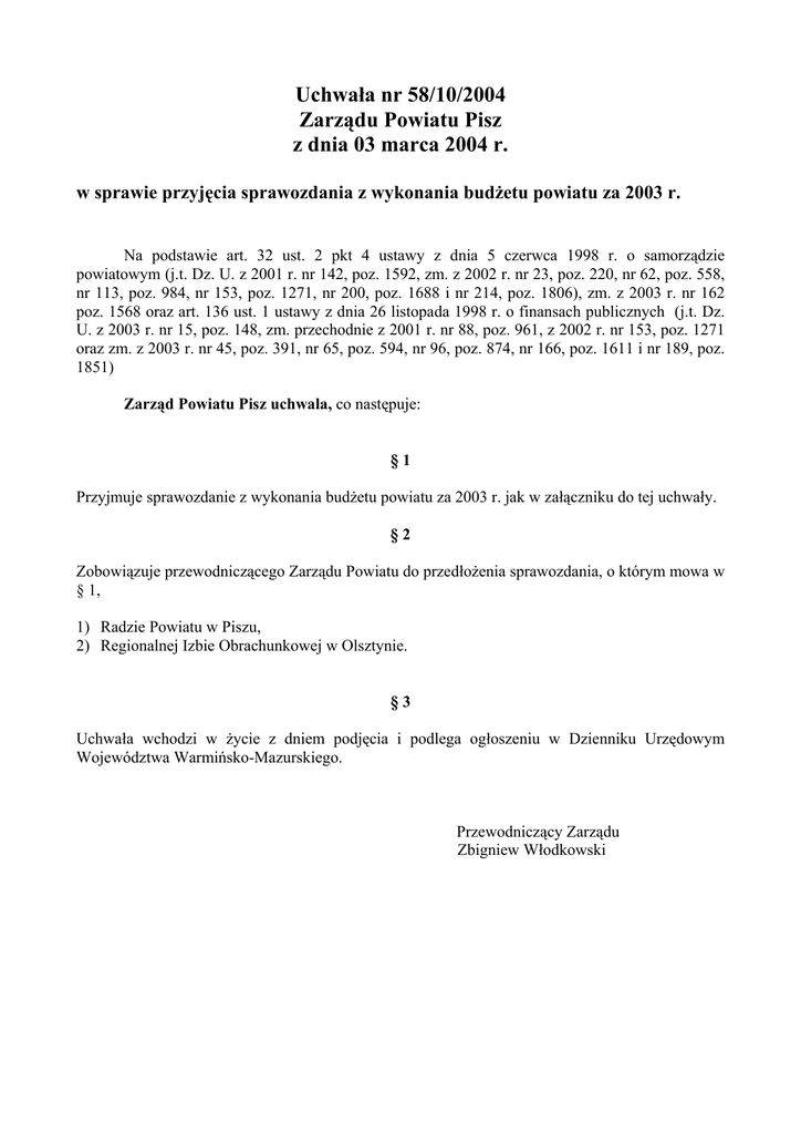 Uchwała nr 58/10/2004 Zarządu Powiatu Pisz z dnia 03 marca 2004 r. w sprawie przyjęcia sprawozdania z wykonania budżetu powiatu za 2003 r. Na podstawie art. 32 ust. 2 pkt 4 ustawy z dnia 5 czerwca 1998 r. o samorządzie powiatowym (j.t. Dz. U. z 2001 r. nr 142, poz. 1592, zm. z 2002 r. nr 23, poz. 220, nr 62, poz. 558, nr 113, poz. 984, nr 153, poz. 1271, nr 200, poz. 1688 i nr 214, poz. 1806), zm. z 2003 r. nr 162 poz. 1568 oraz art. 136 ust. 1 ustawy z dnia 26 listopada 1998 r. o finansach publicznych (j.t. Dz. U. z 2003 r. nr 15, poz. 148, zm. przechodnie z 2001 r. nr 88, poz. 961, z 2002 r. nr 153, poz. 1271 oraz zm. z 2003 r. nr 45, poz. 391, nr 65, poz. 594, nr 96, poz. 874, nr 166, poz. 1611 i nr 189, poz. 1851) Zarząd Powiatu Pisz uchwala, co następuje: §1 Przyjmuje sprawozdanie z wykonania budżetu powiatu za 2003 r. jak w załączniku do tej uchwały. §2 Zobowiązuje przewodniczącego Zarządu Powiatu do przedłożenia sprawozdania, o którym mowa w § 1, 1) Radzie Powiatu w Piszu, 2) Regionalnej Izbie Obrachunkowej w Olsztynie. §3 Uchwała wchodzi w życie z dniem podjęcia i podlega ogłoszeniu w Dzienniku Urzędowym Województwa Warmińsko-Mazurskiego. Przewodniczący Zarządu Zbigniew Włodkowski