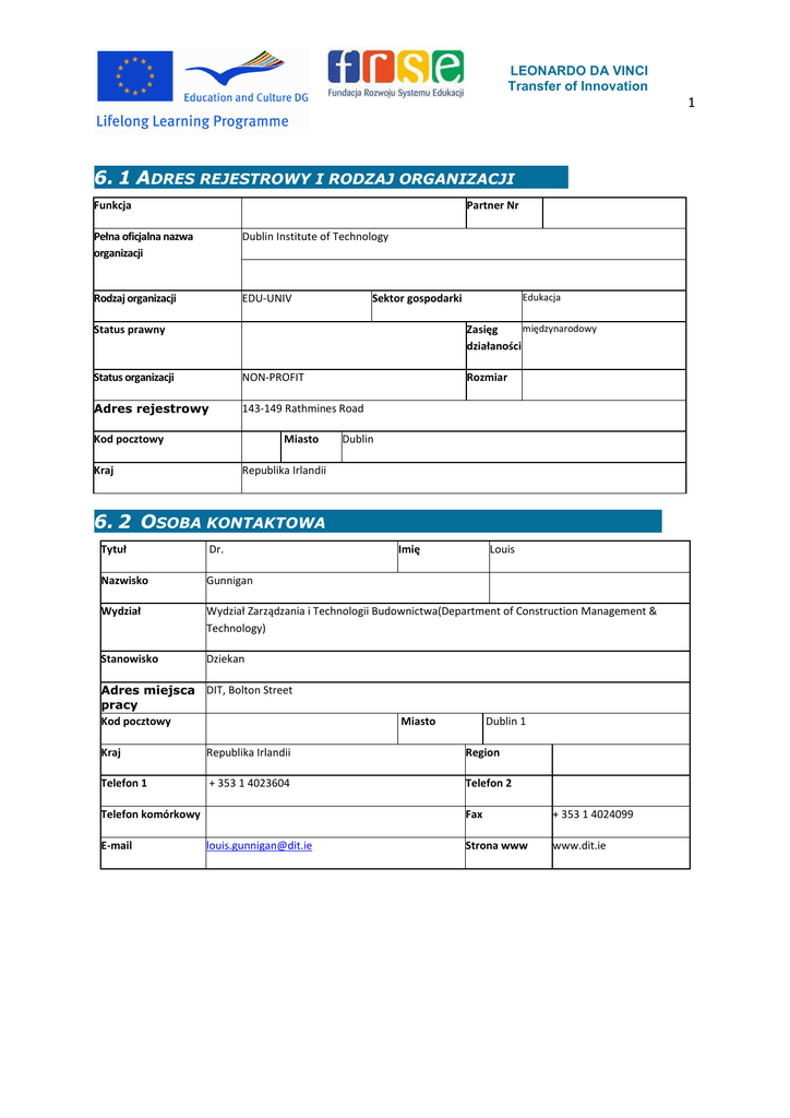 LEONARDO DA VINCI Transfer of Innovation 1 6. 1 ADRES REJESTROWY I RODZAJ ORGANIZACJI Funkcja Partner Nr Pełna oficjalna nazwa organizacji Dublin Institute of Technology Rodzaj organizacji EDU-UNIV Edukacja Sektor gospodarki międzynarodowy Zasięg działaności Status prawny Status organizacji NON-PROFIT Adres rejestrowy 143-149 Rathmines Road Kod pocztowy Miasto Rozmiar Dublin Republika Irlandii Kraj 6. 2 OSOBA KONTAKTOWA Tytuł Dr. Nazwisko Gunnigan Wydział Wydział Zarządzania i Technologii Budownictwa(Department of Construction Management & Technology) Stanowisko Dziekan Adres miejsca DIT, Bolton Street pracy Kod pocztowy Louis Imię Dublin 1 Miasto Kraj Republika Irlandii Region Telefon 1 + 353 1 4023604 Telefon 2 Telefon komórkowy E-mail [email protected] Fax + 353 1 4024099 Strona www www.dit.ie LEONARDO DA VINCI Transfer of Innovation 2 6. 3 OPIS ORGANIZACJI Ogólny opis organizacji: Z ponad 2000 pracowników i prawie 16.000 studentów, Dublin Institute of Technology (DIT) jest instytucją szkolnictwa wyższego o szerokim zakresie działalności, spełniającą na poziomie krajowym i międzynarodowym rolę dostawcy pełnych i częściowych programów z całego spektrum wyższej edukacji, wspartych badaniami i stypendiami w wielu dziedzinach naukowych. Odzwierciedla się to w sześciu wydziałach: Sztuk Stosowanych, Built Environment, Biznesu, Inżynierii, Nauki oraz Turystyki i Żywności. W ciągu ostatnich pięciu lat na Wydziale Butli Environment, w ścisłej współpracy z Wydziałem Biznesu, DIT zbudował znaczący kapitał wiedzy specjalistycznej w obszarze wykorzystania Partnerstwa Publiczno-Prywatnego i obecnie oferuje rosnącą liczbę podyplomowych badań w tej dziedzinie. Pracownicy DIT byli także aktywni w tworzeniu międzynarodowych kontaktów w PPP, co widać w aktywnej współpracy z organami takimi jak Zespół Specjalistów UNECE w dziedzinie PPP w Gospodarkach Przejściowych i Rynkowych. DIT nieustannie poszukuje możliwości poszerzenia swojej działalności związanej z PPP, w czego realizacji pomoże udział w niniejszym projekcie. Rola organizacji uczestniczącej w proponowanym projekcie DIT przeprowadzi analizę aktualnego stanu wiedzy na temat PPP w krajach uczestniczących i przygotuje raport dotyczący PPP w każdym z tych krajów wyszczególniając: • Historię wykorzystania PPP; • Rozmiar obecnego i przyszłego rynku PPP; • Obecne procedury w wykorzystaniu PPP; • Problemy mogące się pojawić w wyniku kontynuacji/zwiększenia wykorzystania PPP. Umiejętności i doświadczenie głównych pracowników biorących udział w projekcie Dr Louis Gunnigan ma tytuł doktora (PhD) Uniwersytetu w Salford, gdzie prowadził badania na temat sposobów bardziej efektywnego wykorzystania PPP w procesie ustalania i realizacji celów projektu. Jest aktywnym członkiem Zespołu Specjalistów UNECE w dziedzinie PPP w Gospodarkach Przejściowych i Rynkowych, w ramach którego stworzył niedawno moduł treningowy Regionalnego i Miejskiego Zarządzania PPP dla federacji Rosyjskiej. Jest także przełożonym grupy doktorantów zajmujących się badaniami nad PPP w DIT. Ray Turner jest wykładowcą Zarządzania w Budownictwie w DIT. Ukończył studia pierwszego stopnia z Inżynierii Cywilnej i zdobył tytuł Magistra Administracji w Biznesie (Zarządzanie Projektami Budowlanymi) w DIT. Obecnie rozpoczyna studia doktoranckie z dziedziny budowania modeli finansowych w PPP na Technical University of Deft. W ramach swoich obowiązków w DIT nadzoruje studenta studiów magisterskich prowadzącego badanie porównawcze między PPP i innymi systemami zamówień publicznych. Poniższa lista obejmuje projekty LDV, w które DIT był zaangażowany w ciągu ostatnich 3 lat. Projekt Opis i osoba kontaktowa PC09028 SENSAS Apprenticeship & Entreprenarial SpirtA.KENNY PK89019 Under the Lifelong Learning Programme M.MURPHY PM02001 Leonardo Proj: Transmission Arts Education -P McDermott PM12004 Leonardo E-CIT - R Tully Umowa Leonardo/Kod projektu n° 2008-117002 LLP-LdV-ToL/2008/806 NL/04/B/F/PP/157401 n° 2005-FI-05-B-F-PP-16060 4