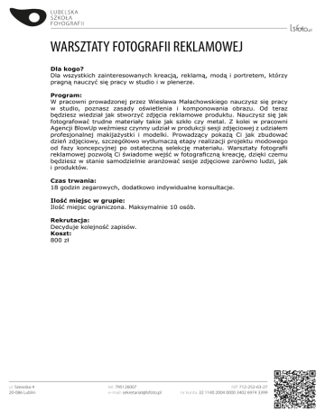 WARSZTATY FOTOGRAFII REKLAMOWEJ Dla kogo? Dla wszystkich zainteresowanych kreacją, reklamą, modą i portretem, którzy pragną nauczyć się pracy w studio i w plenerze. Program: W pracowni prowadzonej przez Wiesława Małachowskiego nauczysz się pracy w studio, poznasz zasady oświetlenia i komponowania obrazu. Od teraz będziesz wiedział jak stworzyć zdjęcia reklamowe produktu. Nauczysz się jak fotografować trudne materiały takie jak szkło czy metal. Z kolei w pracowni Agencji BlowUp weźmiesz czynny udział w produkcji sesji zdjęciowej z udziałem profesjonalnej makijażystki i modelki. Prowadzący pokażą Ci jak zbudować dzień zdjęciowy, szczegółowo wytłumaczą etapy realizacji projektu modowego od fazy koncepcyjnej po ostateczną selekcję materiału. Warsztaty fotografii reklamowej pozwolą Ci świadome wejść w fotograficzną kreację, dzięki czemu będziesz w stanie samodzielnie aranżować sesje zdjęciowe zarówno ludzi, jak i produktów. Czas trwania: 18 godzin zegarowych, dodatkowo indywidualne konsultacje. Ilość miejsc w grupie: Ilość miejsc ograniczona. Maksymalnie 10 osób. Rekrutacja: Decyduje kolejność zapisów. Koszt: 800 zł ul. Szewska 4 20-086 Lublin tel. 795126007 e-mail: [email protected] NIP 712-252-63-27 nr konta: 32 1140 2004 0000 3402 6974 3399 WARSZTATY FOTOGRAFII REKLAMOWEJ Szczegółowy program zajęć: Pracownia fotografii studyjnej: Zajęcia teoretyczne: -- Rodzaje oświetlenia studyjnego. Możliwości i ograniczenia lamp błyskowych -- Końcówki modelujące (softbox, czasza, wrota, plaster miodu, beauty dish i inne), zastawki, ekrany rozpraszające -- Aranżacja planu zdjęciowego -- Podstawowe zasady oświetlania Zajęcia praktyczne: -- Ustawianie świateł w praktyce (światło rysujące, wypełniające, kontrowe) -- Studium martwej natury -- Fotografia reklamowa przedmiotu a klasyczna martwa natura – sposoby ukazania, wydobycie walorów, gra światłem -- Packshoty, zdjęcia z użyciem namiotu bezcieniowego -- Makrofotografia przedmiotu -- Podstawy klasycznego portretu Pracownia mody i portretu: Zajęcia teoretyczne: -- Przygotowanie do świadomego fotografowania postaci -- Wyczucie estetyczne na przykładzie mistrzów fotografii -- Różnice i podobieństwa między fotografią mody a fotografią portretową -- Sposób organizacji własnej sesji zdjęciowej – omówienie poszczególnych etapów tworzenia fotografii od zarysu koncepcji przez organizację dnia zdjęciowego po postprodukcję fotografii -- Rynek światowej fotografii fashion Zajęcia praktyczne -- Całodniowa sesja zdjęciowa z udziałem modela / modelki w studio fotograficznym lub w plenerze -- Znaczenie i rodzaje makijażu w fotografii -- Stylizacja w fotografii mody -- Sposoby pracy z modelem / modelką -- Omówienie wykonanych prac -- Wstępna selekcja i obróbka materiału ul. Szewska 4 20-086 Lublin tel. 795126007 e-mail: [email protected] NIP 712-252-63-27 nr konta: 32 1140 2004 0000 3402 6974 3399