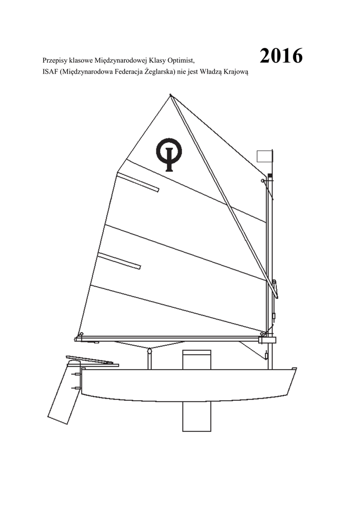 Przepisy klasowe Międzynarodowej Klasy Optimist, ISAF (Międzynarodowa Federacja Żeglarska) nie jest Władzą Krajową 2016 Spis Treści 1. ZASADY OGÓLNE 2. ADMINISTROWANIE 2.1 Język angielski 2.2 Producenci 2.3 Międzynarodowa opłata klasowa 2.4 Certyfikat pomiaru i rejestracji 2.5 Pomiar 2.6 Instrukcje pomiarowe 2.7 Znaki identyfikacyjne 2.8 Reklama 3. PRZEPISY KONSTRUKCYJNE I POMIAROWE 3.1 Zasady ogólne 3.2 Kadłub 3.2.1 Materiały - Włókno szklane (GRP) 3.2.2 Przepisy pomiaru kadłuba 3.2.3 Szczegóły konstrukcji kadłuba – Z włókna szklanego GRP 3.2.4 Szczegóły konstrukcji kadłuba – Drewniany i drewno/epoksydowy (Zał. A) 3.2.5 Nie używany 3.2.6 Okucia 3.2.7 Pływalność 3.2.8 Ciężar 3.3 Miecz 3.4 Ster i rumpel 3.5 Drzewca 3.5.2 Mast 3.5.3 Bom 3.5.4 Rozprze 3.5.5 Olinowanie ruchome 4. PRZEPISY DODATKOWE 5. (zapasowy numer przepisu) 6. ŻAGIEL 6.1 Zasady ogólne 6.2 Grot 6.3 (zapasowy numer przepisu) 6.4 (zapasowy numer przepisu) 6.5 Znak klasowy, litery kraju, numery na żaglu i opaska pomiarowa liku przedniego 6.6 Dodatkowe przepisy żagla Załącznik .A Przepisy klasowe specyficzne dla kadłubów drewnianych i drewno/epoksyd PLANY: Spis aktualnych planów oficjalnych 1. ZASADY OGÓLNE 1.1 Celem niniejszej klasy jest udostępnienie młodym ludziom żeglowania regatowego przy niewielkich kosztach. 1.2 Klasa Optimist jest Monotypową Klasą Mieczową. Z wyjątkiem gdy niniejsze przepisy wyraźnie dopuszczają zmiany, łodzie tej klasy muszą być jednakowe w zakresie kształtu kadłuba, konstrukcji, ciężaru i jego rozkładu, olinowania, drzewc i planu ożaglowania Uwaga: Przy podejmowaniu decyzji, czy jakiś szczegół jest dozwolony należy zauważyć, że w klasie monotypowej, jeśli przepisy nie stanowią wyraźnie, że jakieś rozwiązanie jest dozwolone, należy przyjąć, że jest zabronione. 1.3 Niniejsze przepisy są uzupełnione przez plany, formularz pomiarowy i rysunki pomiarowe. Każdy wniosek o interpretację i odpowiedź na taki wniosek muszą być dokonane zgodnie z aktualnymi regulacjami ISAF. 1.4 W przypadku rozbieżności pomiędzy niniejszymi przepisami a formularzem pomiarowym i/albo planami, sprawa musi być przedłożona ISAF. 2. ADMINISTROWANIE 2.1 Język angielski 2.1.1 Oficjalnym językiem klasy jest angielski i w przypadku sporu na temat sformułowań decyduje tekst angielski. 2.1.2 Słowo ”musi” jest zobowiązujące, słowo ”może” jest przyzwalające. 2.1.3 Wszędzie, gdzie w niniejszych przepisach pojawia się określenie ”przepisy klasowe” należy rozumieć, że obejmują one plany, rysunki oraz formularze pomiarowe. 2.1.4 ”Narodowy Związek Klasy” oznacza Związek Klasy Optimist danego kraju. 2.2 Producenci 2.2.1 Optimist może być budowany przez dowolnego producenta zawodowego lub amatora. 2.2.2 Producenci zawodowi odpowiadają za dostarczenie łodzi zgodnych z przepisami klasowymi. Producent musi poprawić lub zamienić łódź na swój koszt, jeżeli nie przejdzie pomiarów z wynikiem pozytywnym w wyniku niedopatrzenia lub błędu producenta, pod warunkiem, że jest ona przedstawiona do pomiarów nie później niż 12 miesięcy od daty jej nabycia. 2.2.3 Producenci zestawów do montażu lub elementów łodzi są odpowiedzialni za dostarczanie części, które po złożeniu zgodnie z instrukcją producenta, (jeśli taka istnieje) dają w wyniku łodzie odpowiadające przepisom klasowym. Producent takiego zestawu lub elementów, któremu udowodniono nie spełnienie powyższego wymagania musi, na swój koszt, dokonać wymiany nieprawidłowych elementów zestawu, pod warunkiem, że producent został powiadomiony o błędzie nie później niż dwanaście miesięcy od daty nabycia. 2.2.4 Producent musi przedłożyć, wraz z każdym kadłubem, pisemną deklarację stwierdzającą, że kadłub jest zgodny z odpowiednimi przepisami klasowymi. 2.3 Międzynarodowa opłata klasowa 2.3.1 Wysokość Międzynarodowej Opłaty Licencyjnej określana jest przez ISAF w konsultacji z IODA. Zarząd IODA może zmienić tą wysokość w konsultacji z ISAF. 2.3.2 Międzynarodowa opłata licencyjna musi być wniesiona przez budowniczego za każdy kadłub, gdy tylko budowa lub formowanie zostanie rozpoczęte. W przypadku kadłubów z drewna lub drewniano-epoksydowych plakietka musi być dostarczona podczas pomiaru. 2.3.3 Budowniczy musi zakupić plakietkę budowlaną i Książkę Rejestracji (a) dla kadłubów z włókna szklanego (GRP) – od IODA (b) dla kadłubów drewnianych i drewniano-epoksydowych – od IODA lub od Narodowego Związku Optimista. 2.3.4 (a) IODA odpowiada z ramienia ISAF za zbieranie Międzynarodowych Opłat Licencyjnych. (b) IODA zakupuje od ISAF plakietki budowlane, chyba, że zapadną inne uzgodnienia z ISAF. ( c) IODA lub Narodowy Związek sprzedaje plakietki budowlane budowniczemu. Każda plakietka musi być zawsze sprzedawana wraz z oficjalnym pokwitowaniem wniesienia opłaty licencyjnej oraz z formularzem deklaracji budowniczego. Pokwitowanie wniesienia opłaty licencyjnej musi być przesłane do właściwej Władzy Narodowej przy zgłoszeniu o wydanie numeru na żagiel. 2.3.5 Za każdą wniesioną Opłatę Licencyjną IODA lub Narodowy Związek Klasy Optimist musi przekazać deklarację budowniczego, pokwitowanie wniesienia opłaty licencyjnej oraz plakietkę ISAF, które budowniczy musi dostarczyć wraz z kadłubem właścicielowi. Oświadczenia budowniczego i pokwitowanie za Międzynarodową Opłatę Licencyjną są ważne tylko, gdy zostały wystawione na oficjalnych formularzach wystawionych przez IODA. Pokwitowanie opłaty licencyjnej oraz deklaracja budowniczego są częściami Książki Rejestracji. 2.4 Certyfikat pomiaru i rejestracji 2.4.1 Żadna łódź nie może startować w regatach klasy, jeżeli nie ma ważnego certyfikatu pomiarowego. 2.4.2 Każda Władza Narodowa wydaje numery na żagiel kolejno, przy czym numer musi być poprzedzony przez litery przynależności państwowej. Numeracja moż