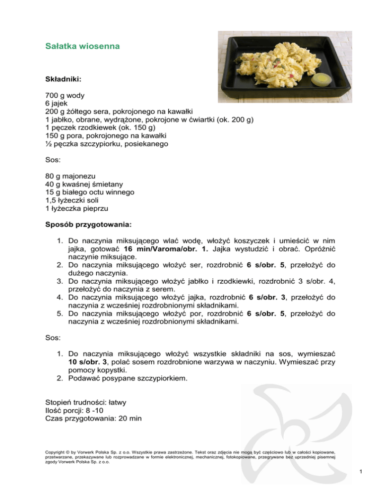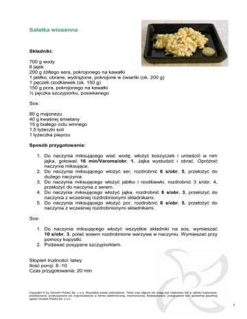 Sałatka wiosenna Składniki: 700 g wody 6 jajek 200 g żółtego sera, pokrojonego na kawałki 1 jabłko, obrane, wydrążone, pokrojone w ćwiartki (ok. 200 g) 1 pęczek rzodkiewek (ok. 150 g) 150 g pora, pokrojonego na kawałki ½ pęczka szczypiorku, posiekanego Sos: 80 g majonezu 40 g kwaśnej śmietany 15 g białego octu winnego 1,5 łyżeczki soli 1 łyżeczka pieprzu Sposób przygotowania: 1. Do naczynia miksującego wlać wodę, włożyć koszyczek i umieścić w nim jajka, gotować 16 min/Varoma/obr. 1. Jajka wystudzić i obrać. Opróżnić naczynie miksujące. 2. Do naczynia miksującego włożyć ser, rozdrobnić 6 s/obr. 5, przełożyć do dużego naczynia. 3. Do naczynia miksującego włożyć jabłko i rzodkiewki, rozdrobnić 3 s/obr. 4, przełożyć do naczynia z serem. 4. Do naczynia miksującego włożyć jajka, rozdrobnić 6 s/obr. 3, przełożyć do naczynia z wcześniej rozdrobnionymi składnikami. 5. Do naczynia miksującego włożyć por, rozdrobnić 6 s/obr. 5, przełożyć do naczynia z wcześniej rozdrobnionymi składnikami. Sos: 1. Do naczynia miksującego włożyć wszystkie składniki na sos, wymieszać 10 s/obr. 3, polać sosem rozdrobnione warzywa w naczyniu. Wymieszać przy pomocy kopystki. 2. Podawać posypane szczypiorkiem. Stopień trudności: łatwy Ilość porcji: 8 -10 Czas przygotowania: 20 min Copyright © by Vorwerk Polska Sp. z o.o. Wszystkie prawa zastrzeżone. Tekst oraz zdjęcia nie mogą być częściowo lub w całości kopiowane, przetwarzane, przekazywane lub rozprowadzane w formie elektronicznej, mechanicznej, fotokopiowane, przegrywane bez uprzedniej pisemnej zgody Vorwerk Polska Sp. z o.o. 1 Koktajl gruszkowo- cynamonowy Składniki: 1 dojrzała gruszka (ok. 150 g) 20 g cukru 1 łyżeczka cukru wanilinowego 15 g soku z cytryny 100 g wody mineralnej, niegazowanej 40 g słodkiej śmietany 18% 1 łyżeczka mielonego cynamonu 250 g mleka Sposób przygotowania: 1. Do naczynia miksującego włożyć gruszkę, cukier, cukier wanilinowy, sok z cytryny i wodę, zmiksować 40 s/obr. 8. 2. Dodać śmietanę, cynamon i mleko, wymieszać 20 s/obr. 6. Aby otrzymać większą ilość koktajlu należy podwoić ilość składników i wydłużyć czas miksowania w punkcie pierwszym o 30 s. Stopień trudności: łatwy Ilość porcji: 2 szklanki Czas przygotowania: 3 min Copyright © by Vorwerk Polska Sp. z o.o. Wszystkie prawa zastrzeżone. Tekst oraz zdjęcia nie mogą być częściowo lub w całości kopiowane, przetwarzane, przekazywane lub rozprowadzane w formie elektronicznej, mechanicznej, fotokopiowane, przegrywane bez uprzedniej pisemnej zgody Vorwerk Polska Sp. z o.o. 2 Jajka z pikantnym farszem Składniki: 700 g wody 6 jajek 1 awokado, duże, dojrzałe 1 limonka 1 czerwona cebula, przekrojona na połówki (ok. 60 g) 1 mała papryczka chilli, przekrojona na połówki, bez pestek kilka gałązek kolendry 1 łyżka oleju sól i pieprz do smaku Sposób wykonania: 1. Do naczynia miksującego wlać wodę, włożyć koszyczek i umieścić w nim jajka, gotować 16 min/Varoma/obr. 1. 2. Jajka wystudzić, obrać, przekroić wzdłuż na pół i wydrążyć żółtka. 3. Awokado przekroić na pół usunąć pestkę, wydrążyć miąższ i skropić go sokiem z limonki. 4. Do suchego naczynia miksującego włożyć cebulę, chilli i kolendrę, rozdrobnić 3 s/obr. 5. 5. Dodać awokado, żółtka i olej zmiksować 10 s/obr. 4, kopystką zgarnąć wszystkie składniki ze ścianek naczynia, powtórzyć czynność miksowania. 6. Doprawić solą i pieprzem. Nafaszerować jajka pastą, udekorować kawałkami limonki i listkami kolendry. Stopień trudności: łatwy Ilość porcji: 3 Czas przygotowania: 20 min Copyright © by Vorwerk Polska Sp. z o.o. Wszystkie prawa zastrzeżone. Tekst oraz zdjęcia nie mogą być częściowo lub w całości kopiowane, przetwarzane, przekazywane lub rozprowadzane w formie elektronicznej, mechanicznej, fotokopiowane, przegrywane bez uprzedniej pisemnej zgody Vorwerk Polska Sp. z o.o. 3 Pudding z orzechów włoskich Składniki: 200 g orzechów włoskich, wyłuskanych 180 g cukru 25 g masła 2 jajka 500 g mleka 70 g kaszy manny plus 1 łyżeczka skórka otarta z jednej cytryny 1 łyżeczka cukru wanilinowego Sposób przygotowania: 1. Do naczynia miksującego włożyć orzechy, rozdrobnić 2 s/obr.4. 2. Na patelni rozgrzać masło, dodać 80 g cukru i rozdrobnione orzechy, kandyzować na małym ogniu, przez kilka minut, (aż cukier zacznie się kleić do orzechów). 3. Umyć i osuszyć naczynie miksujące. 4. Białka oddzielić od żółtek i umieścić w naczyniu miksującym, ubić na sztywną pianę 2 min 30 s/obr. 3, przełożyć do innego naczynia. 5. Do naczynia miksującego wlać mleko, dodać kaszę manną, pozostały cukier, skórkę otartą z cytryny i cukier wanilinowy gotować 9 min/100ºC/obr. 2. 6. Żółtka wymieszać z jedną łyżeczką kaszki manny i dodać razem z połową orzechów do naczynia miksującego wymieszać 10 s/ /obr. 3. 7. Dodać pianę z białek, lekko wymieszać kopystką. Przełożyć do pucharków, posypać pozostałymi orzechami. Informacja: Pudding można podawać na ciepło i na zimno, jednak najlepiej smakuje bezpośrednio po przygotowaniu. Stopień trudności: łatwy Ilość porcji: 4 Czas przygotowania: 30 min Copyright © by Vorwerk Polska Sp. z o.o. Wszystkie prawa zastrzeżone. Tekst oraz zdjęcia nie mogą być częściowo lub w całości kopiowane, przetwarzane, przekazywane lub rozprowadzane w formie elektronicznej, mechanicznej, fotokopiowane, przegrywane bez uprzedniej pisemnej zgody Vorwerk Polska Sp. z o.o. 4 Klopsy po myśliwsku Składniki: Farsz: 50 g marchewki 100 g cebuli 150 g ogórków kiszonego sól i pieprz do smaku Klopsy i dodatki: 300 g wołowiny, pokrojonej na kawałki ¼ łyżeczki soli 2 szczypty pieprzu 1000 g wody 1 kostka bulionu wołowego 150 g ryżu 1 brokuł Sos: 100 g wywaru z gotowania 50g czerwonego wytrawnego wina 50 g musztardy sarepskiej 20 g mąki pszennej 60 g