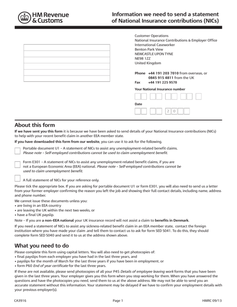 Information we need to send a statement of National Insurance contributions (NICs) Customer Operations National Insurance Contributions & Employer Office International Caseworker Benton Park View NEWCASTLE UPON TYNE NE98 1ZZ United Kingdom Phone +44 191 203 7010 from overseas, or 0845 915 4811 from the UK Fax +44 191 225 9570 Your National Insurance number Date 2 0 About this form If we have sent you this form it is because we have been asked to send details of your National Insurance contributions (NICs) to help with your recent benefit claim in another EEA member state. If you have downloaded this form from our website, you can use it to ask for the following. Portable document U1 – A statement of NICs to assist any unemployment-related benefit claims. Please note – Self-employed contributions cannot be used to claim unemployment benefit. Form E301 – A statement of NICs to assist any unemployment-related benefit claims, if you are not a European Economic Area (EEA) national. Please note – Self-employed contributions cannot be used to claim unemployment benefit. A full statement of NICs for your reference only. Please tick the appropriate box. If you are asking for portable document U1 or form E301, you will also need to send us a letter from your former employer confirming the reason you left the job and showing their full contact details, including name, address and phone number. We cannot issue these documents unless you: • are living in an EEA country • are leaving the UK within the next two weeks, or • have a final UK payslip. Note – If you are a non–EEA national your UK insurance record will not assist a claim to benefits in Denmark. If you need a statement of NICs to assist any sickness-related benefit claim in an EEA member state, contact the foreign institution where you have made your claim .and tell them to contact us to ask for form SED S041. To do this, they should complete form SED S040 and send it to us at the address shown above. What you need to do Please complete this form using capital letters. You will also need to get photocopies of: • final payslips from each employer you have had in the last three years, and • payslips for the month of March for the last three years if you have been in employment, or • form P60 End of year certificate for the last three years. If these are not available, please send photocopies of all your P45 Details of employee leaving work forms that you have been given in the last three years. Your employer gives you this form when you stop working for them. When you have answered the questions and have the photocopies you need, send them to us at the above address. We may not be able to send you an accurate statement without this information. Your statement may be delayed if we have to confirm your employment details with your previous employer(s). CA3916 Page 1 HMRC 09/13 1 – About you 3 – Your time in the UK Title Put Mr, Mrs, Miss, Ms or other title What date did you first arrive in the UK to live? DD MM YYYY Surname or family name What was the last date you left the UK to live in an EEA country? DD MM YYYY First names Did you live in the UK continuously between these dates? Answer ‘Yes’ if you were abroad for short periods, for example, for a holiday. Any other surname or family name that you have used Yes No If ‘No’ please give the dates you were in the UK below. From DD MM YYYY Gender put ‘X’ in one box Male Female To DD MM YYYY Your date of birth DD MM YYYY From DD MM YYYY Nationality To DD MM YYYY Daytime phone number (including dialling code) From DD MM YYYY Your National Insurance number To DD MM YYYY Are you a national of a European Economic Area (EEA) country? Put ‘X’ in one box Yes If you need more space, please use the ’More information’ space on page 4. No 2 – Where you live 4 – Your last UK employer Country of residence after leaving the UK Employer’s name and address Address in that country Your employer’s tax district and PAYE reference number You can find these on your payslip, form P45 or P60 that your employer gave you when you stopped working for them / Page 2 Your last UK employer Enter the Jobcentre Plus phone number if you know it Continued Are you applying for a statement of National Insurance contributions to claim unemployment benefit abroad? Yes Start date of your Jobseeker’s Allowance claim DD MM YYYY No If ‘No’ go to part 5 – ‘Your UK employers’ If ‘Yes’ answer the following questions 5 – Your UK employers Type of employment For example catering, agriculture, health care Please give us details of any other UK employment that you have had in the last three years. If you need more space, please use the ‘More information’ box on page 4. Your job title If you don’t have a UK National Insurance number we will need these details from the date you arrived in the UK until the date you left. Date you started working for this employer DD MM YYYY Employer’s name and address Date you stopped working for this employer DD MM YYYY How were you paid? Weekly Monthly What was your average weekly or monthly pay? Employer’s tax district and PAYE reference number / Number of hours worked during this period Date you started working for this employer DD MM YYYY Number of days worked during this period Date you stopped working for this employer DD MM YYYY Why did you leave this job? Dismissal Resignation Expiry of contract Redundancy 6 – Your UK self-employment Have you been self-employed in the UK? Termination of contract by mutual consent Yes Did you claim Jobseeker’s Allowance between the date you left this job and the date you left the UK? Yes No If ‘Yes’ please give the dates you were self-employed in the UK, below. From DD MM YYYY No If ‘Yes’ tell us the name and address of the Jobcentre Plus office that you claimed from. To DD MM YYYY From DD MM YYYY To DD MM YYYY Page 3 7 – If you don’t have a UK National Insurance number Please 