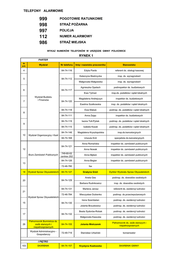 TELEFONY ALARMOWE 999 998 997 112 986 POGOTOWIE RATUNKOWE STRAŻ POŻARNA POLICJA NUMER ALARMOWY STRAŻ MIEJSKA WYKAZ NUMERÓW TELEFONÓW W URZĘDZIE GMINY POLKOWICE RYNEK 1 PARTER Nr pok. Wydział Nr telefonu Imię i nazwisko pracownika Stanowisko 4 84-74-116 Edyta Pardo referent ds. obsługi kasowej Katarzyna Biedrzycka insp. ds. wynagrodzeń 5 84-74-112 Małgorzata Małgowska insp. ds. wynagrodzeń Agnieszka Opalach podinspektor ds. budżetowych Ewa Tylman insp.ds. podatków i opłat lokalnych Magdalena Andrejczyn inspektor ds. budżetowych Ewelina Szatkowska insp. ds. podatków i opłat lokalnych 84-74-118 Ewa Makaś podinsp. ds. podatków i opłat lokalnych 84-74-111 Anna Zając inspektor ds. budżetowych 84-74-119 Iwona Toll-Pytiak podinsp. ds. podatków i opłat lokalnych 84-74-115 Izabela Kozak podinsp. ds. podatków i opłat lokalnych 84-74-146 Magdalena Krysztopolska insp.ds.kancelaryjnych 84-74-168 Urszula Król specjalista ds.kancelaryjnych Anna Romańska inspektor ds. zamówień publicznych Anna Nowak inspektor ds. zamówień publicznych 749-60-02 centrex 202 Anna Bęben inspektor ds. zamówień publicznych 84-74-126 Anna Begier inspektor ds. zamówień publicznych 72-46-780 fax 84-74-127 Grażyna Greń Dyrktor Wydziału Spraw Obywatelskich Aneta Ges podinsp. ds. dowodów osobistych Barbara Rudnikowicz insp. ds. dowodów osobistych 84-74-131 Marlena Jarosz referentt ds. ewidencji ludności 72-46-784 Mieczysław Dubienko podinsp. ds.przeciwpożarowych Irena Szambelan podinsp. ds. ewidencji ludności Jolanta Brzustowicz podinsp. ds. ewidencji ludności Beata Sydorów-Robak podinsp. ds. ewidencji ludności Małgorzata Kaszuba podinsp. ds. ewidencji ludności 6 7 84-74-117 Wydział Budżetu i Finansów 84-74-120 8 9 10 Wydział Organizacyjny i Kadr 84-74-121 12 Biuro Zamówień Publicznych 13 18 Wydział Spraw Obywatelskich 84-74-129 20 21 Wydział Spraw Obywatelskich 15 84-74-130 17 26 84-74-132 Pełnomocnik Burmistrza ds. osób starszych i niepełnosprawnych 84-74-155 Jolanta Mielczarek Pełnomocnik ds. osób starszych i niepełnosprawnych Wydział Administracyjno Gospodarczy 72-49-719 Stanisław Urbański konserwator 84-74-157 Krystyna Kozłowska SKARBNIK GMINY I PIĘTRO 103 SKARBNIK 104 Gabinet Burmistrza 84-74-107 Mariola Szymczyk Dyrektor Gabinetu Burmistrza 105 Rzecznik Prasowy 72-49-713 Ewa Szczecińska-Zielińska Rzecznik Prasowy 106 SEKRETARZ GMINY 84-74-107 Krystyna Marków SEKRETARZ GMINY 84-74-107 Renata Hnatyszak specjalista ds. obsługi sekretariatu 107 fax 845-13-64 Justyna Demianowska-Wach 108 Gabinet Burmistrza referent ds. obsługi sekretariatu 84-74-107 Arkadiusz Bloch Z-ca Burmistrza ds. Gospodarczych 109 84-74-107 Renata Dembek Z-ca Burmistrza ds. Społecznych 110 84-74-107 Wiesław Wabik BURMISTRZ 84-74-136 Danuta Krawiec Główny Księgowy 84-74-113 Anna Karwacka inspektor ds. finansowych 84-74-114 Katarzyna Gryś Główny Specjalista ds. finansowych 84-74-138 Barbara Partyka podinsp. ds. budżetowych 84-74-183 Beata Pokora podinsp. ds. budżetowych Barbara Strug inspektor. ds. budżetowych Maria Sienkiewicz podinsp. ds. budżetowych Dorota Burak robotnik gospodarczy / goniec Renata Kozub robotnik gospodarczy / goniec Wioletta Ołdakowska robotnik gospodarczy / goniec 84-74-163 Robert Kurowski Kierownik Biura Zamówień Publicznych Radca Prawny 84-74-163 Jerzy Trzeciak Radca Prawny Jolanta Górna-Kozak Radca Prawny Hadrian Bucyk Radca Prawny 117 Wydział Budżetu i Finansów 118 119 Wydział Budżetu i Finansów 84-74-137 121 122 Wydział Administracyjno Gospodarczy 84-74-158 Gabinet Burmistrza 84-74-164 Paweł Greń inspektor ds. informacji Rafał Jedlecki inspektor ds. komunikacji społecznej 72-49-700 Katarzyna Sputowska - Czarny inspektor ds. komunikacji społecznej 125 84-74-151 Andrzej Zięcina Dyrektor Wydziału Komunikacji Społecznej 126 84-74-187 Marzena Olejnik Pełnomocnik Burmistrza ds. Inwestycji Strategicznych 84-74-159 Artur Stępień insp. ds. zamówień publicznych 84-74-146 Markiewicz Grażyna Renata Ptak Figas Grażyna Lasota Elżbieta dozorcy 84-74-166 Urszula Łażewska Dyrektor Wydziału Inicjatyw Gospodarczych i Rynku Pracy Anna Dziedzic inspektor ds.inicjatyw gospodarczych Marta Czekajło referent ds. inicjatyw gospodarczych 84-74-153 Diana Chylińska inspektor ds. aktywizacji zawodowej 84-74-185 Małgorzata Konieczyńska Dyrektor Wydziału Administracyjno - Gospodarczego 84-74-144 Anna Duszeńko-Nowicka insp. ds.handlu i usług 72-49-717 Agnieszka Komarnicka insp. ds. rozwoju przedsiębiorczości 75-92-096 wew. 196 Tomasz Sawicki Dyrektor Biura Rady Miejskiej 84-74-133 Jolanta Stojek insp. ds. obsługi Rady Miejskiej Dorota Świątek insp. ds. gospodarczych 84-74-156 Elżbieta Lichwa insp. ds. gospodarczych Ryszard Wyraz Inspektor ds. technicznych 84-74-147 123 127 132 Wydział Komunikacji Społecznej Biuro Zamówień Publicznych portiernia II PIĘTRO 205 204 Wydział Inicjatyw Gospodarczych i Rynku Pracy 206 Wydział Administracyjno Gospodarczy 203 Wydział Inicjatyw Gospodarczych i Rynku Pracy 209 Biuro Rady Miejskiej 208 213 Wydział Administracyjno Gospodarczy 84-74-124 759-20-20 wew.148 214 Joanna Kula specjalista ds. obsługi Rady Miejskiej Sandra Woźniak mł. referent ds. jednostek pomocniczych Natalia Boroń referent ds. jednostek pomocniczych Elżbieta Alt Dyrektor Wydziału Informatyki Robert Wojtowicz insp.ds. informatyzacji Piotr Gubar podinspektor ds. informatyzacji Marcin Szydłowski insp. ds. informatyzacji Grzegorz Kardyś Kierownik Gminnego Centrum Zarządzania Kryzysowego Marek Zalewski podinspektor ds. zarządzania kryzysowego Józef Sobiesiak insp. ds. obrony cywilnej Grażyna Demianowska insp. ds. świadczeń i OSP Agnieszka Łuczak inspektor ds. wojskowych Marzenna Kołodyńska insp. ds. pracowniczych Joanna Barczuk podinsp. ds. pracowniczych 84-74-189 Lilla Żelem Dyrektor Wydziału Organizacyjnego i Kadr 8474135 Danuta Turczynowska insp. ds. szkoleń 84-74-134 Jolanta Szpilska inspektor ds. organizacyjnyc