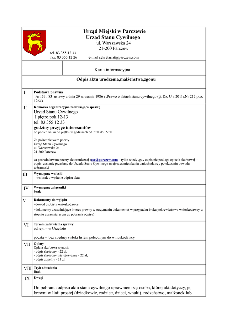 Urząd Miejski w Parczewie Urząd Stanu Cywilnego ul. Warszawska 24 21-200 Parczew tel. 83 355 12 33 fax. 83 355 12 26 e-mail [email protected] Karta informacyjna Odpis aktu urodzenia,małŜeństwa,zgonu I Podstawa prawna Art.79 i 83 ustawy z dnia 29 września 1986 r .Prawo o aktach stanu cywilnego (tj. Dz. U z 2011r.Nr 212,poz. 1264) II Komórka organizacyjna załatwiająca sprawę Urząd Stanu Cywilnego I piętro,pok.12-13 tel. 83 355 12 33 godziny przyjęć interesantów od poniedziałku do piątku w godzinach od 7:30 do 15:30 Za pośrednictwem poczty Urząd Stanu Cywilnego ul. Warszawska 24 21-200 Parczew za pośrednictwem poczty elektronicznej :[email protected] – tylko wtedy ,gdy odpis nie podlega opłacie skarbowej – odpis zostanie przesłany do Urzędu Stanu Cywilnego miejsca zamieszkania wnioskodawcy po okazaniu dowodu toŜsamości III IV V Wymagane wnioski wniosek o wydanie odpisu aktu Wymagane załączniki brak Dokumenty do wglądu –dowód osobisty wnioskodawcy –dokumenty uzasadniające interes prawny w otrzymaniu dokumentu( w przypadku braku pokrewieństwa wnioskodawcy w stopniu uprawniającym do pobrania odpisu) VI Termin załatwienia sprawy od ręki – w Urzędzie pocztą – bez zbędnej zwłoki listem poleconym do wnioskodawcy VII Opłaty Opłata skarbowa wynosi: - odpis skrócony - 22 zł, - odpis skrócony wielojęzyczny - 22 zł, - odpis zupełny - 33 zł. VIII Tryb odwołania Brak IX Uwagi Do pobrania odpisu aktu stanu cywilnego uprawnieni są: osoba, której akt dotyczy, jej krewni w linii prostej (dziadkowie, rodzice, dzieci, wnuki), rodzeństwo, małŜonek lub przedstawiciel ustawowy. Inne osoby i instytucje - po wykazaniu interesu prawnego w otrzymaniu dokumentu (wezwanie sądu, umowa, akt notarialny, wypis z księgi wieczystej itp.). Opracował ElŜbieta Lipnicka Sprawdził Agnieszka Hawryluk Zatwierdził Agnieszka Hawryluk